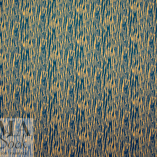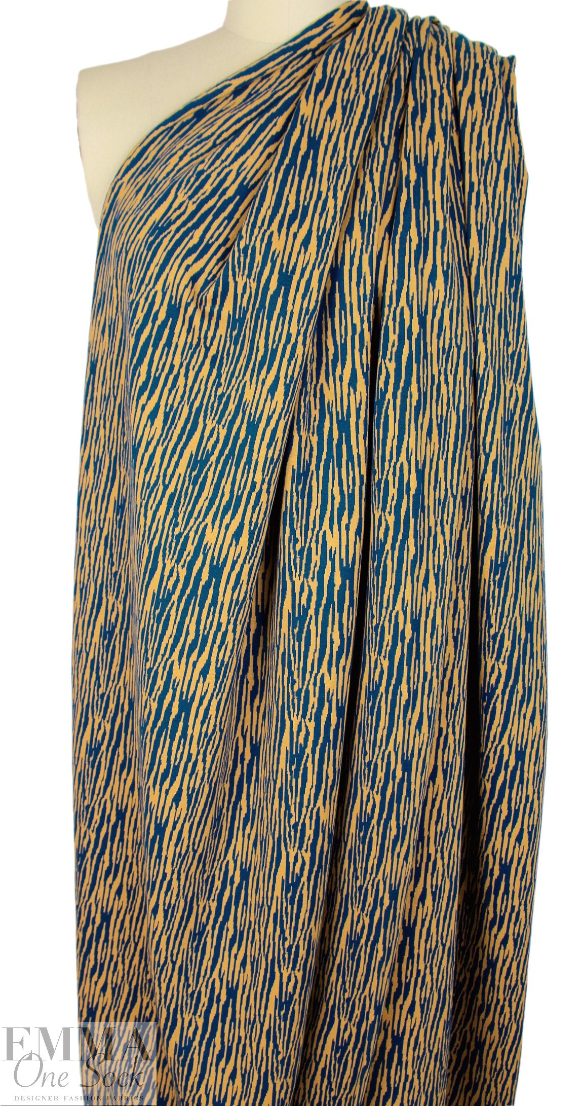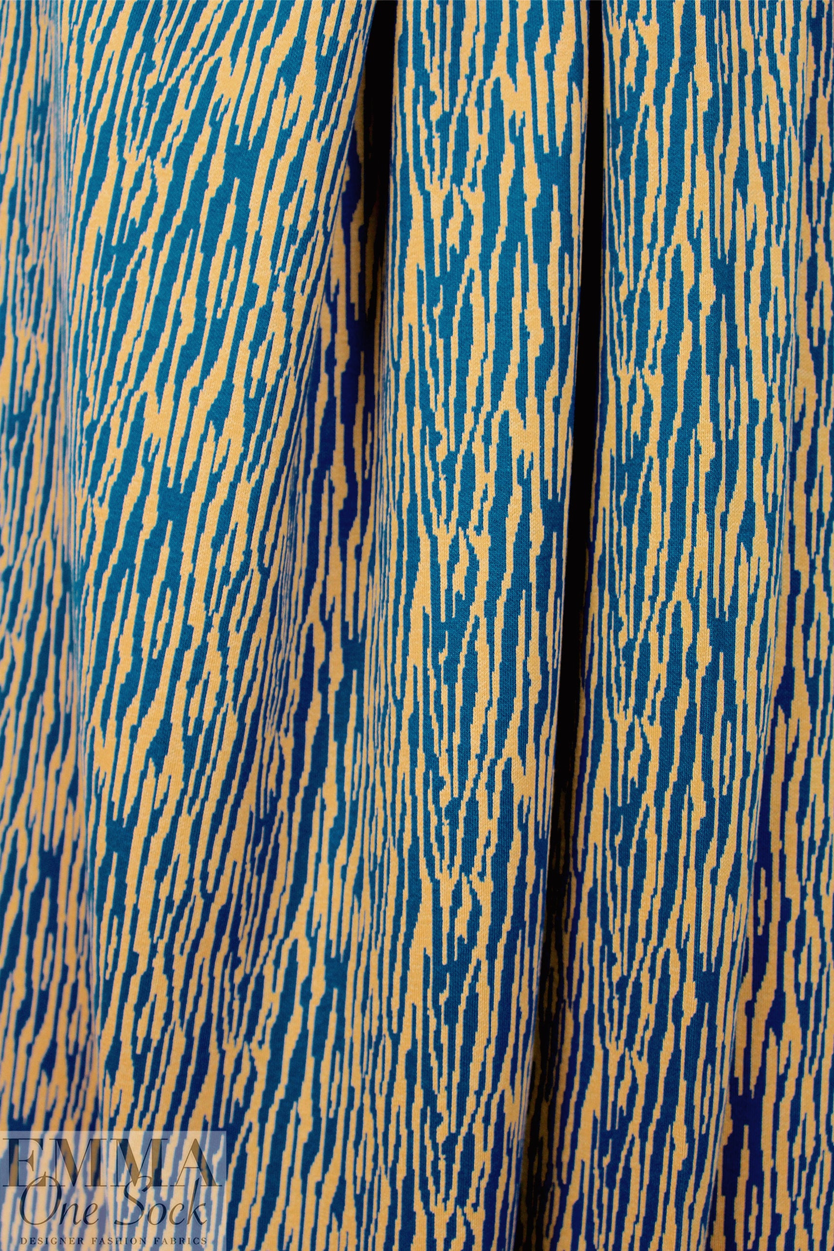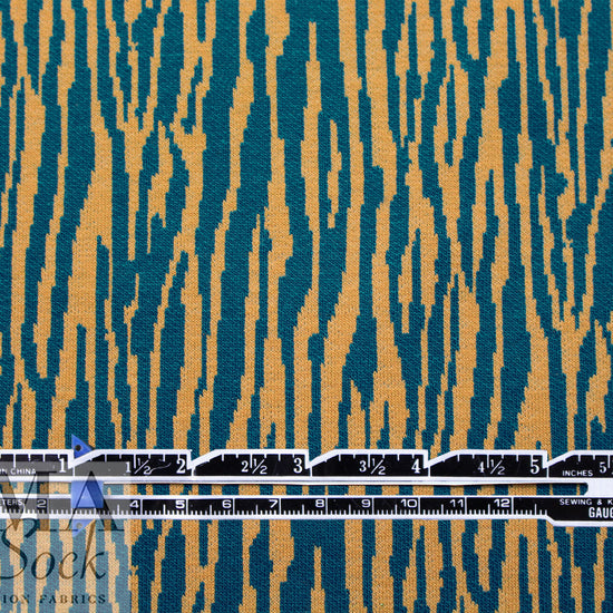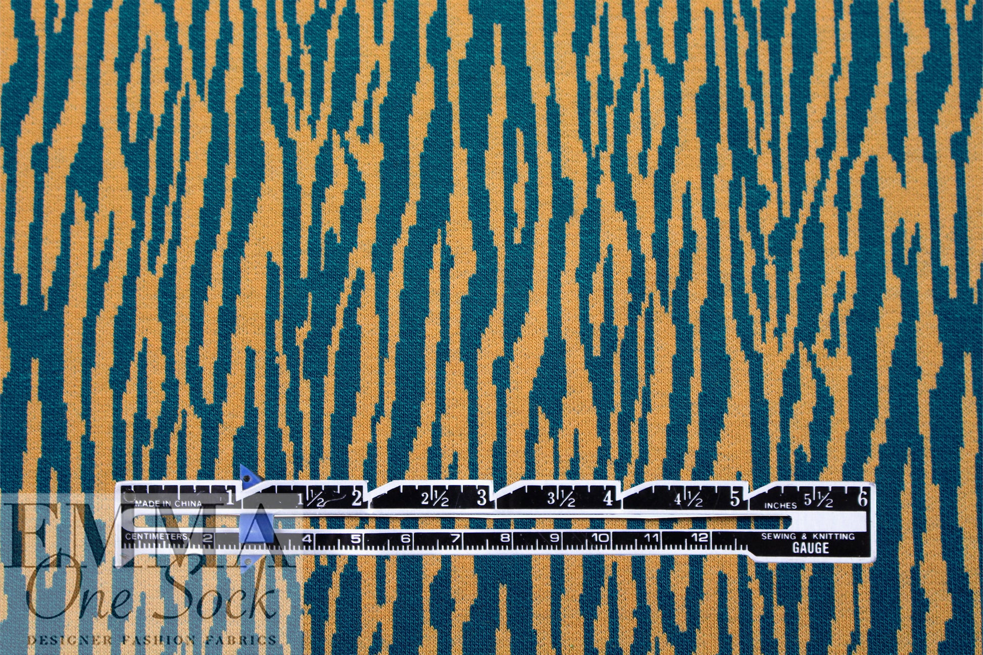From a wonderful supplier of organic fabrics, this beauty is an organic cotton/elastane two-tone jacquard sweater knit with a lovely stylized bark design (yarn-dyed, not a print). Produced in Turkey for a Danish company, the fabric is Oeko-Tex and GOTS certified, assuring organic fibers and non-toxic chemicals and dyes. It is medium weight and opaque with about 40% widthwise, 10% lengthwise stretch and good recovery. It has a soft drape with some body, and the colors are mustard and lagoon (PANTONE 18-4023, 14-1036) with a matte finish. The reverse is a more faded mix of the colors. Perfect for a cardigan, pullover, sweater dress, sweater jacket, hat, etc. Hand or machine wash cool, gentle, and lay flat to dry. Do not dry clean, do not tumble dry.