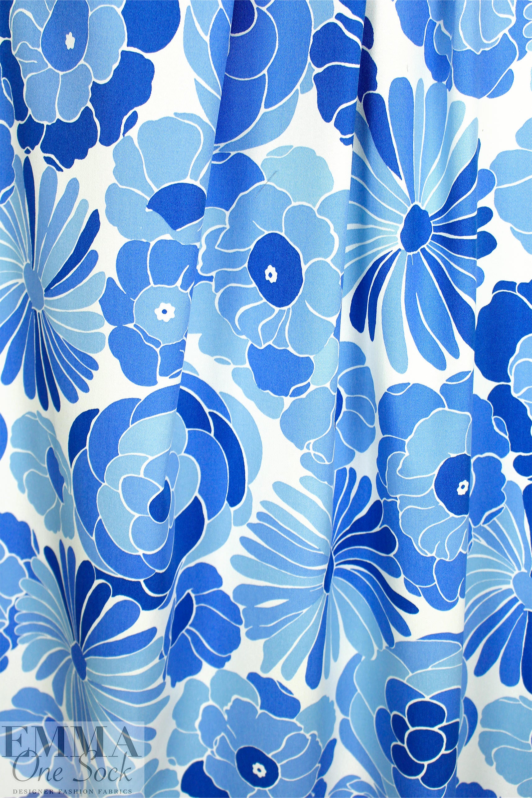 This Italian stretch cotton is a wonderful quality medium weight and opaque woven with body in the drape (think medium weight washed denim, for the texture and weight). It has a micro-canvas texture (or micro-pique' perhaps?), and the fabulous 'decoflora' print (24.75" repeat) features shades of blue on a white background (PANTONE 16-4120, 18-3928, 15-3920, etc.). It has about 10% stretch in the width only. Perfect for jacket, jeans, capris, sheath dress, etc. Test first if you wish to machine or hand wash cold, gentle, and hang to dry.