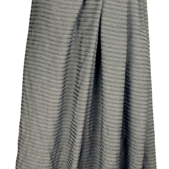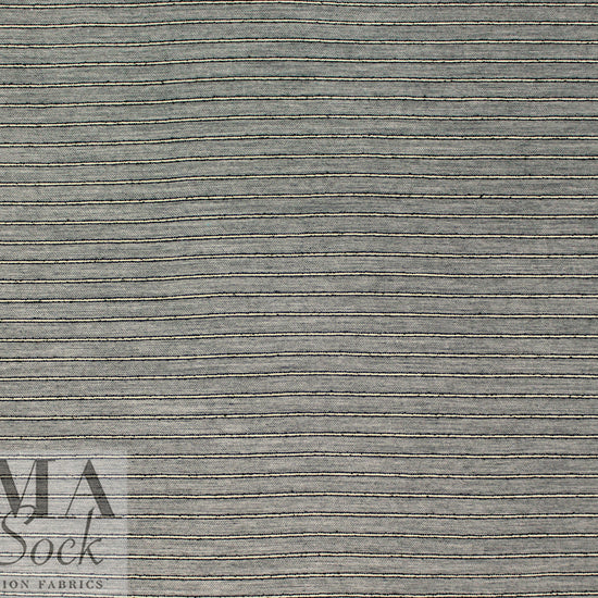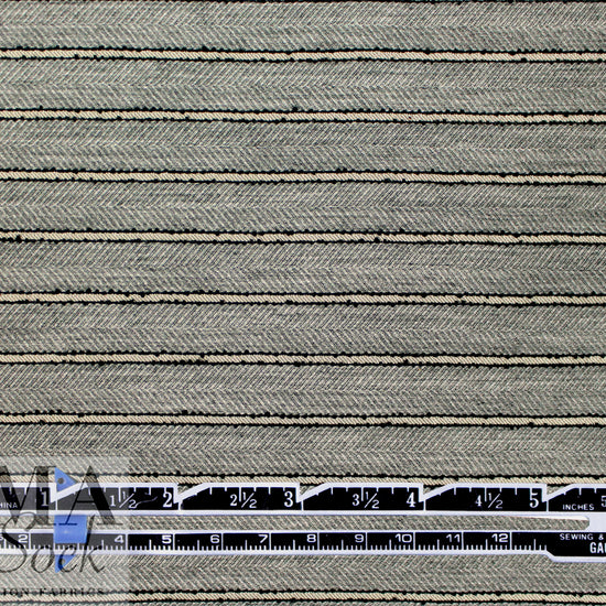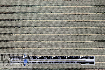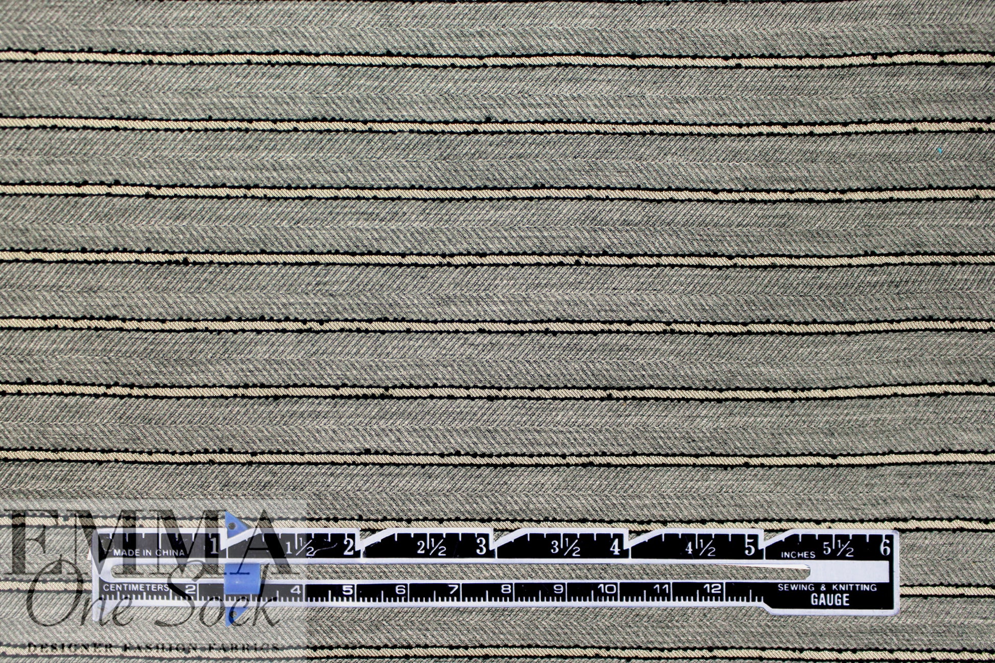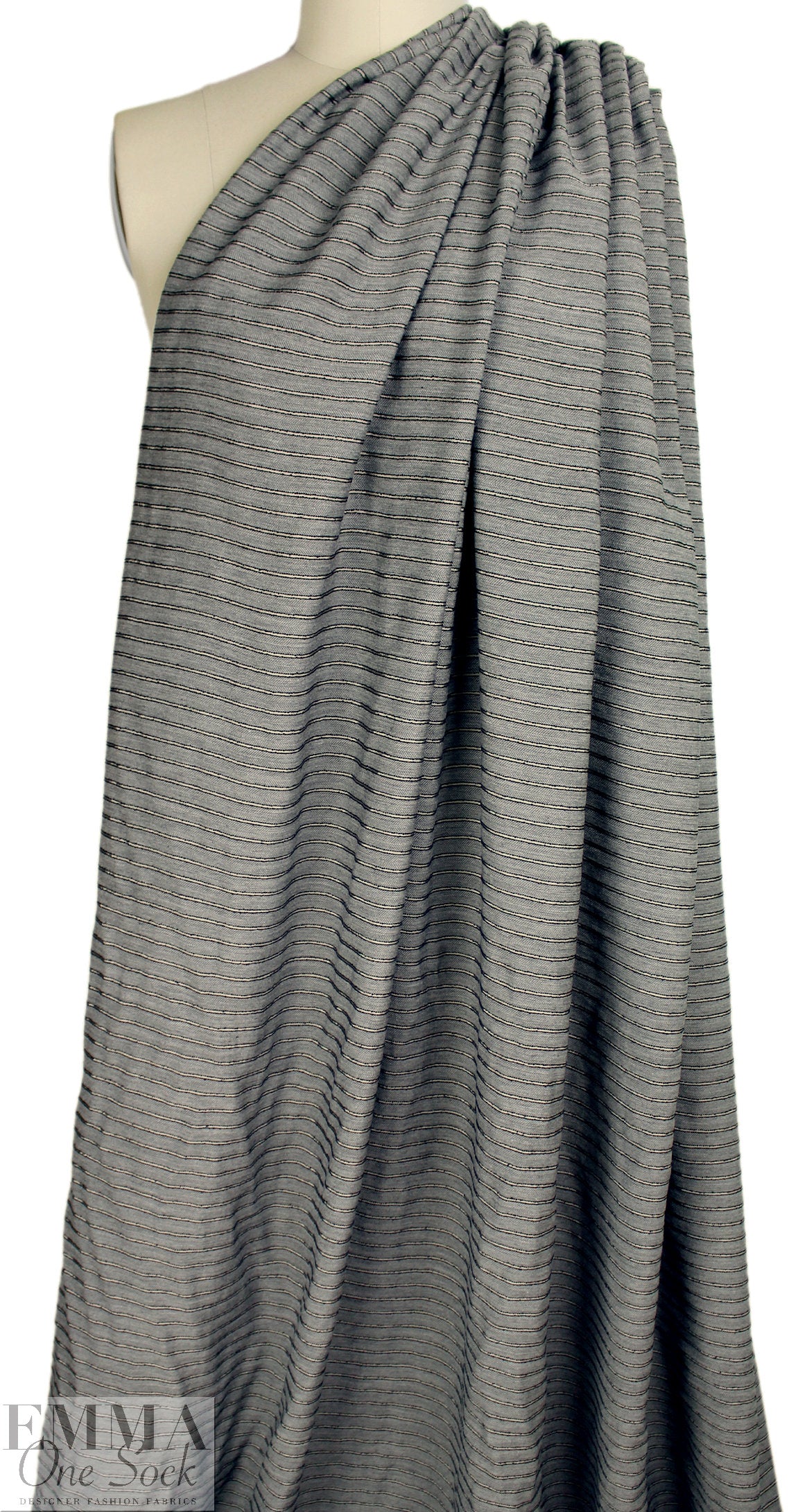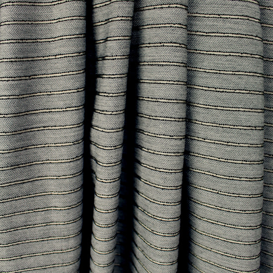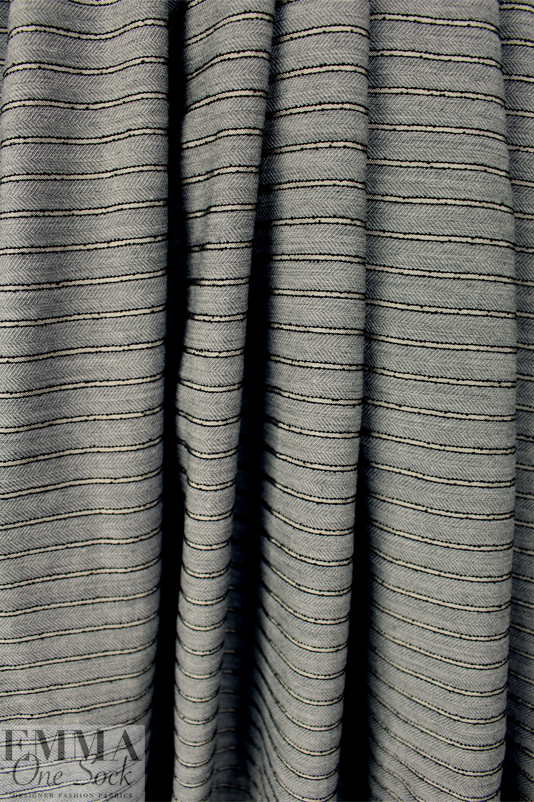 This beautiful yarn-dyed, horizontally striped herringbone woven comes from a designer, and is an opaque dress weight with a soft drape. The colors in this one are black and silver on a pewter background (PANTONE 11-4202, 14-1118) in a 1/2" repeating stripe. The herringbone weave is in the pewter section between the stripes, and is more visible in real life. There is no stretch, so you can orient your garment so that the stripes run horizontally, vertically or on the bias! It would be perfect for sophisticated yet breezy coordinates for warmer weather, wide-leg pants, dress, skirt, shirt, tunic, etc. Hand wash and hang to dry, or dry clean.