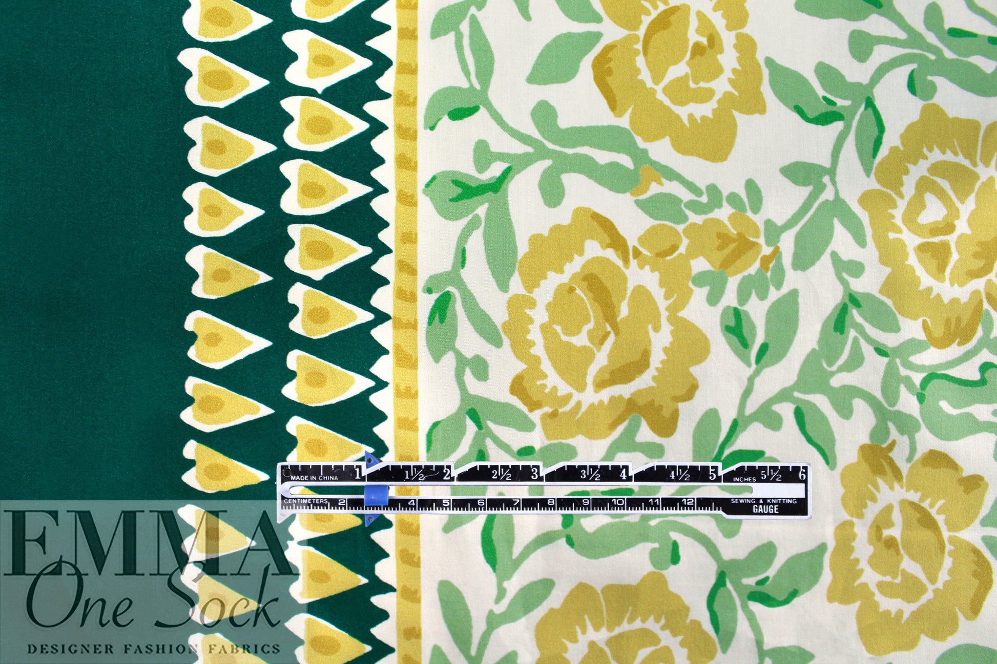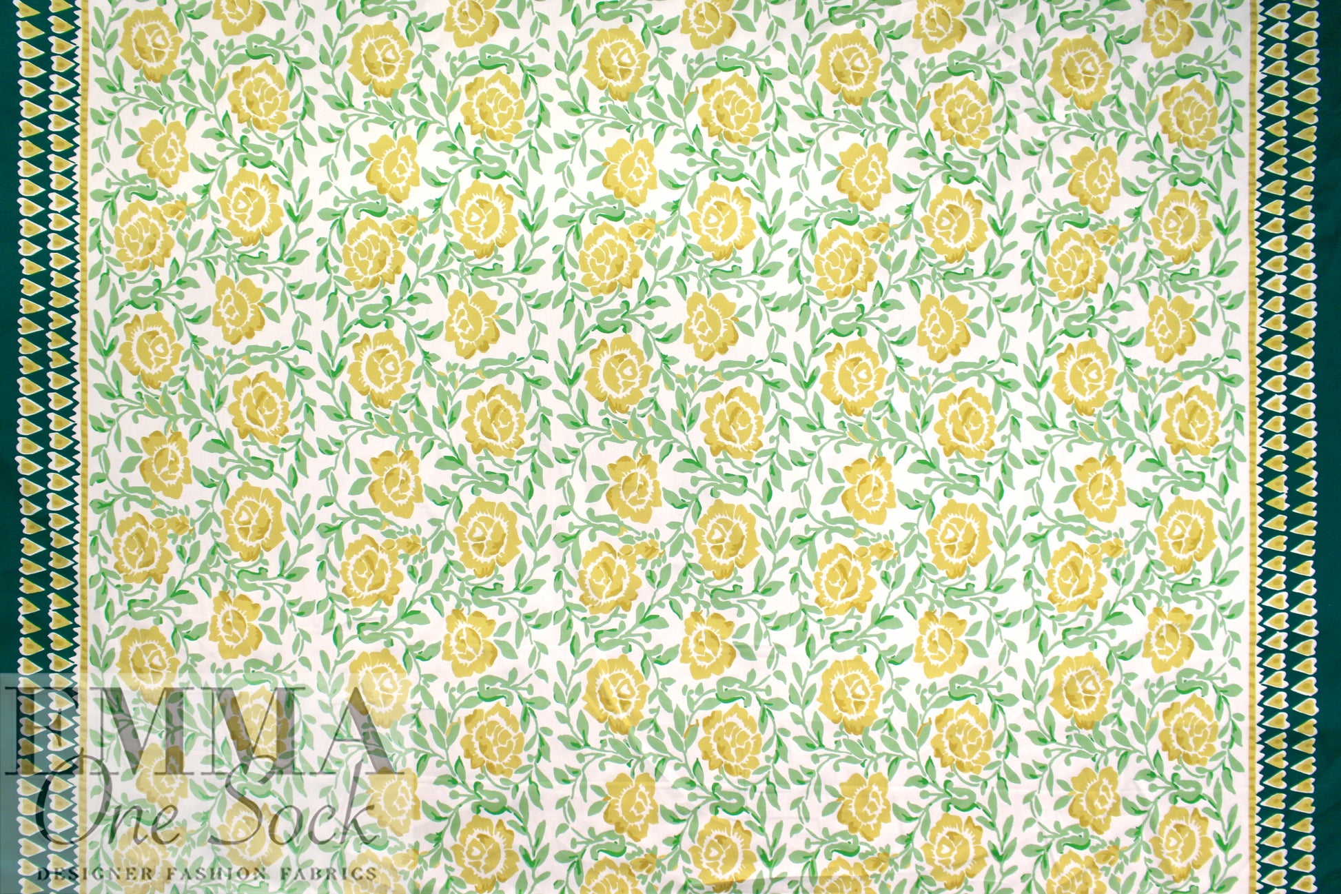 We were offered this beauty at a reduced price, and are passing the savings on to you! From Italy, this is an exquisite cotton sateen woven (no stretch), lightweight and opaque with a very subtle sheen and a soft drape with some body. The "yellow rose" print (23.5" repeat) has a 5" border along each selvage and your pattern should be cut widthwise to align the border with the edge of your garment. The colors are cream gold, honey, light sage and pine on a creamy white background (PANTONE 13-0739, 14-0754, 15-6414, 18-5410, etc.). With many design possibilities, it is perfect for an over-shirt, top, tunic, dress, skirt, etc. Dry clean or please test first if you wish to try hand wash and hang to dry.
