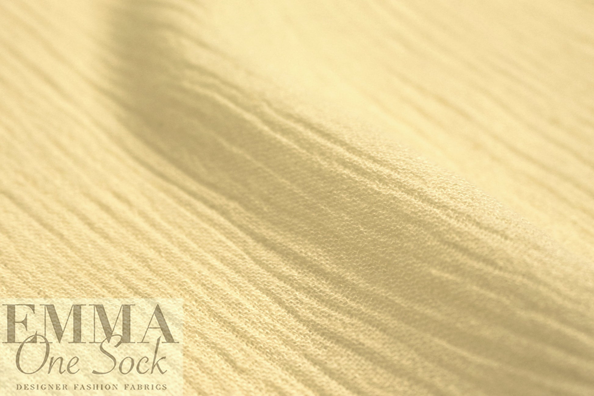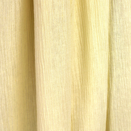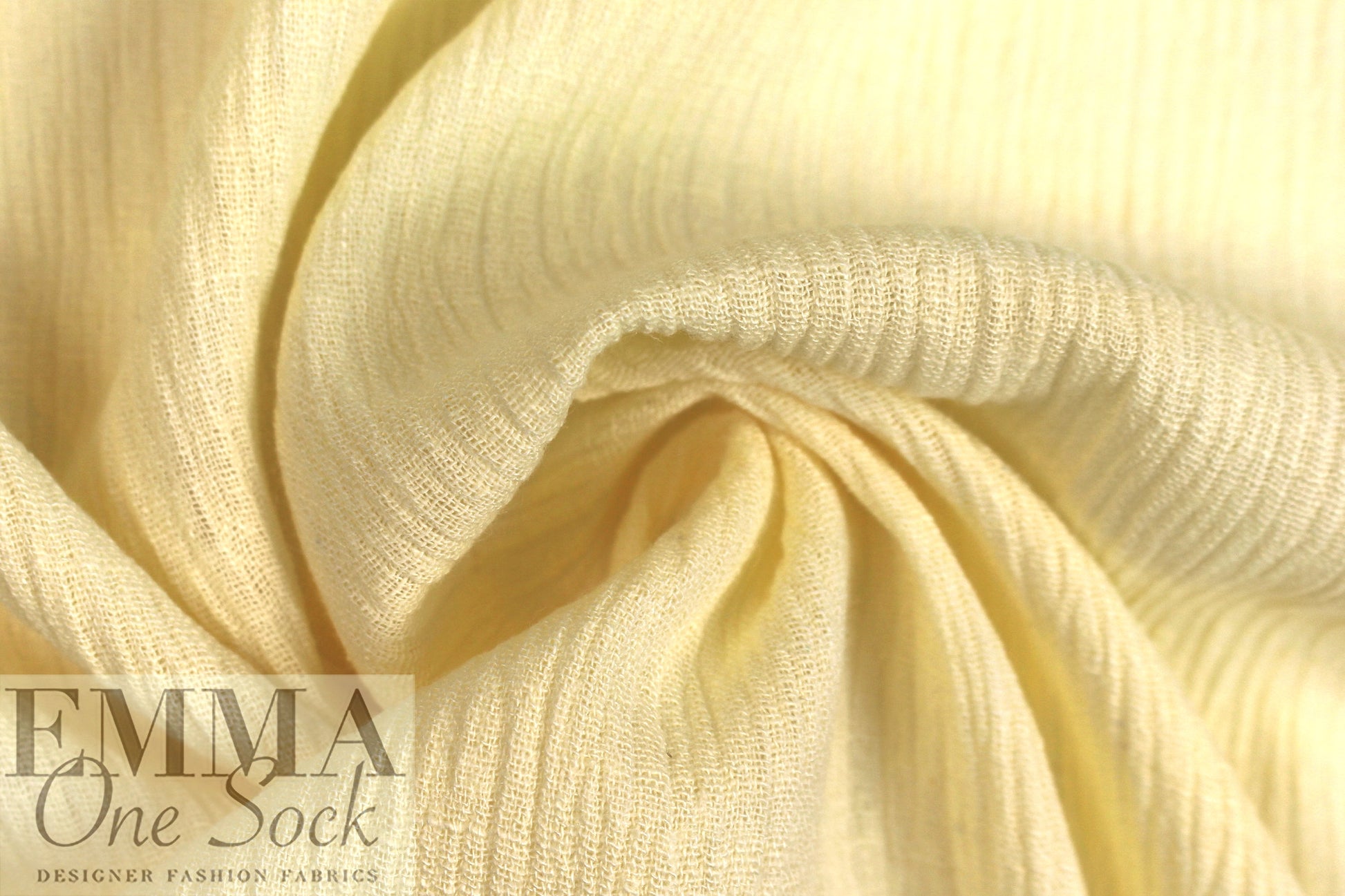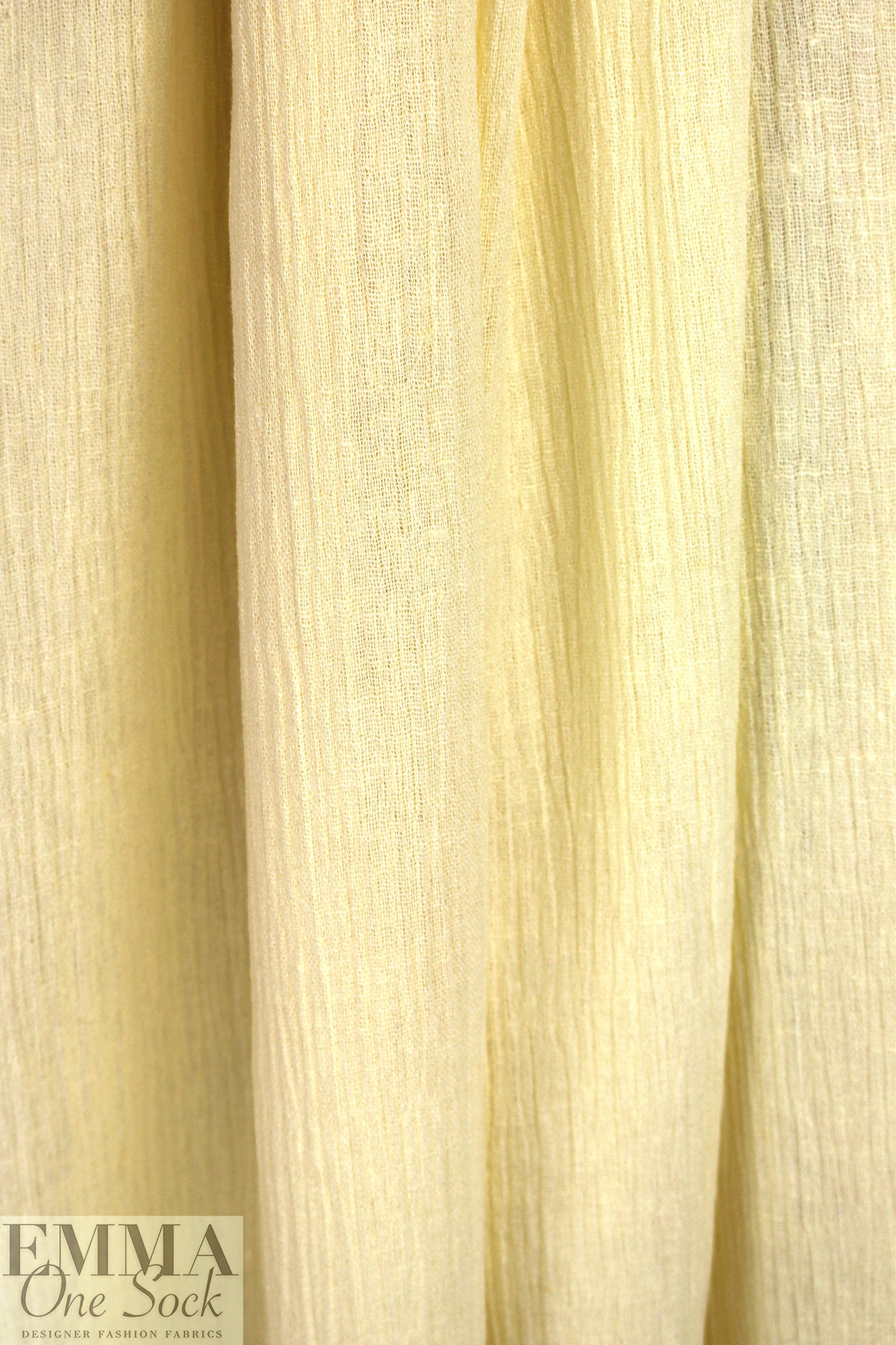 From a CA designer, this cotton gauze plissé crinkle-textured woven is lightweight and semi-sheer/semi-opaque. The plissé texture runs vertically, and it looks the same on both sides. It is a pretty pastel yellow color (PANTONE 11-0616 is close) and has a slightly open weave, making it perfect for summery garments. It has some body in the drape and is perfect for a breezy dress, blouse, skirt, tunic, top, etc. Some styles will need lining. Hand wash and hang or lay flat to dry (please test first).