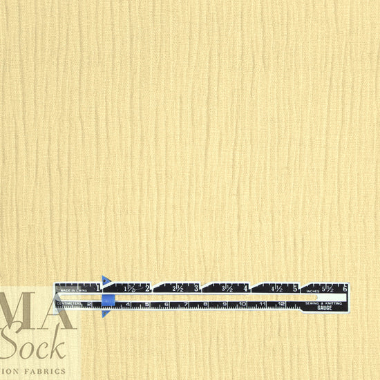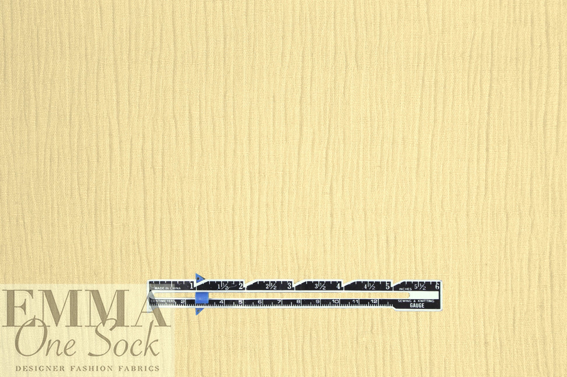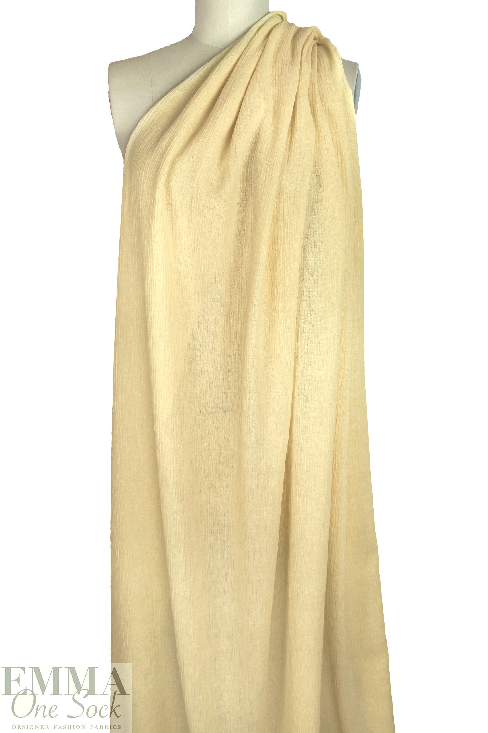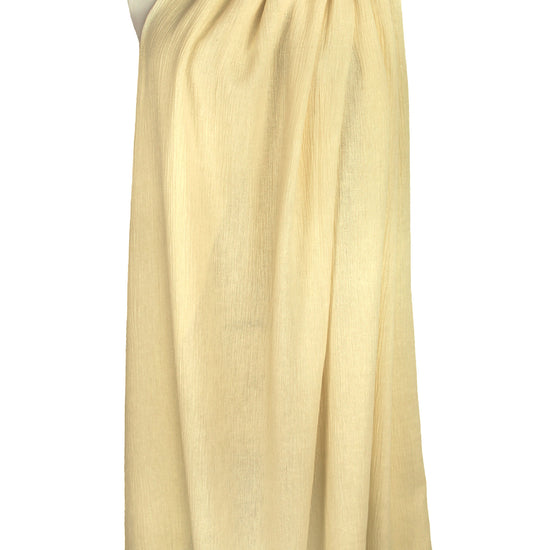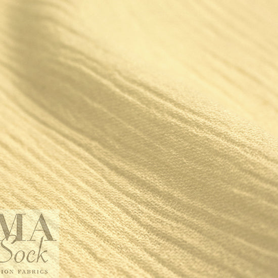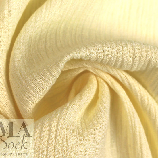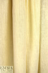 From a CA designer, this cotton gauze plissé crinkle-textured woven is lightweight and semi-sheer/semi-opaque. The plissé texture runs vertically, and it looks the same on both sides. It is a pretty pastel yellow color (PANTONE 11-0616 is close) and has a slightly open weave, making it perfect for summery garments. It has some body in the drape and is perfect for a breezy dress, blouse, skirt, tunic, top, etc. Some styles will need lining. Hand wash and hang or lay flat to dry (please test first).