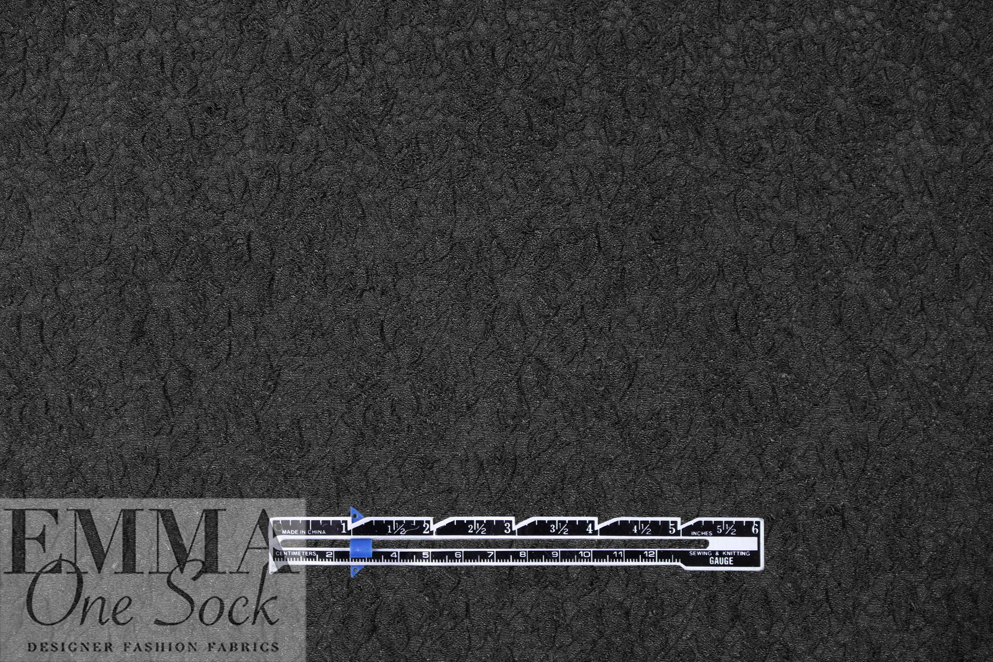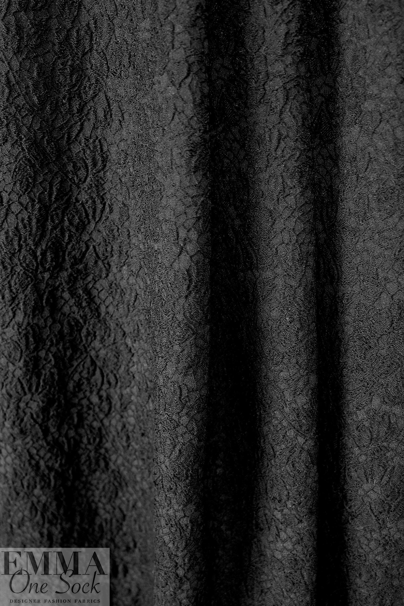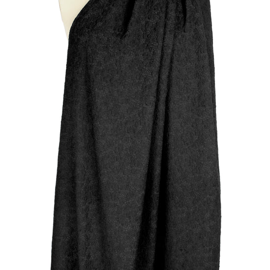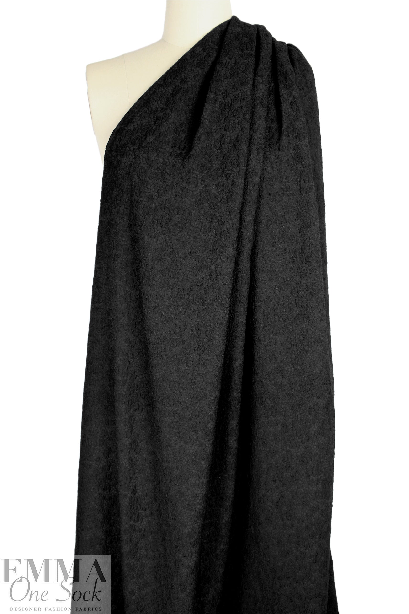 From Italy, this is a gorgeous wool blend jacquard woven with a floral lace pattern and some dimensional surface texture. The color is black, and the reverse is not as textured. It is opaque and lighter medium weight with some body in the drape, with just about 5% stretch in the width only. Make a special fitted jacket, dress, skirt suit, topper coat, pants, etc. Dry cleaning is probably best; please test first if you wish to try another method.