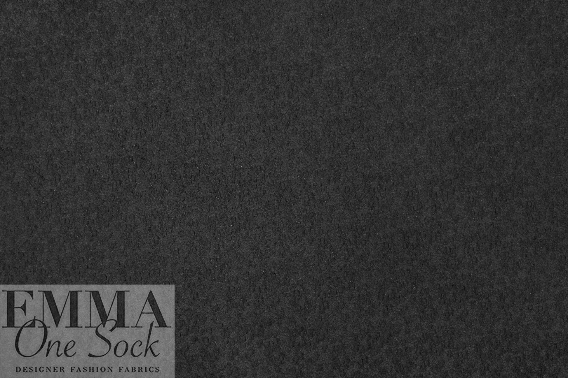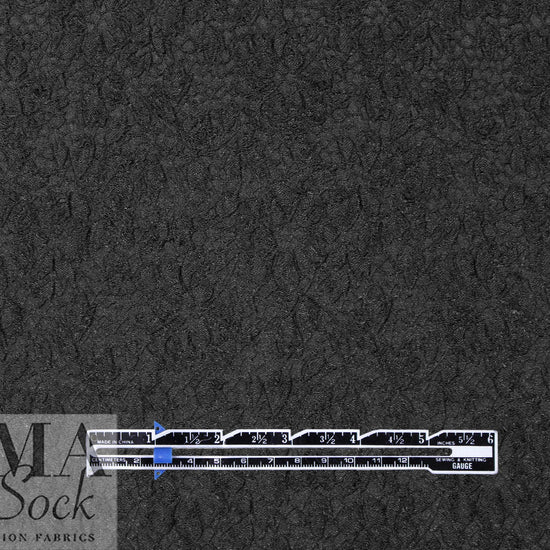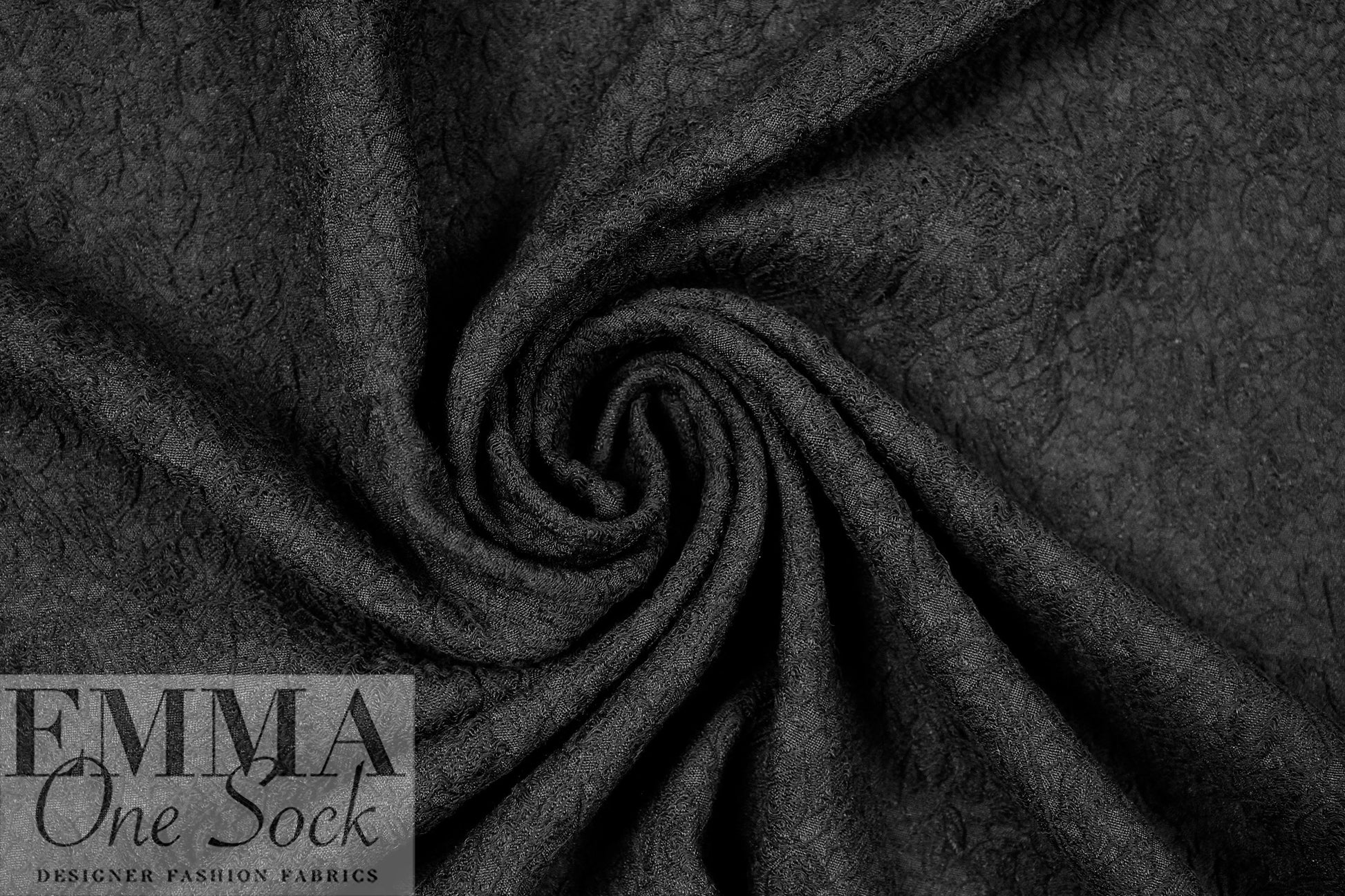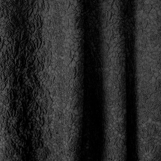 From Italy, this is a gorgeous wool blend jacquard woven with a floral lace pattern and some dimensional surface texture. The color is black, and the reverse is not as textured. It is opaque and lighter medium weight with some body in the drape, with just about 5% stretch in the width only. Make a special fitted jacket, dress, skirt suit, topper coat, pants, etc. Dry cleaning is probably best; please test first if you wish to try another method.
