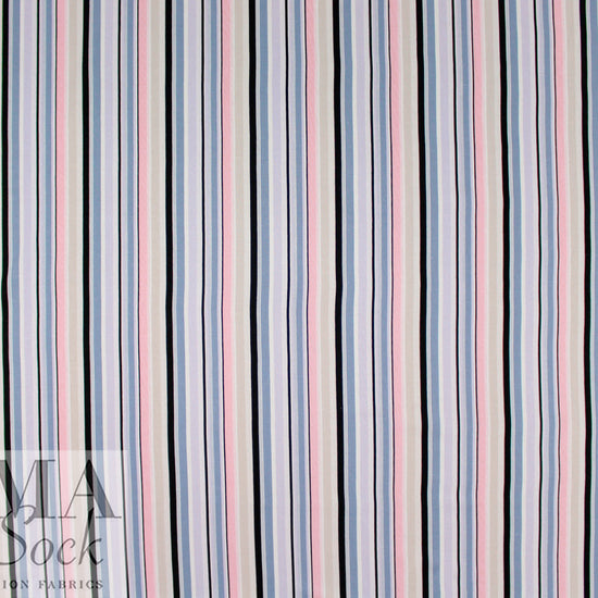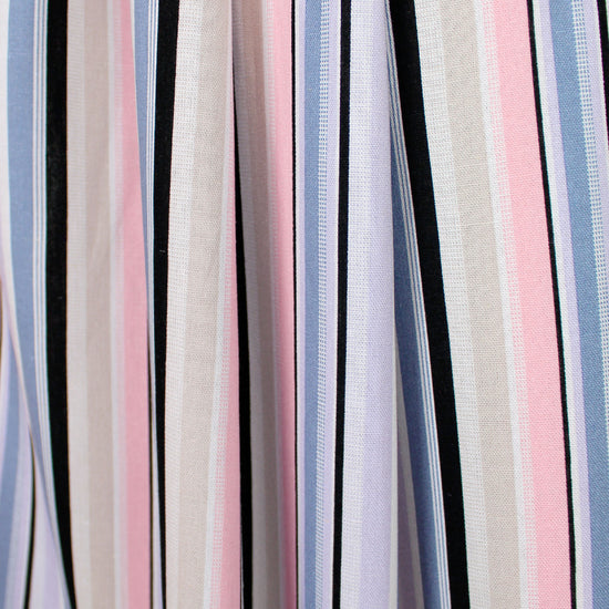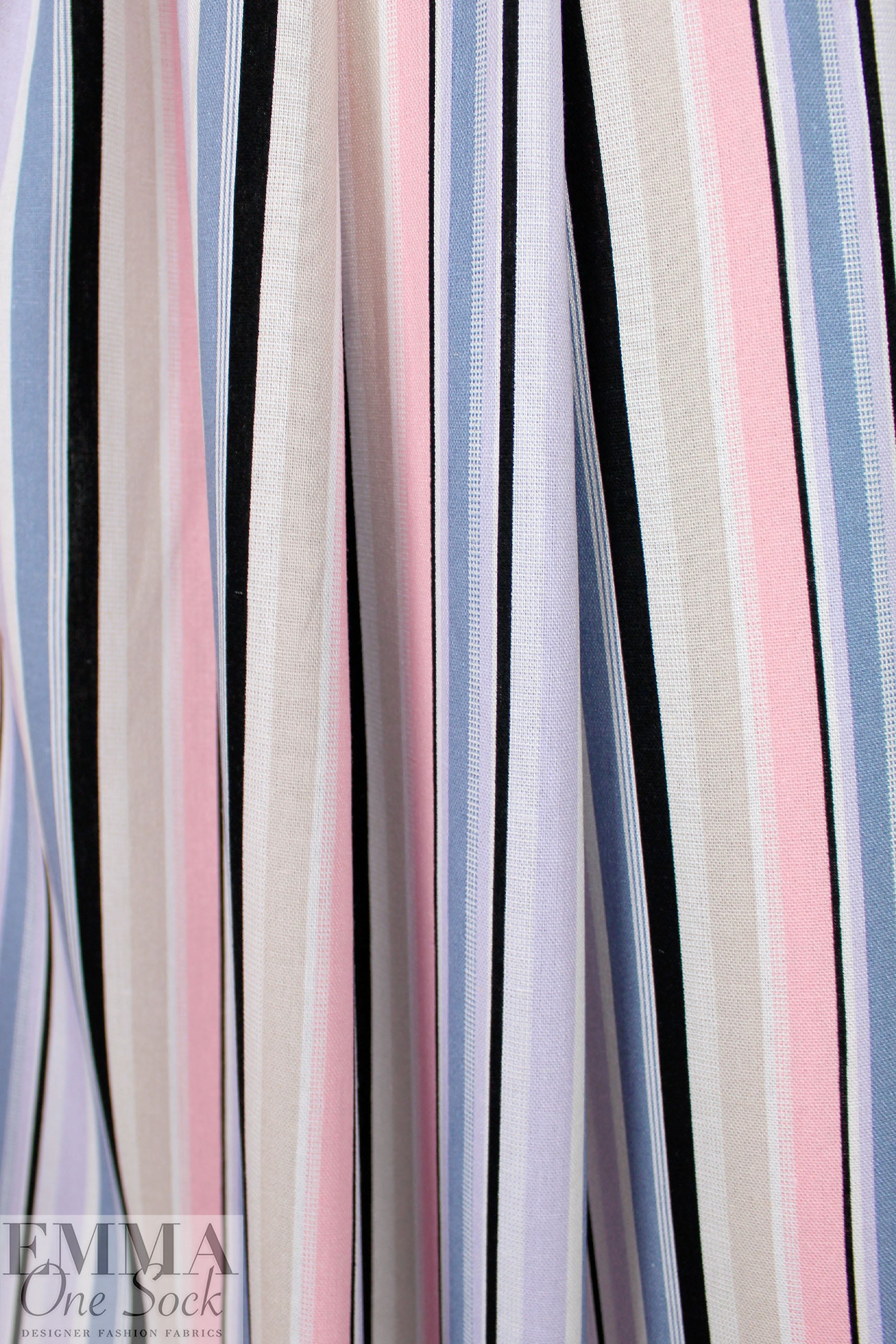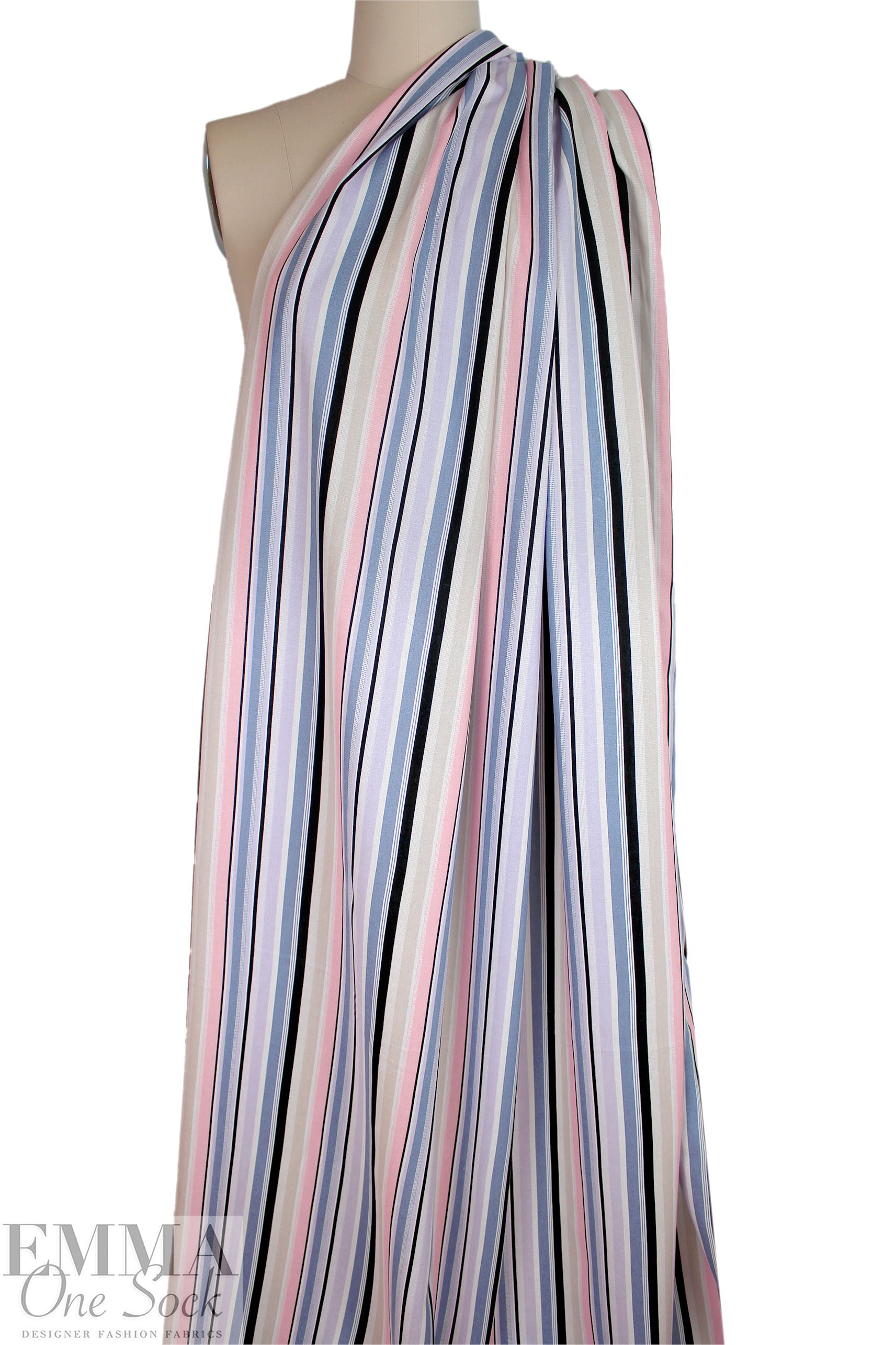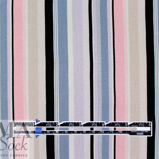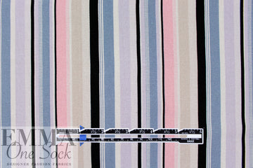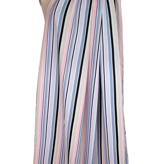 This is a fabulous rayon/linen woven with a pattern of printed stripes in a 4.5" horizontal repeat. It is lightweight yet opaque with a soft drape that has a bit of body. While the weave is visible, giving it a linen look, the hand is smooth and soft. The refreshing colors include light denim, peachy pink, black, soft white, light khaki and pale lavender (PANTONE 16-3919, 13-2005, 14-3710, etc.). Perfect for breezy separates and warmer weather garments: pants, tops, dresses, skirts, overshirts, etc. Hand or machine wash on warm or cold, hang to dry, or dry clean.