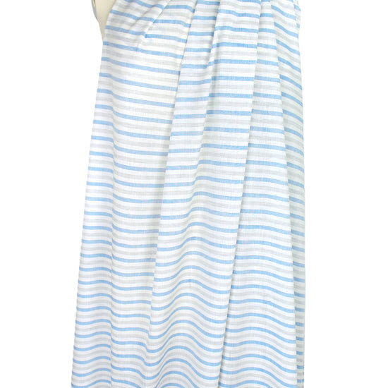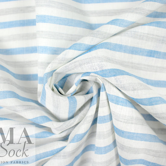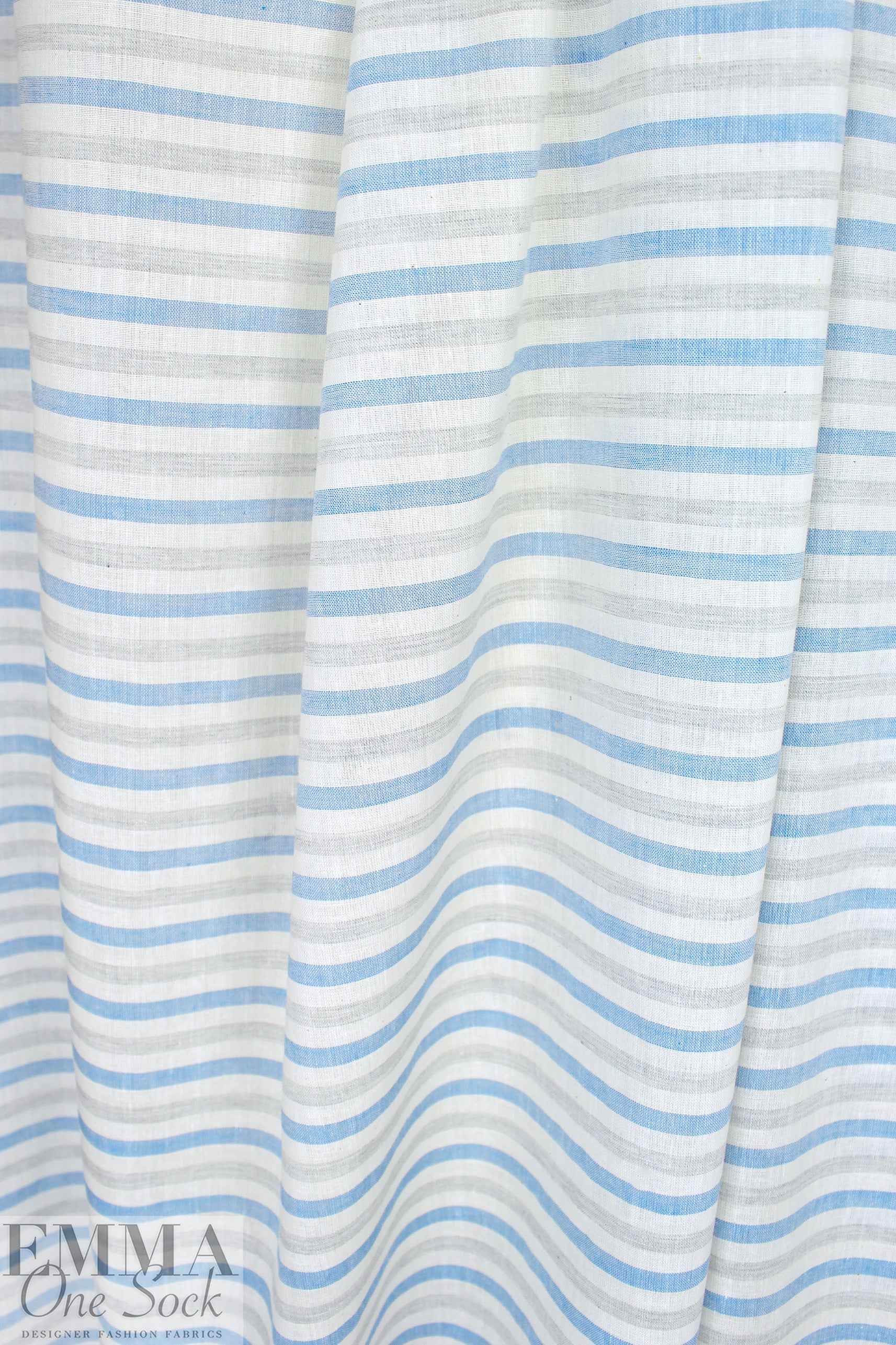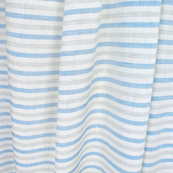 This is a lovely quality light weight cotton voile with a yarn-dyed stripe pattern (1" vertical repeat) in sky blue, light gray and snow white (PANTONE 16-4132, 14-4002, 11-0602). The blue and gray stripes have a chambray look as they mix with the white weft fibers. It is a wonderful and versatile basic, semi-sheer with a touch of cottony body in the drape, making it perfect tailored shirts and overlays, a warmer weather tunic, top, skirt, beach coverup, etc. Some styles may need lining. Test first if you want hand or machine wash. Hang to dry.
