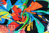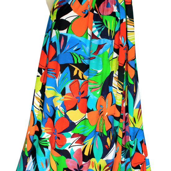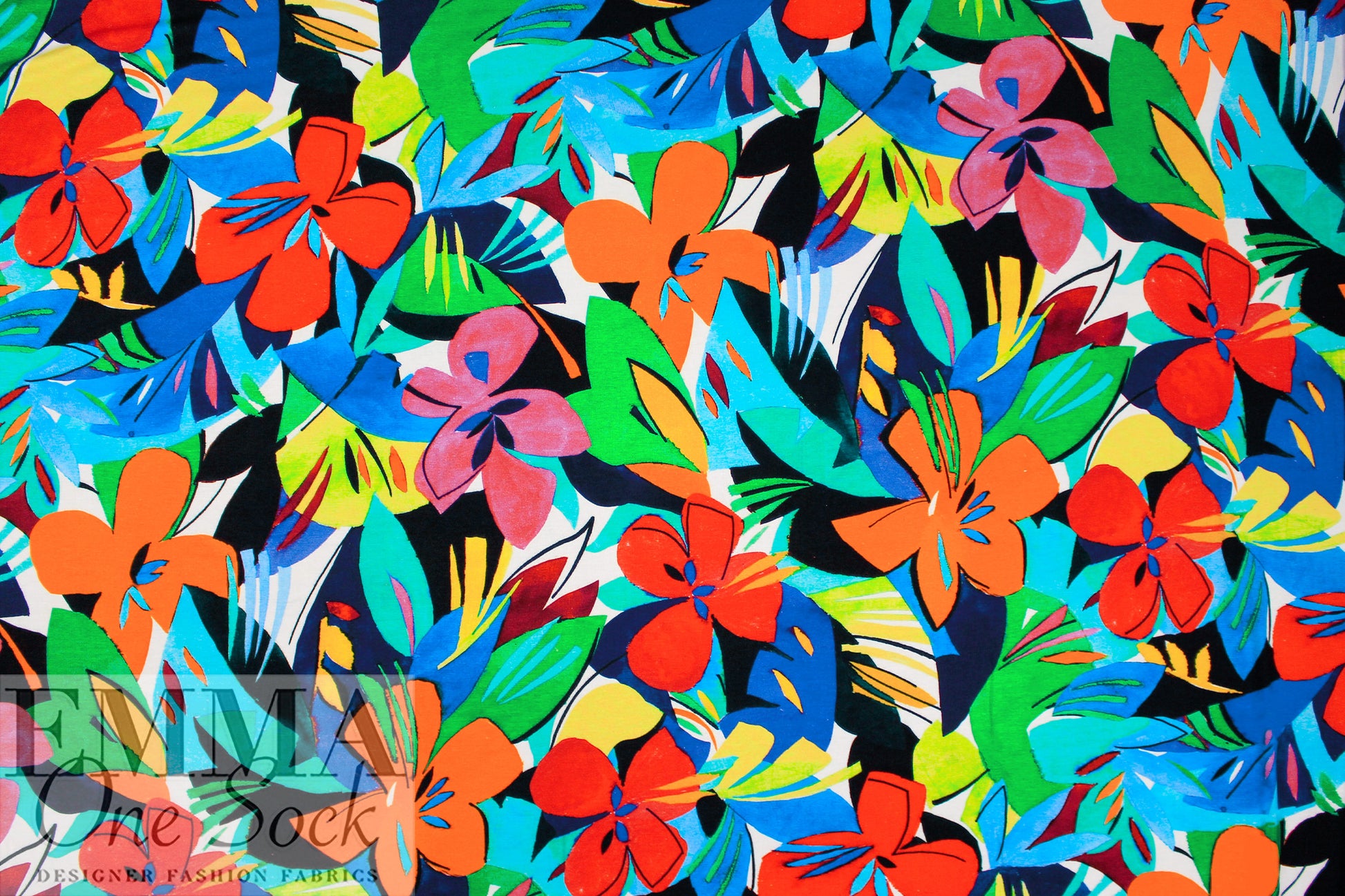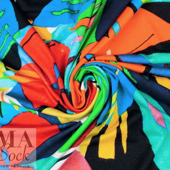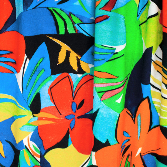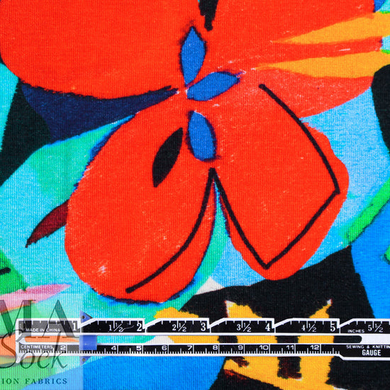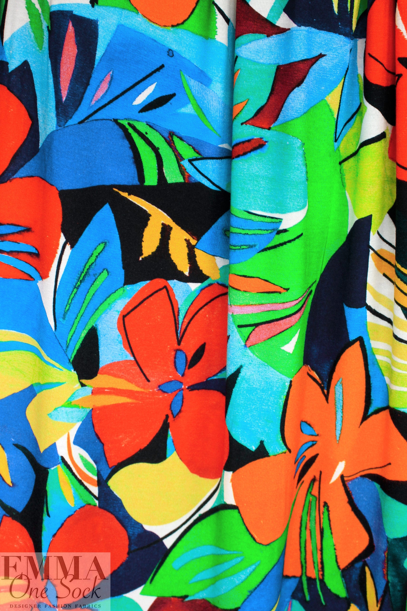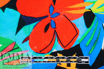 Made in Italy, this is a wonderful viscose/spandex knit, light weight yet opaque with lots of drape and about 40% stretch in both directions with great recovery. The "joyful flowers" graphic print has a 29.5" repeat, and the colors are clementine, limoncello, kelly green, ultramarine, aqua, black, white, etc., (PANTONE 16-1364, 14-0756, 16-6138 but brighter, 19-4150 ish, 16-5422, etc.). Great for tees, tops, tunics, casual dresses, etc. Test first if you would like to hand or machine wash, cold, hang to dry.