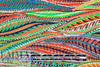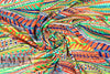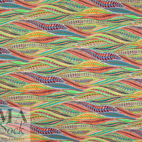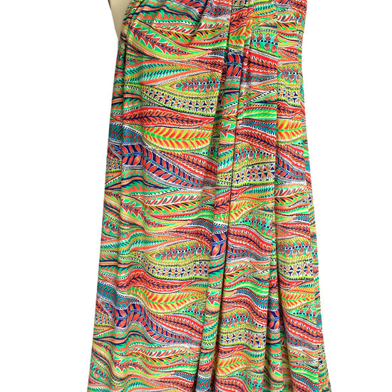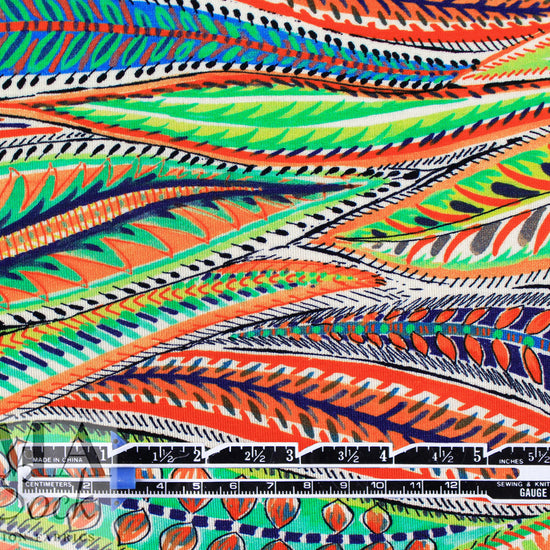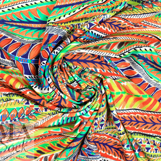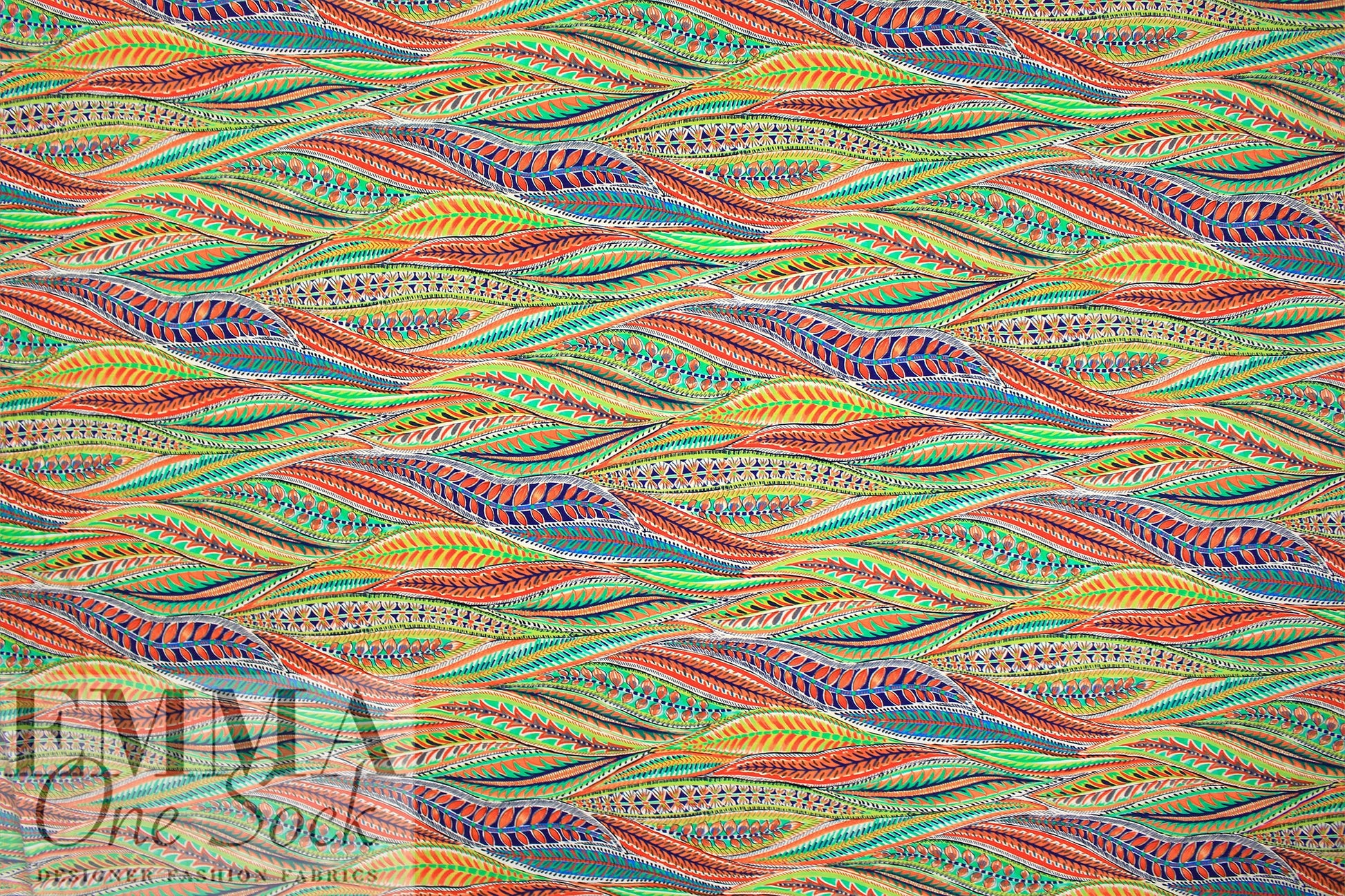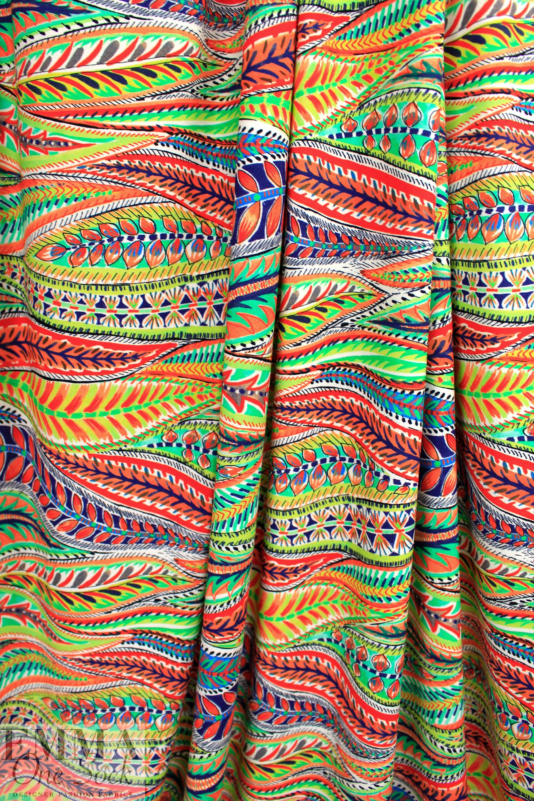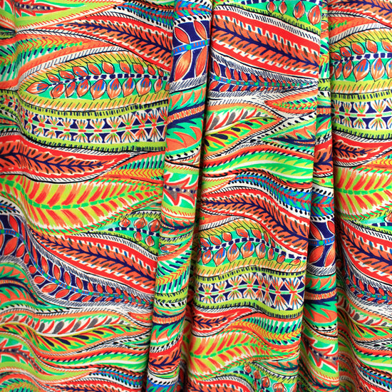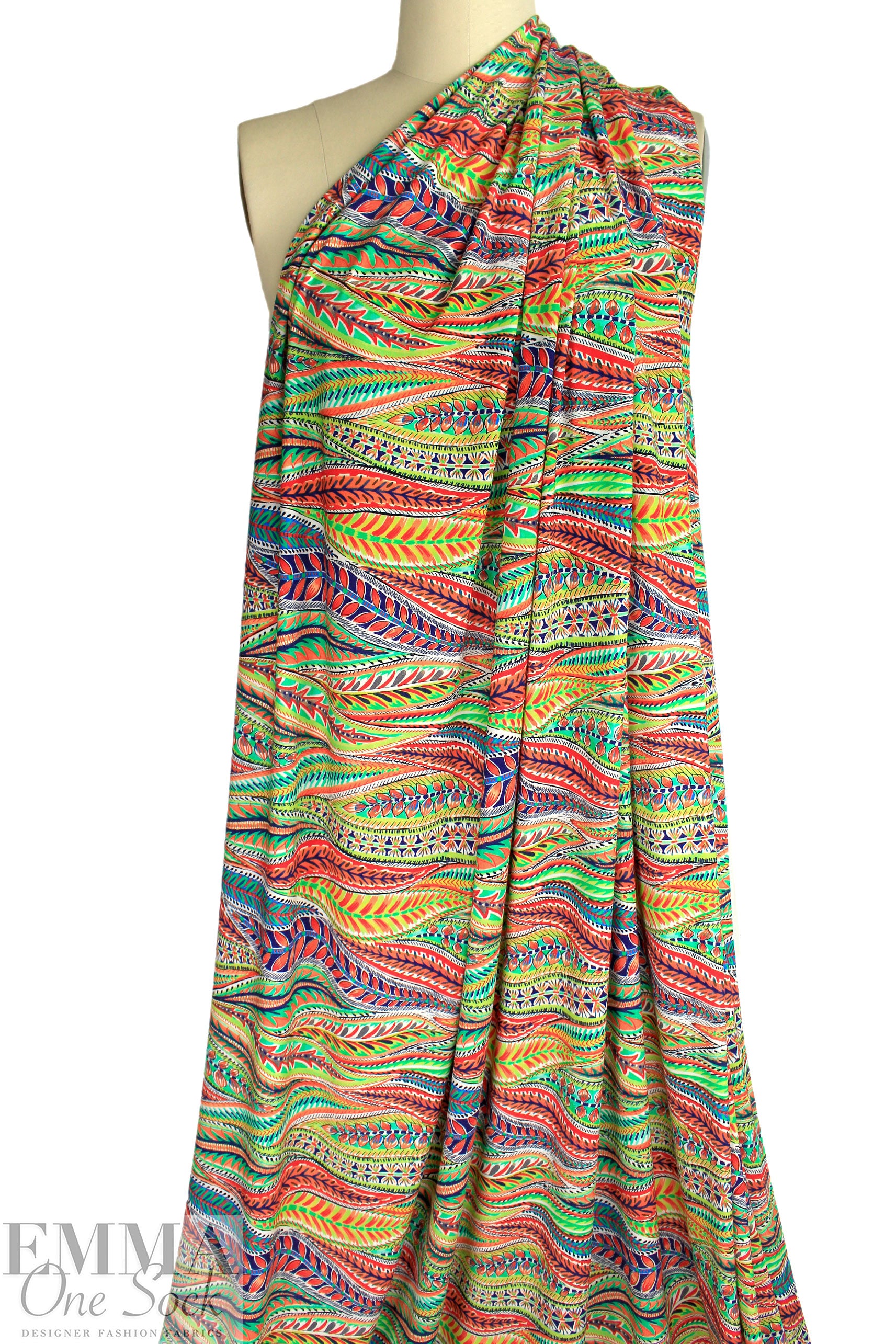 Made in Italy, this is a delightful viscose/spandex knit, light weight yet opaque with lots of drape and about 40% stretch in both directions. The stylized "wavering leaves" print has an 11.5" repeat, and the colors include mandarin, light jade, ultramarine, pear, black, white, etc., (PANTONE 19-3952, 16-5825, 13-0442, 17-1562, etc.). Great for tees, tops, tunics, etc. Test first if you would like to hand or machine wash, cold, hang to dry.