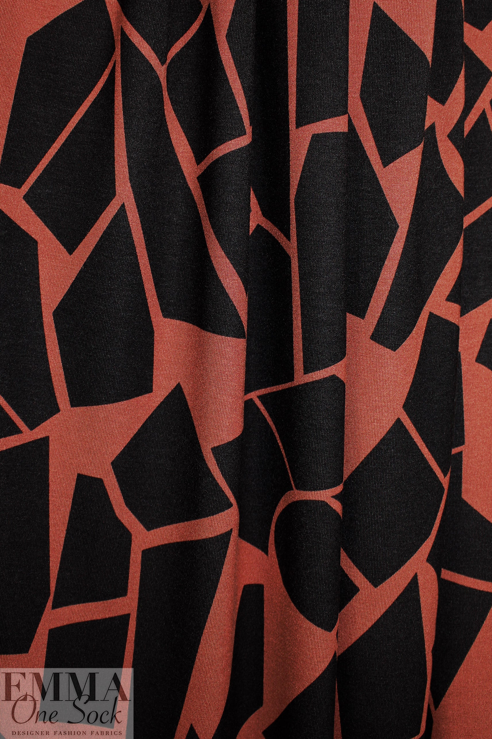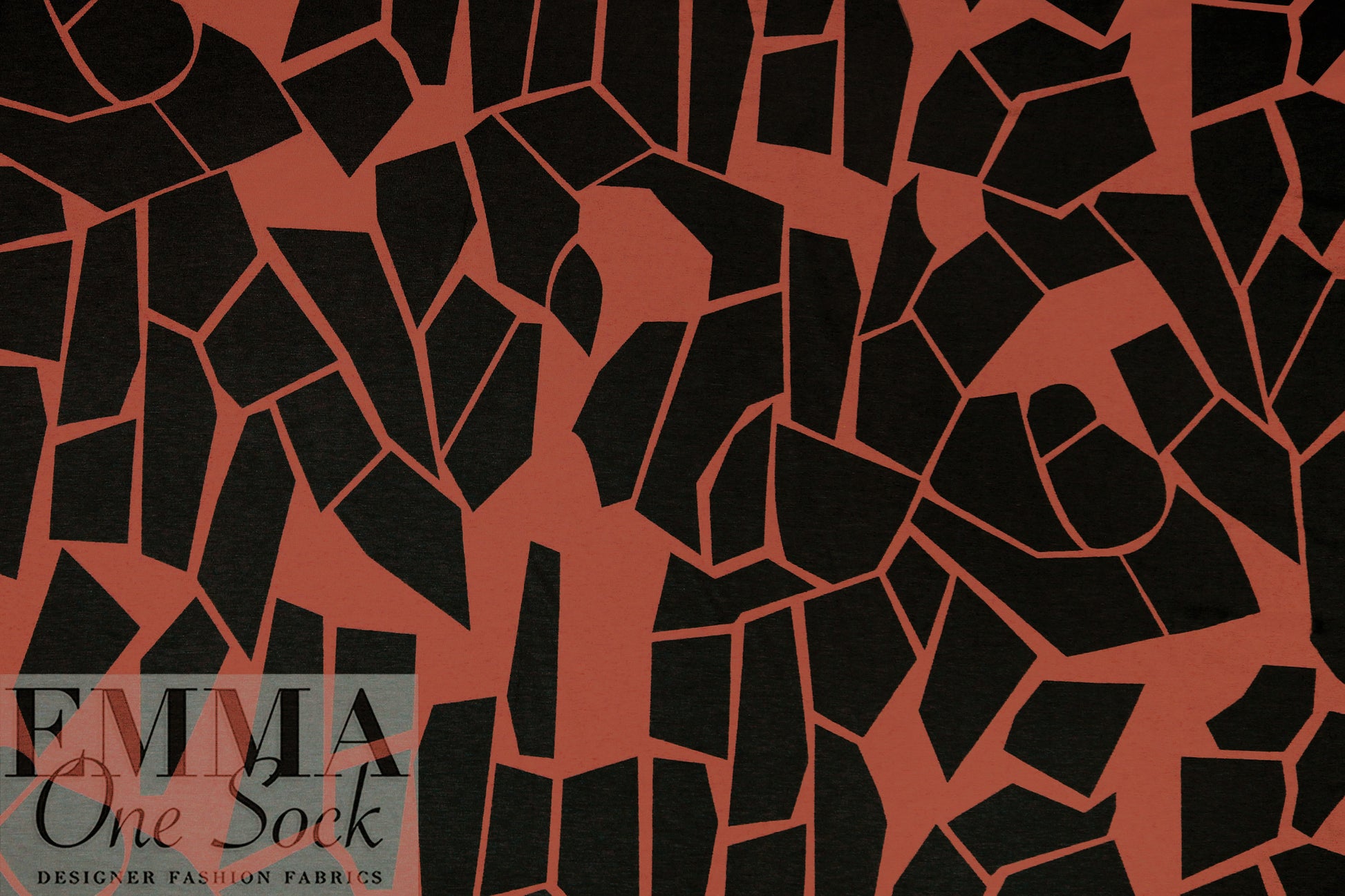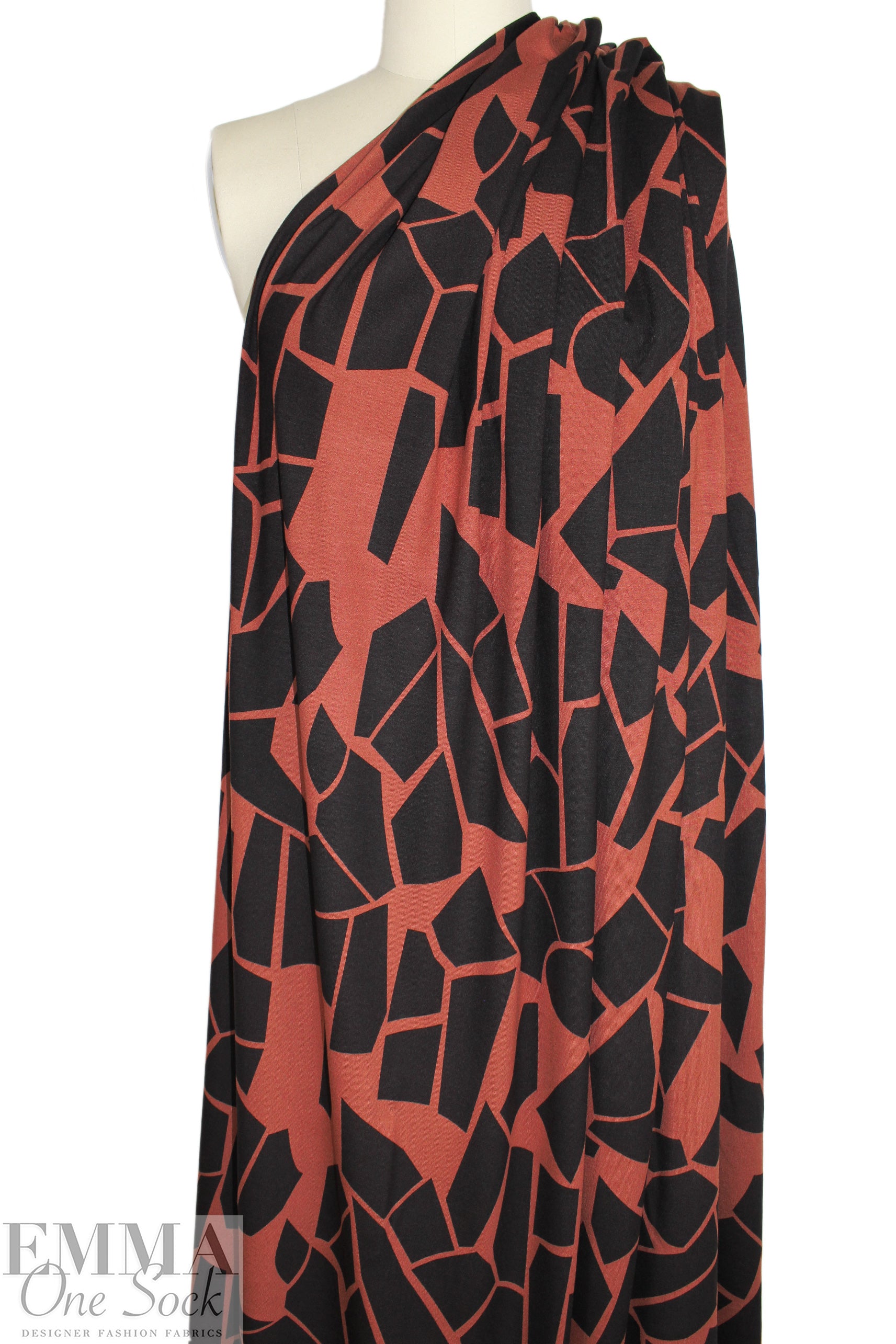 This amazing fabric from Mind the Maker has quite the resume! It is Oeko-Tex certified, 94% LENZING™ ECOVERO™ viscose and 6% elastane, providing 20% stretch in each direction. EcoVero is a viscose fabric made from sustainably sourced, renewable resources and the end product is completely biodegradable. The overall environmental impact is so low that it has been awarded the prestigious EU Ecolabel. EcoVero performs exceptionally well for everyday wear as it is very soft, comfortable, breathable and durable with a lovely drape and resistance to wrinkling. It is great for sportswear as the cellulose fibers regulate moisture and stay cool. A wonderful choice for your professional wardrobe as well, as this fabric retains vivid color and does not pill. Versatile, comfortable and easy to wear, EcoVero is an exciting development in eco-friendly fashion. This smooth and soft viscose jersey is opaque, light and drapey with a large-scale print on a dyed base. It has a fabulous and very current "odd puzzle" print (16.5" vertical repeat) featuring a very cool geometric graphic in black on a sienna background (PANTONE 18-1346). It is perfect for tops, tunics, tights, cardigan, etc.! Hand or machine wash, cold water, and hang or lay flat to dry.