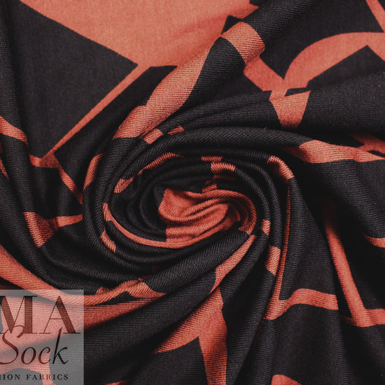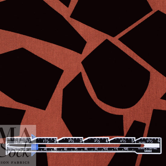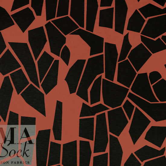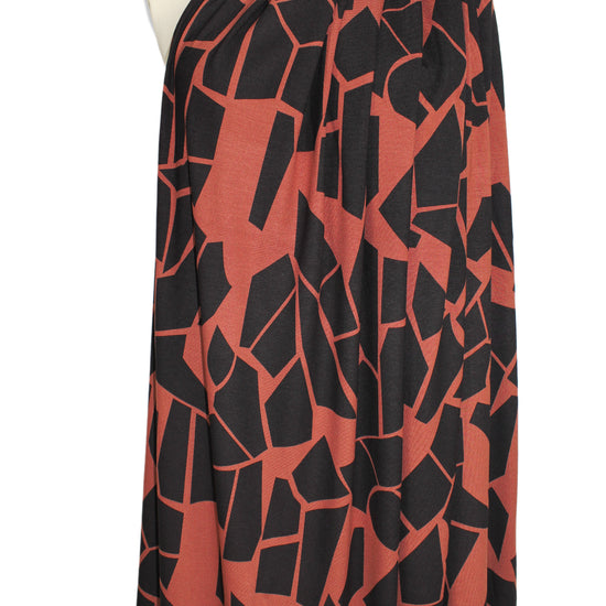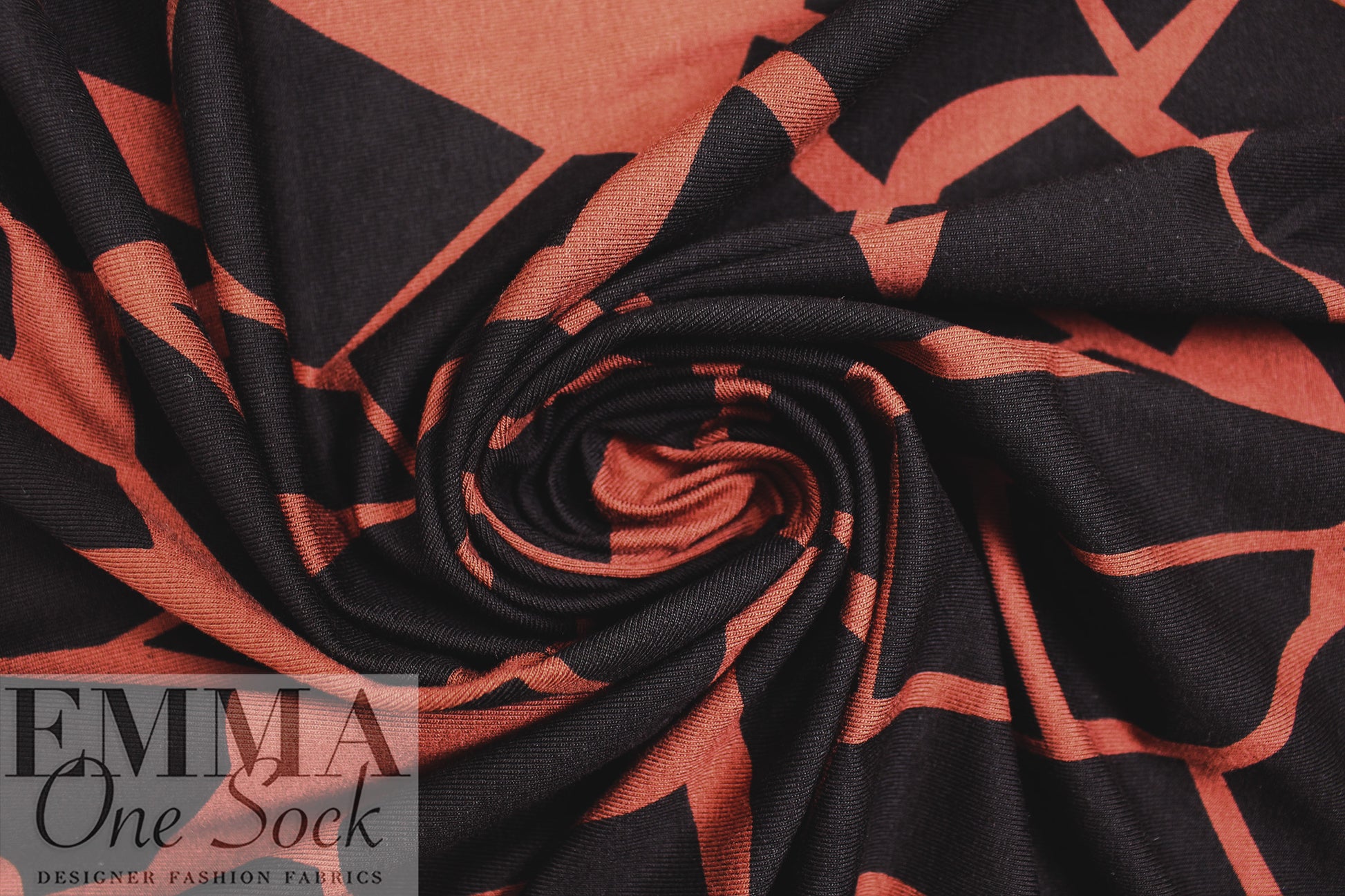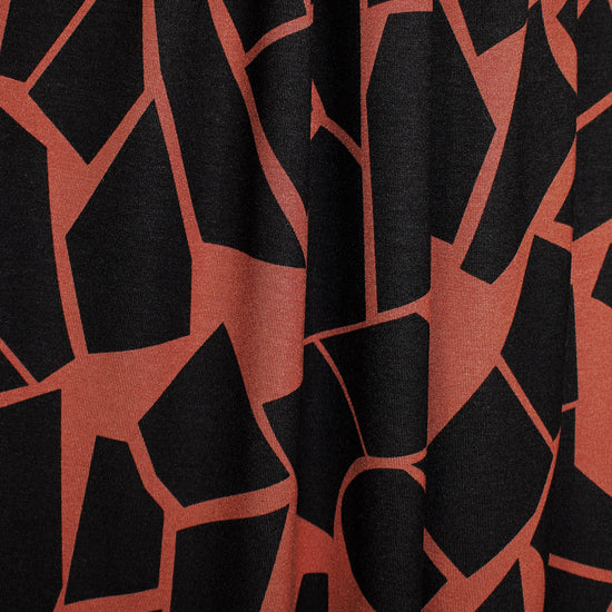 This amazing fabric from Mind the Maker has quite the resume! It is Oeko-Tex certified, 94% LENZING™ ECOVERO™ viscose and 6% elastane, providing 20% stretch in each direction. EcoVero is a viscose fabric made from sustainably sourced, renewable resources and the end product is completely biodegradable. The overall environmental impact is so low that it has been awarded the prestigious EU Ecolabel. EcoVero performs exceptionally well for everyday wear as it is very soft, comfortable, breathable and durable with a lovely drape and resistance to wrinkling. It is great for sportswear as the cellulose fibers regulate moisture and stay cool. A wonderful choice for your professional wardrobe as well, as this fabric retains vivid color and does not pill. Versatile, comfortable and easy to wear, EcoVero is an exciting development in eco-friendly fashion. This smooth and soft viscose jersey is opaque, light and drapey with a large-scale print on a dyed base. It has a fabulous and very current "odd puzzle" print (16.5" vertical repeat) featuring a very cool geometric graphic in black on a sienna background (PANTONE 18-1346). It is perfect for tops, tunics, tights, cardigan, etc.! Hand or machine wash, cold water, and hang or lay flat to dry.