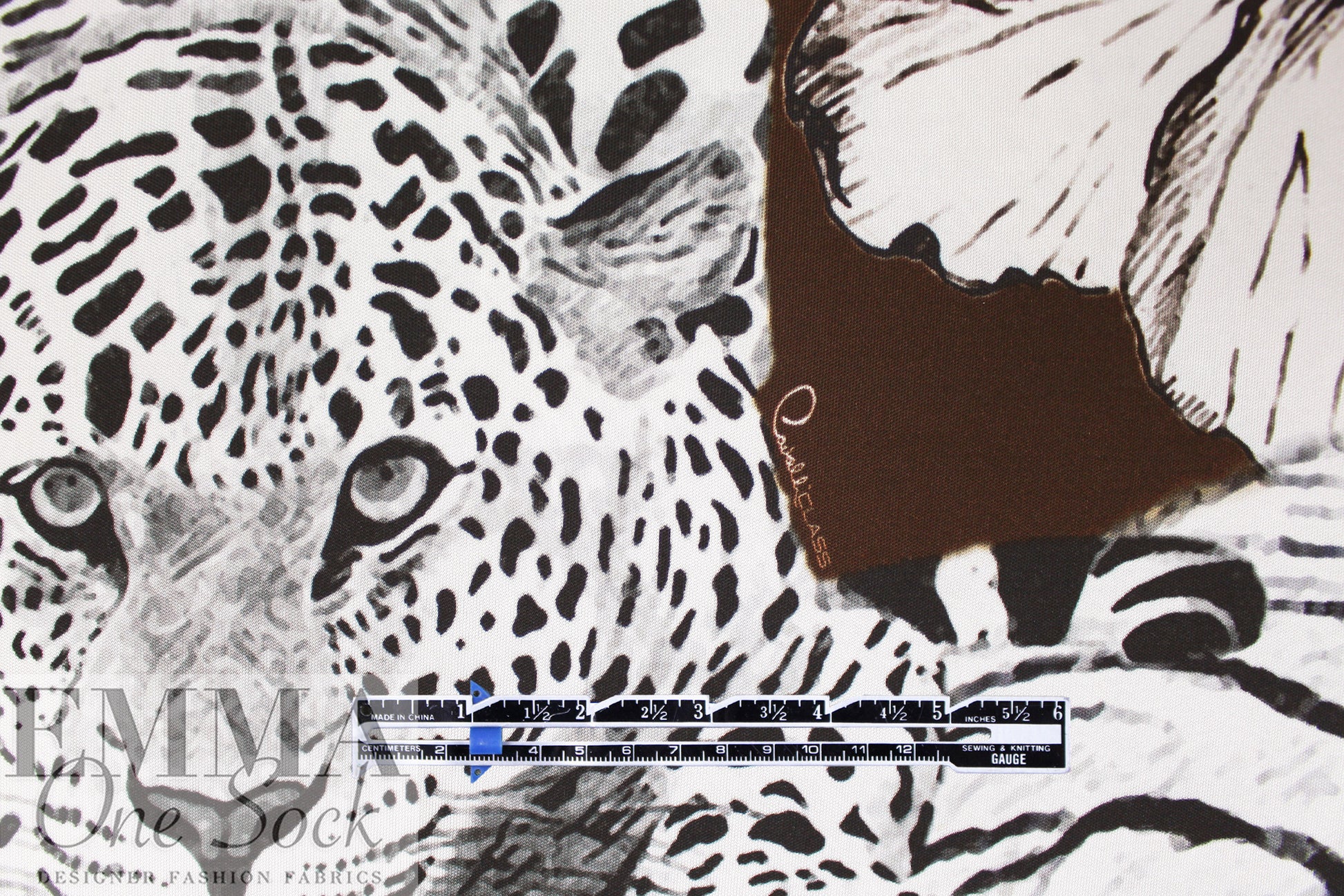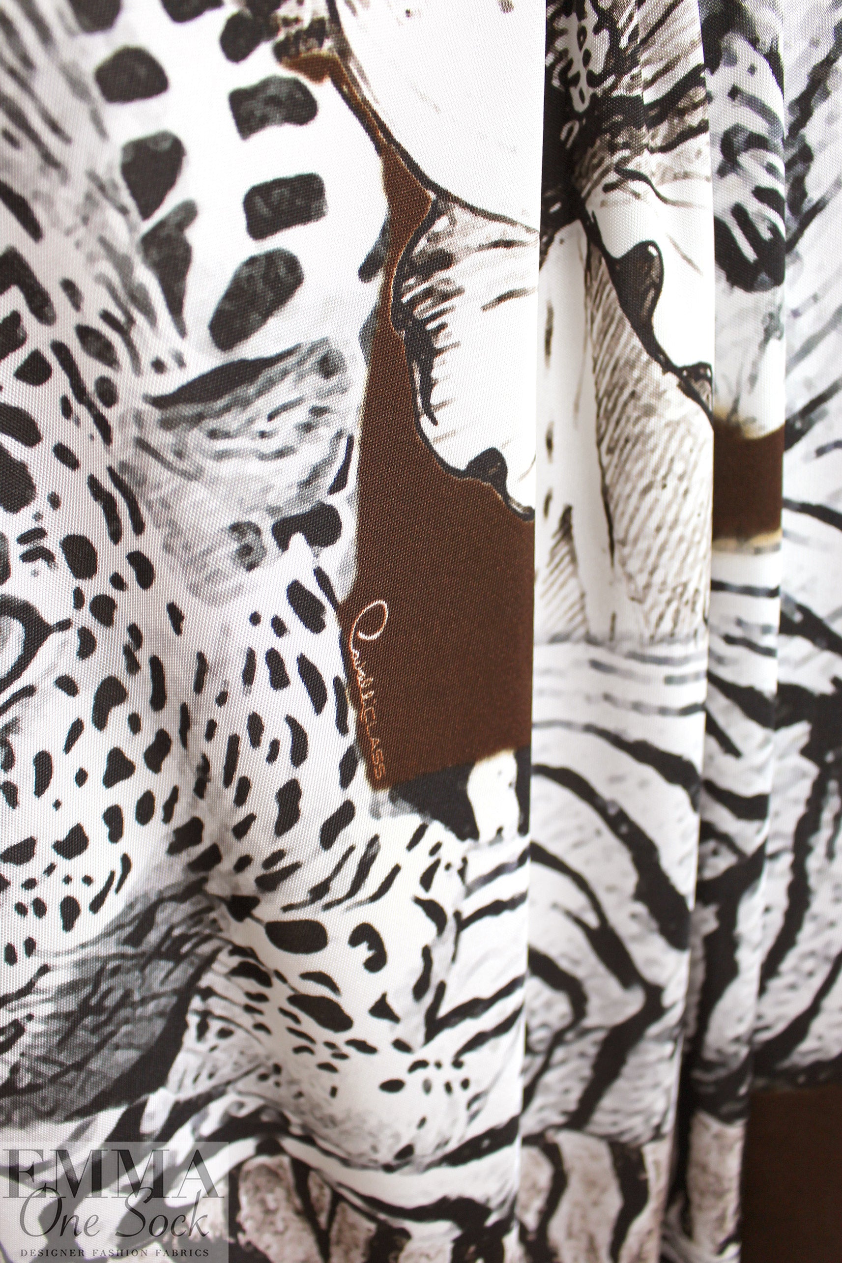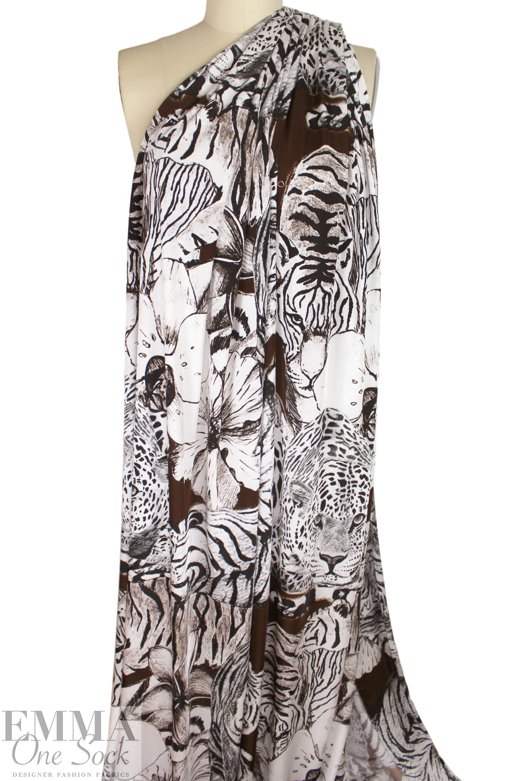 An amazing quality printed Cavalli matte jersey just in from Italy! The fabric has a slightly "slippery", drapey quality that skims rather than clings to the body to create a flattering silhouette. It is lightweight yet opaque with a liquid drape, and while it has 20% widthwise stretch, it is very stable. The dramatic "big cat garden" design is stunning, featuring tones of black, gray, coffee, pearl, etc. (PANTONE 17-5102, 19-0814, etc.). Perfect for tops, tees, tunic, dress, maxi dress, wrap dress ala DVF, etc. Hand wash and hang to dry (please test first) or dry clean.