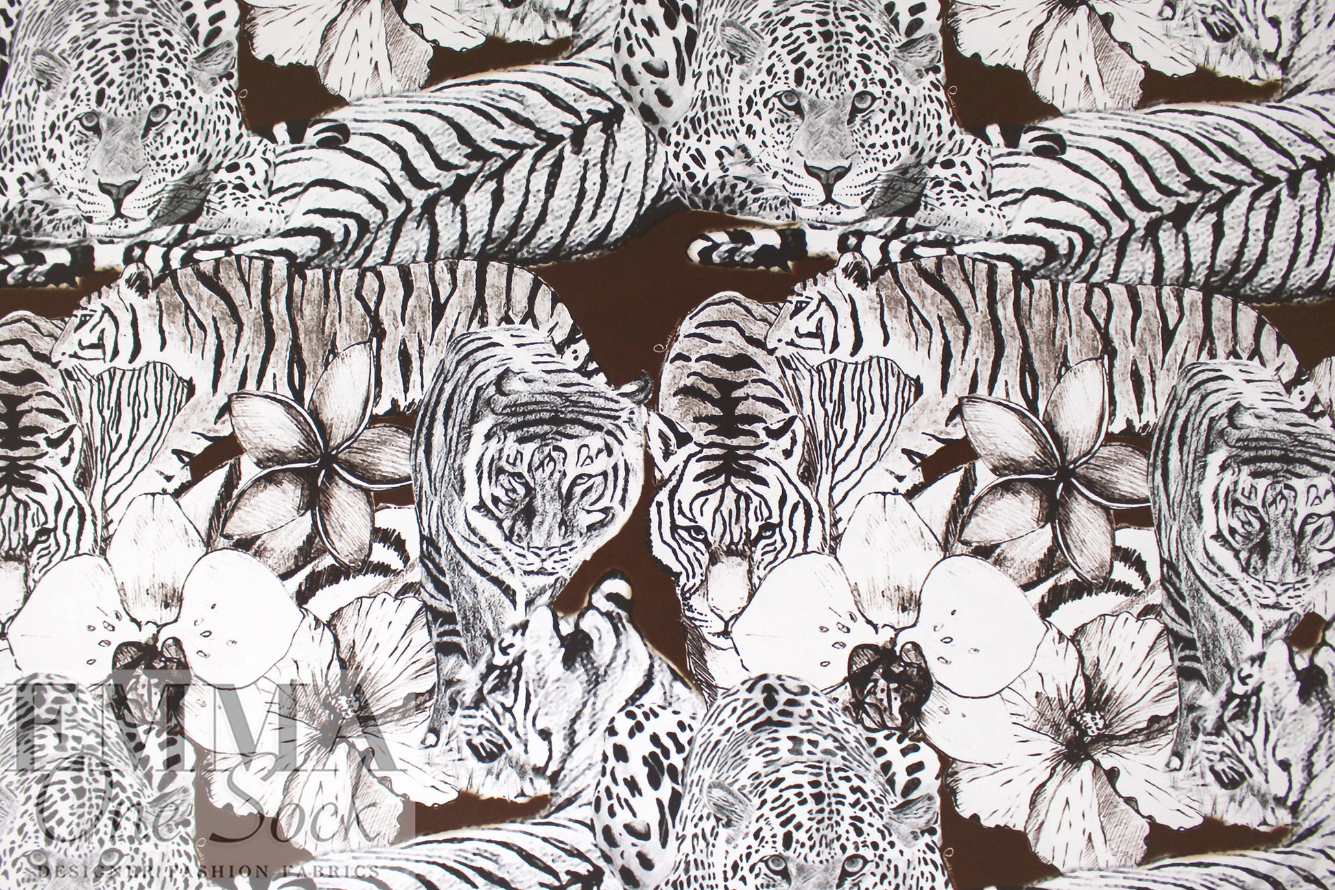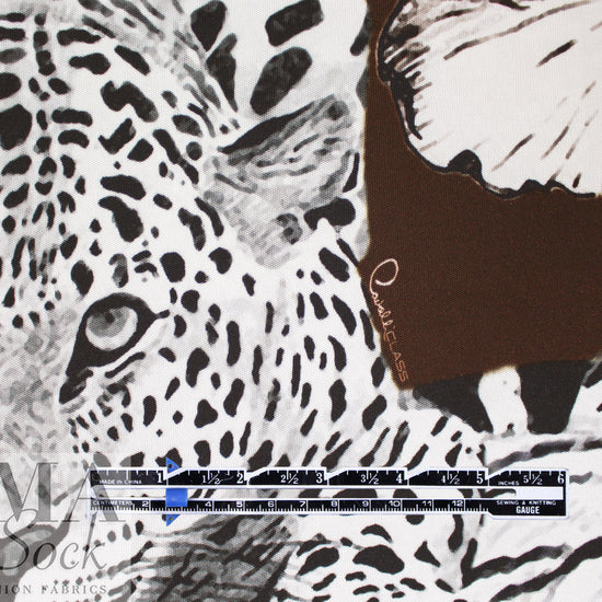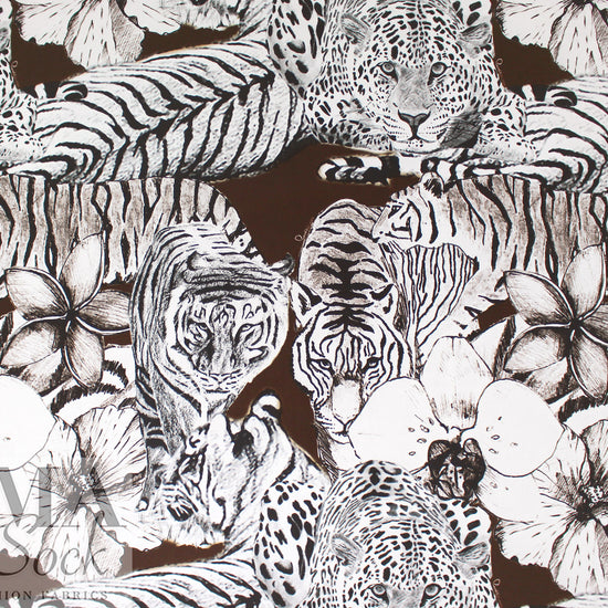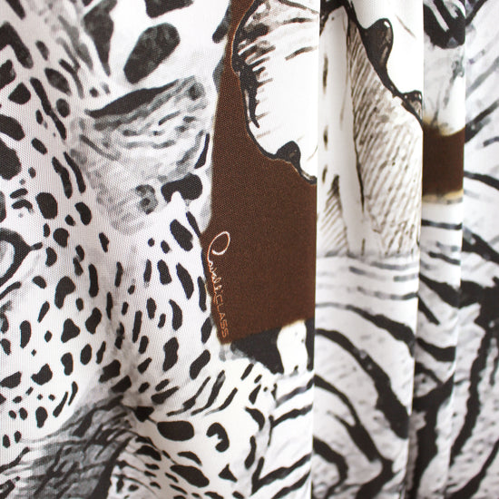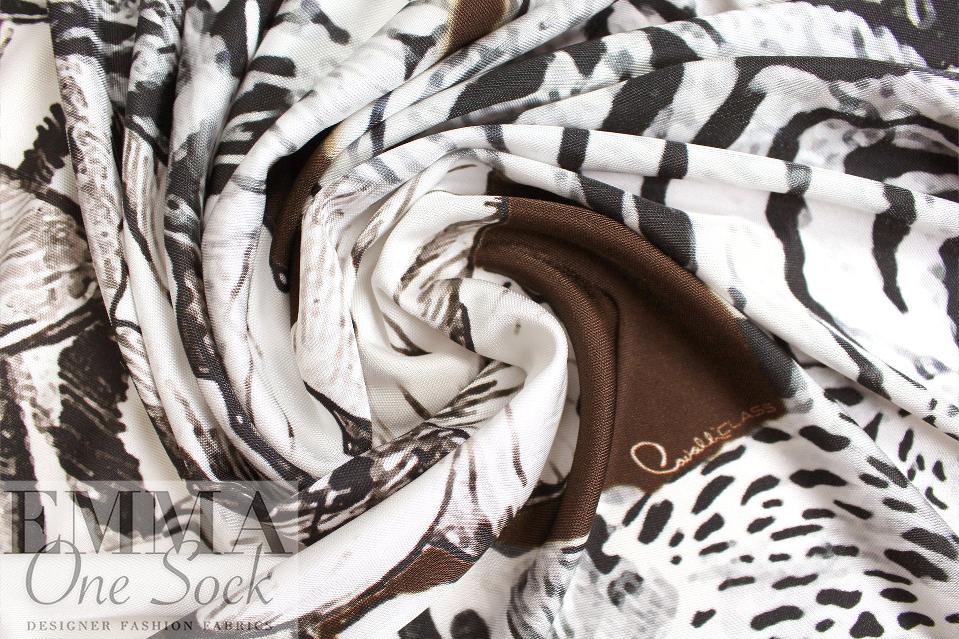 An amazing quality printed Cavalli matte jersey just in from Italy! The fabric has a slightly "slippery", drapey quality that skims rather than clings to the body to create a flattering silhouette. It is lightweight yet opaque with a liquid drape, and while it has 20% widthwise stretch, it is very stable. The dramatic "big cat garden" design is stunning, featuring tones of black, gray, coffee, pearl, etc. (PANTONE 17-5102, 19-0814, etc.). Perfect for tops, tees, tunic, dress, maxi dress, wrap dress ala DVF, etc. Hand wash and hang to dry (please test first) or dry clean.