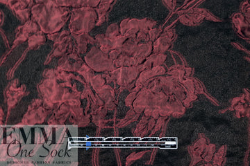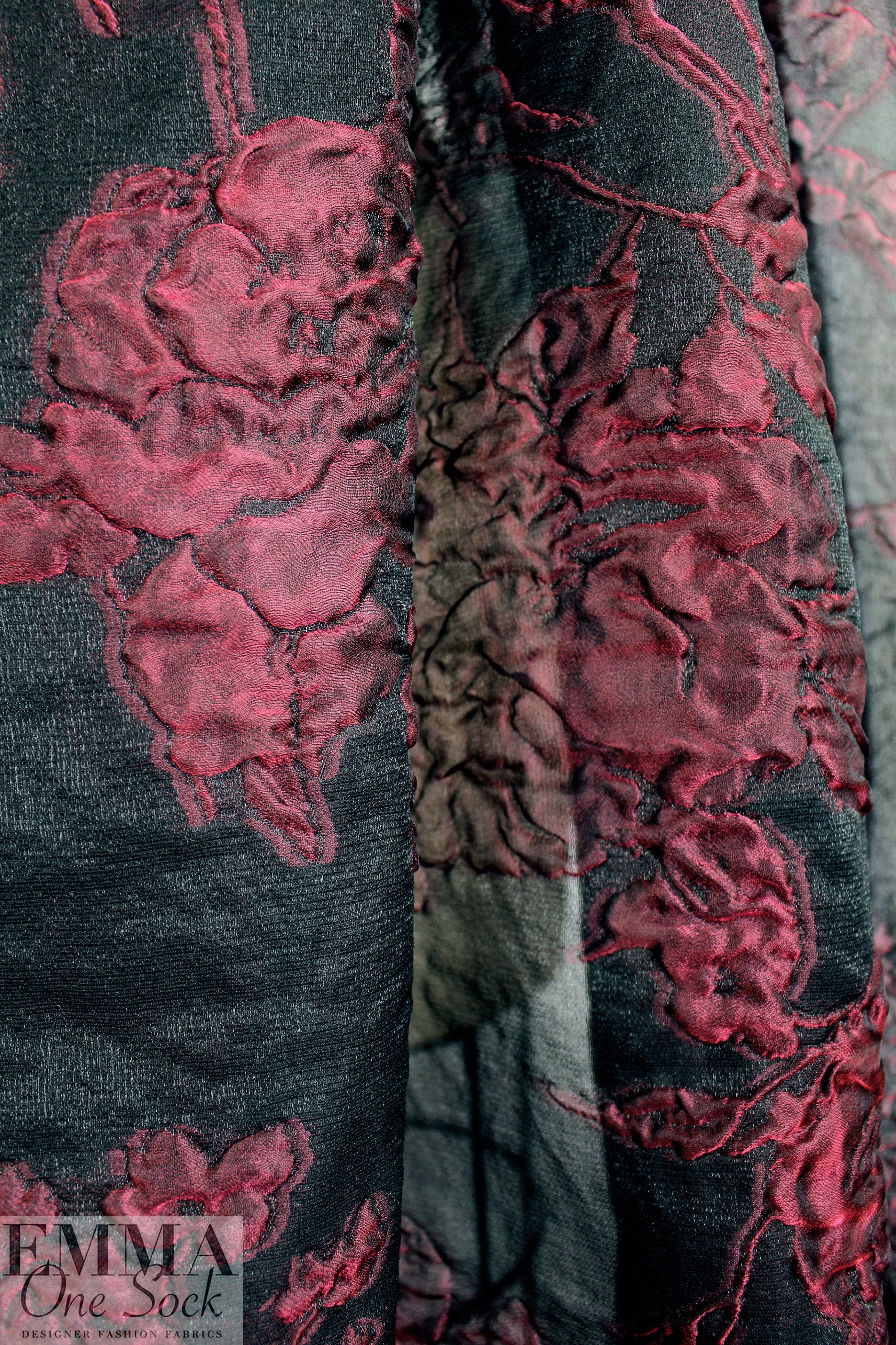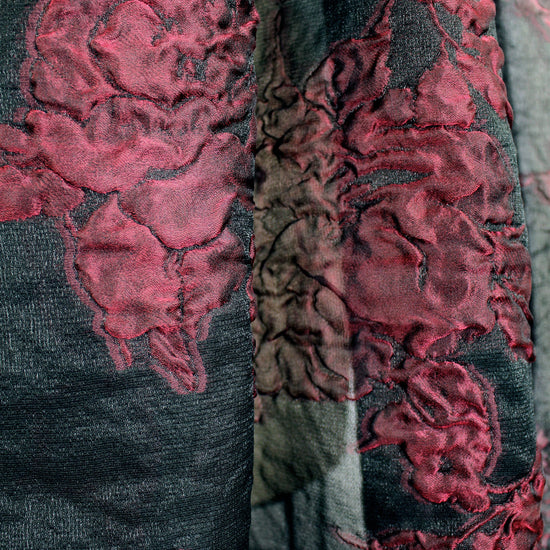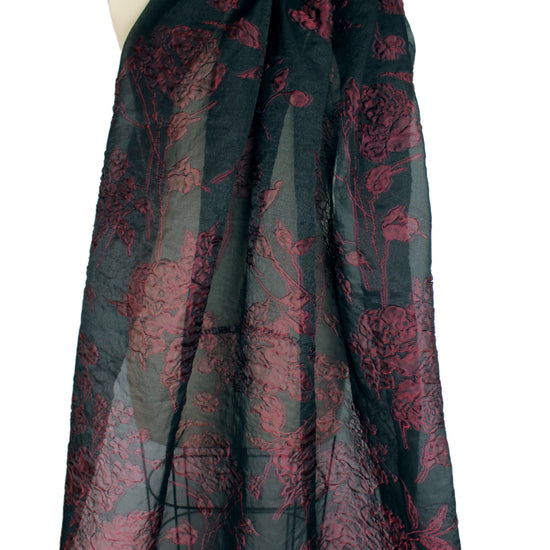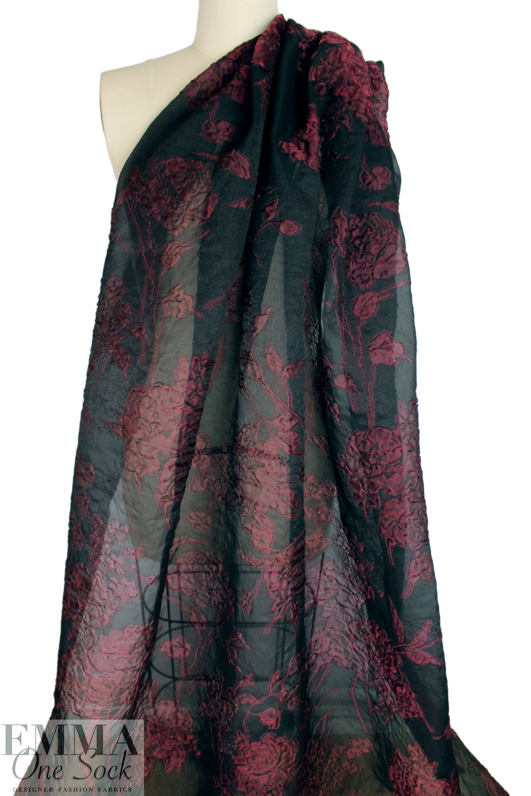 This new arrival from Italy is SO exquisite... mostly silk, light, sheer and crisp with a dressy bit of sparkle. The fabric has a cloque' weave (highly textured surface with no backing) with a gorgeous floral motif in an irridescent-like merlot/plum and black (PANTONE 19-2025 is close). The fabric is dimensional yet ethereal, similar to organza. Best for a special occasion garment such as a structured dress, skirt, sheer overjacket, tunic, etc. Some styles will need lining or layering. Dry clean only.