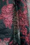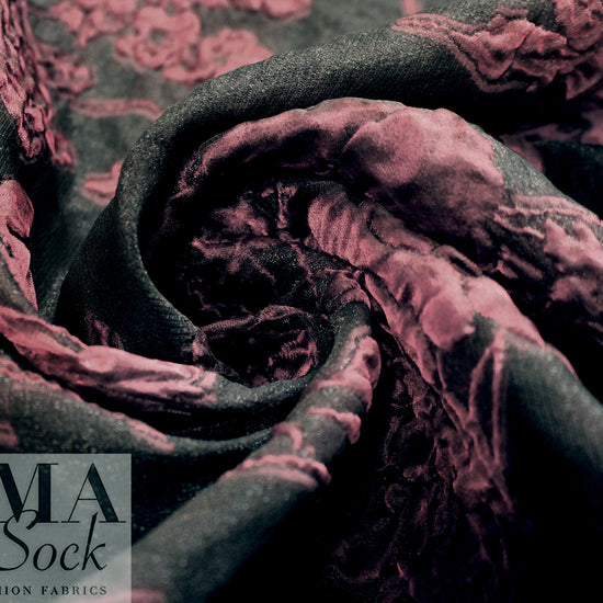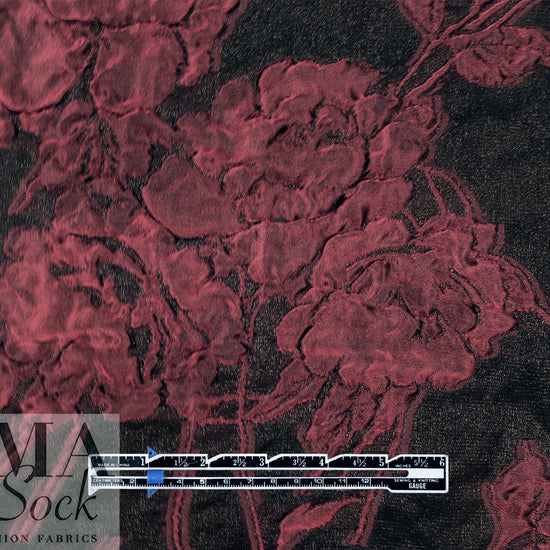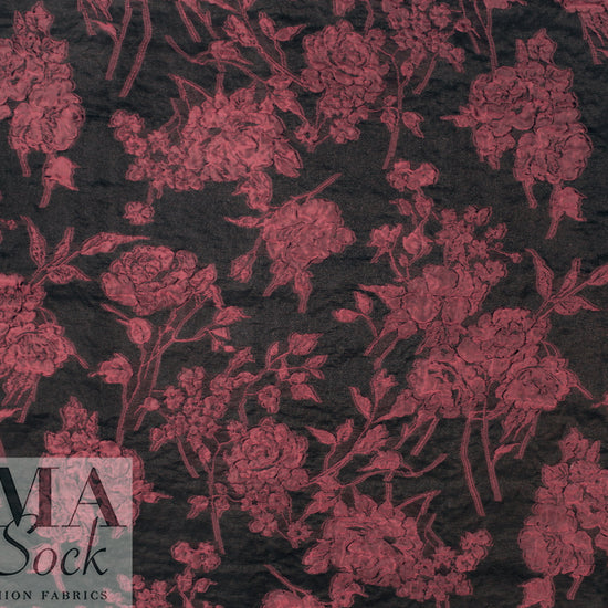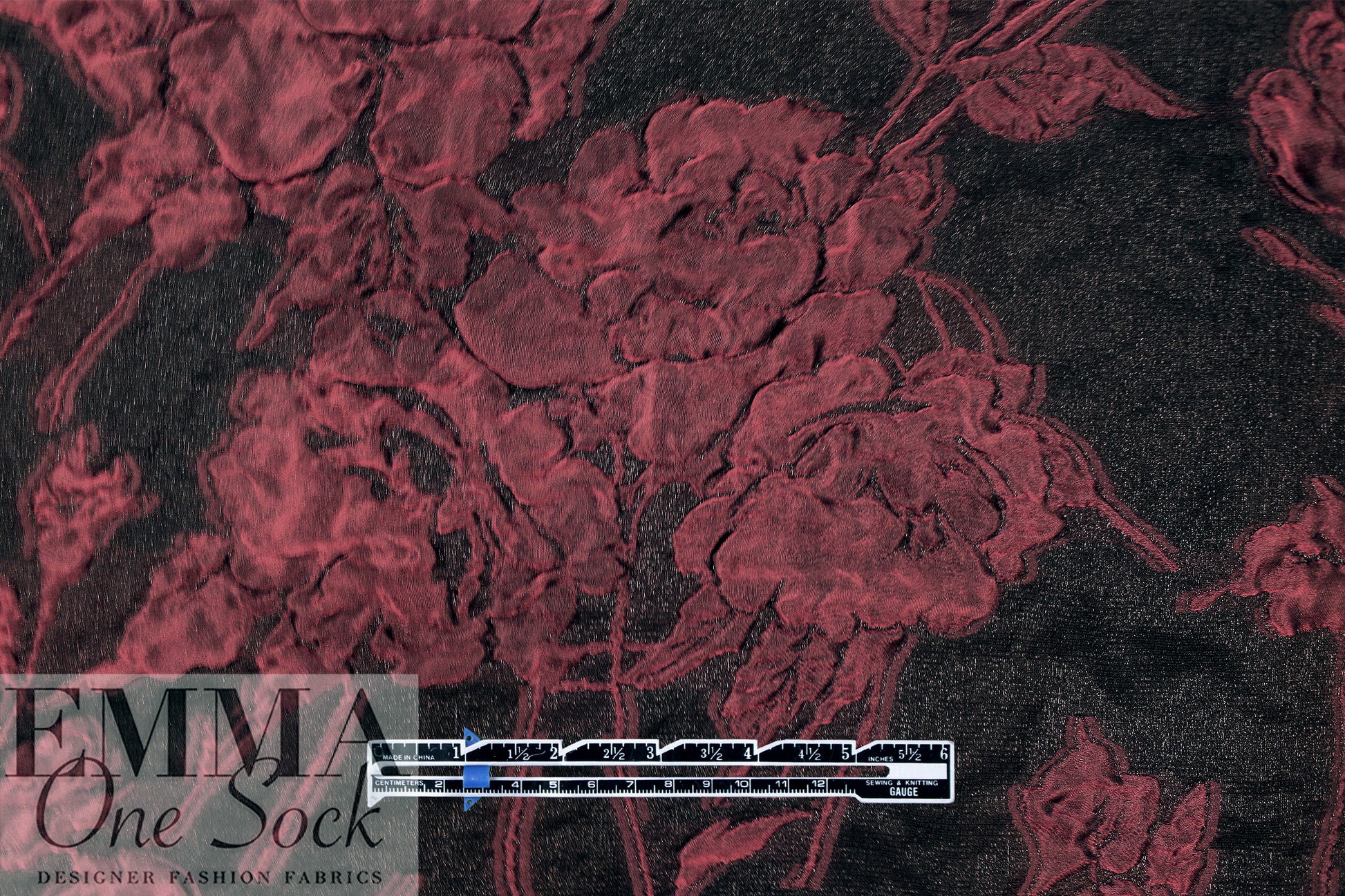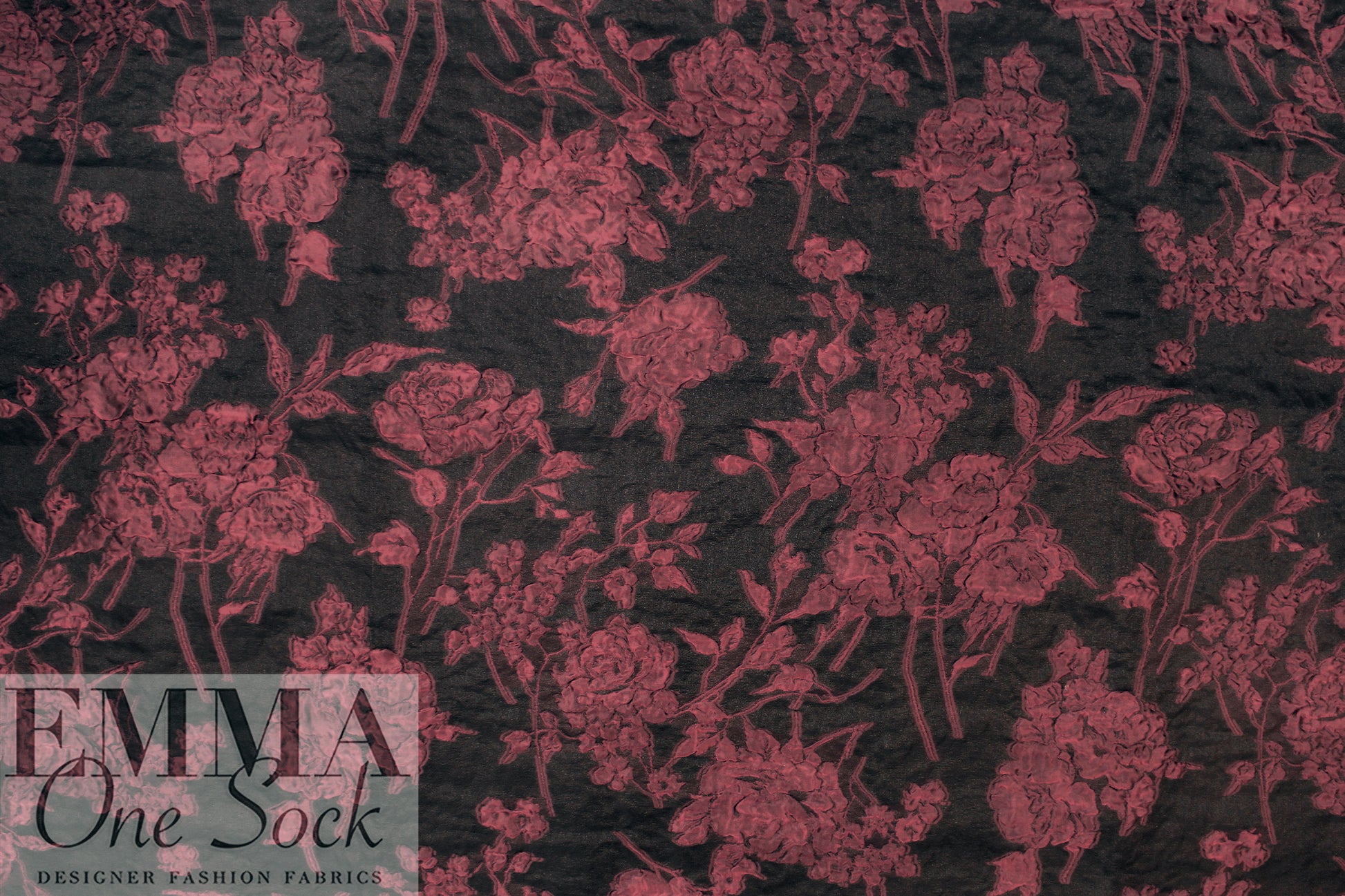 This new arrival from Italy is SO exquisite... mostly silk, light, sheer and crisp with a dressy bit of sparkle. The fabric has a cloque' weave (highly textured surface with no backing) with a gorgeous floral motif in an irridescent-like merlot/plum and black (PANTONE 19-2025 is close). The fabric is dimensional yet ethereal, similar to organza. Best for a special occasion garment such as a structured dress, skirt, sheer overjacket, tunic, etc. Some styles will need lining or layering. Dry clean only.