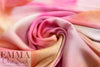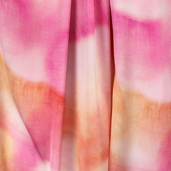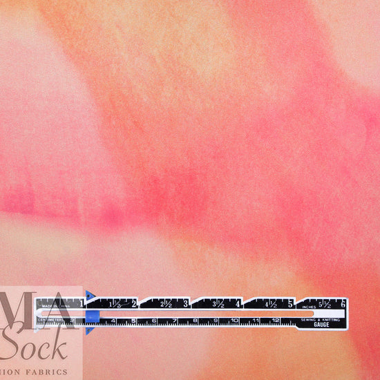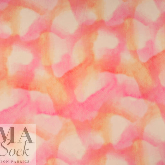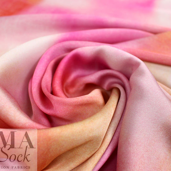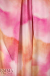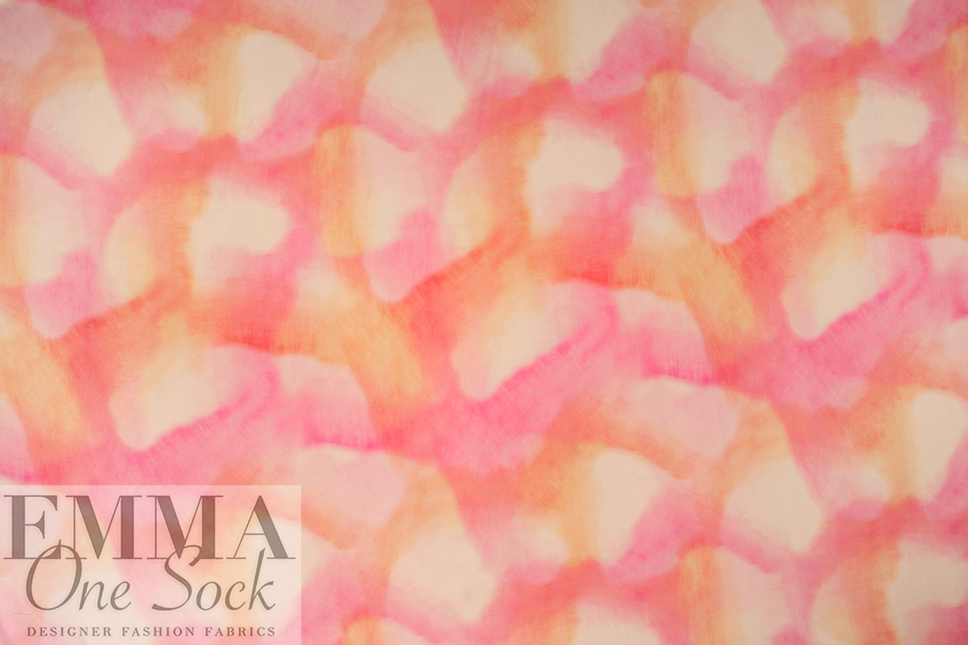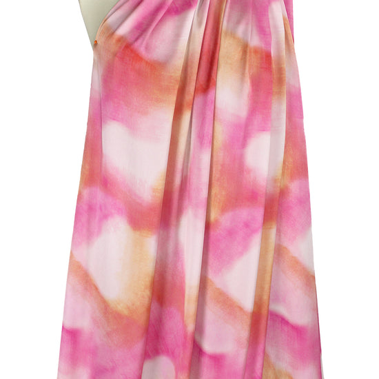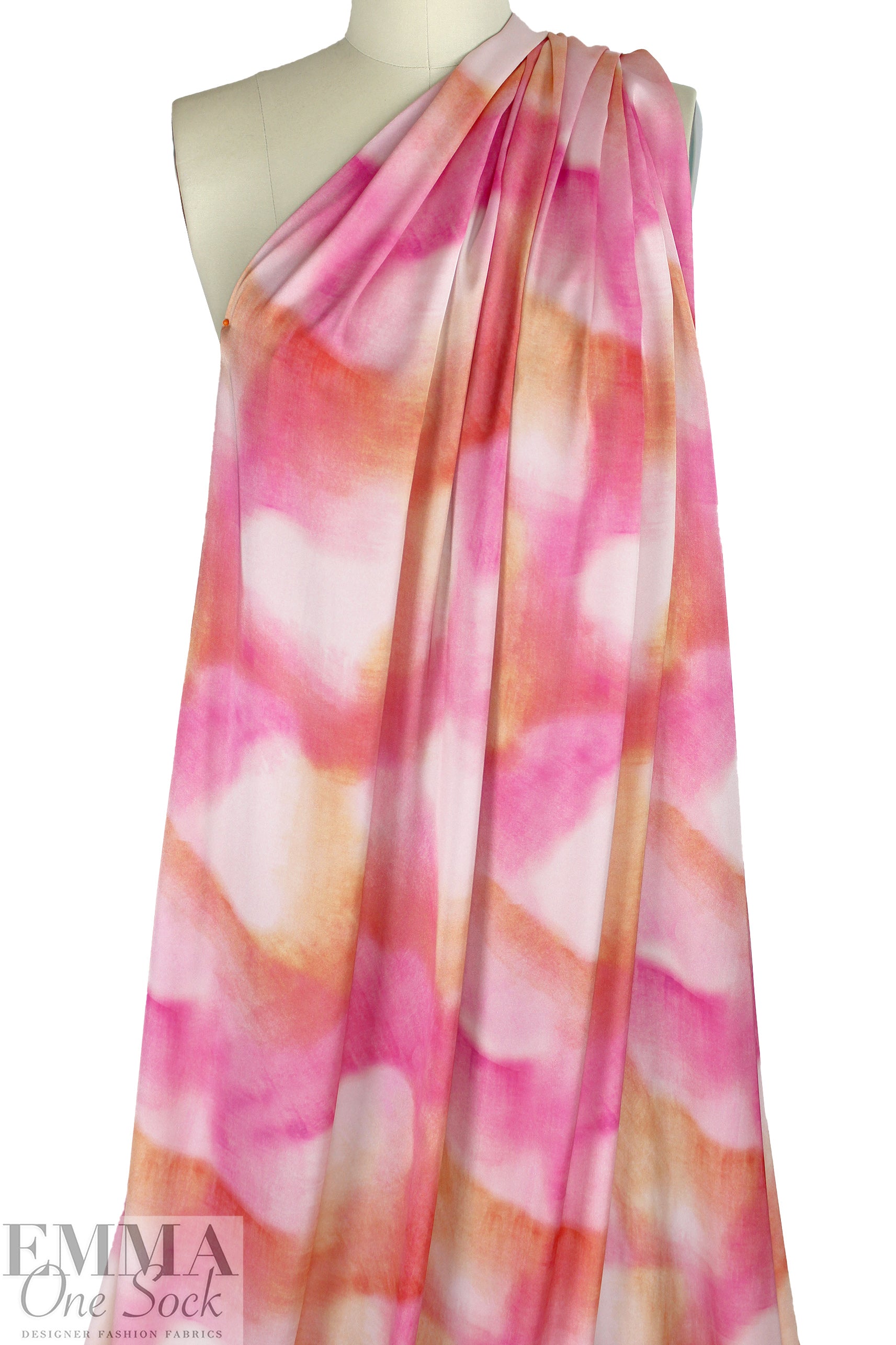 From an Italian mill, this is a new technology polyester woven that mimics the qualities of silk, and this one is similar to a silk charmeuse. It's a drapey blouse weight woven, nearly opaque, and a beautiful quality and affordable alternative to silk. The print is a beautiful "dream shapes" abstract (25" repeat) in shades of pink, orange and blush (PANTONE 15-2215, 13-1027, 12-1304, etc.). It is a versatile weight that would be perfect for a shirt or blouse, top, tunic, kimono jacket, etc. Test first if you would like to hand or machine wash and hang to dry.