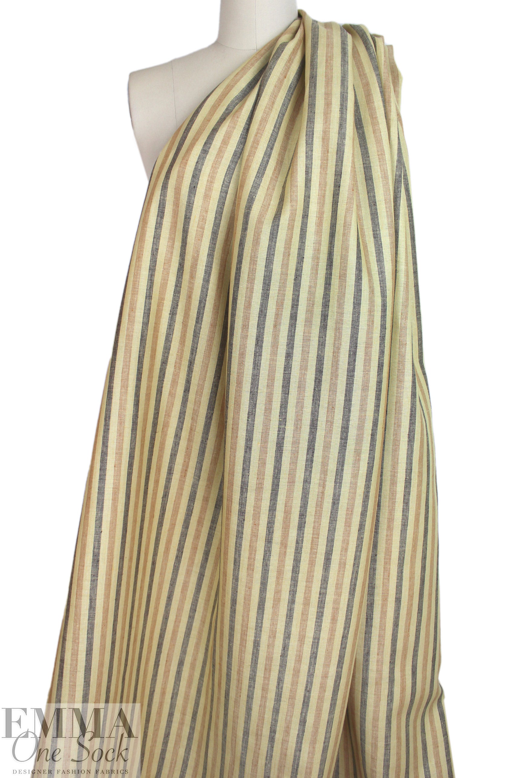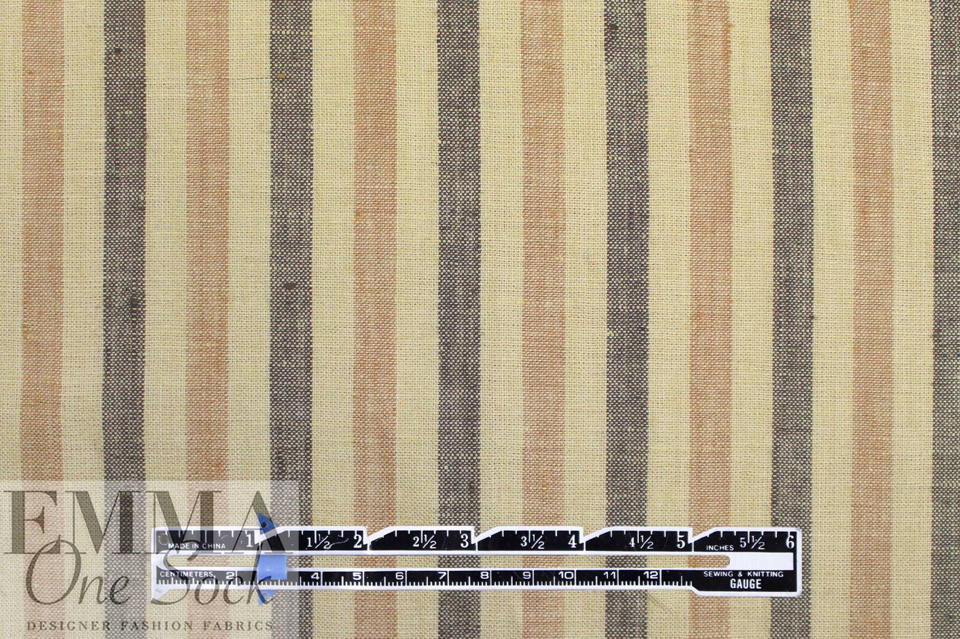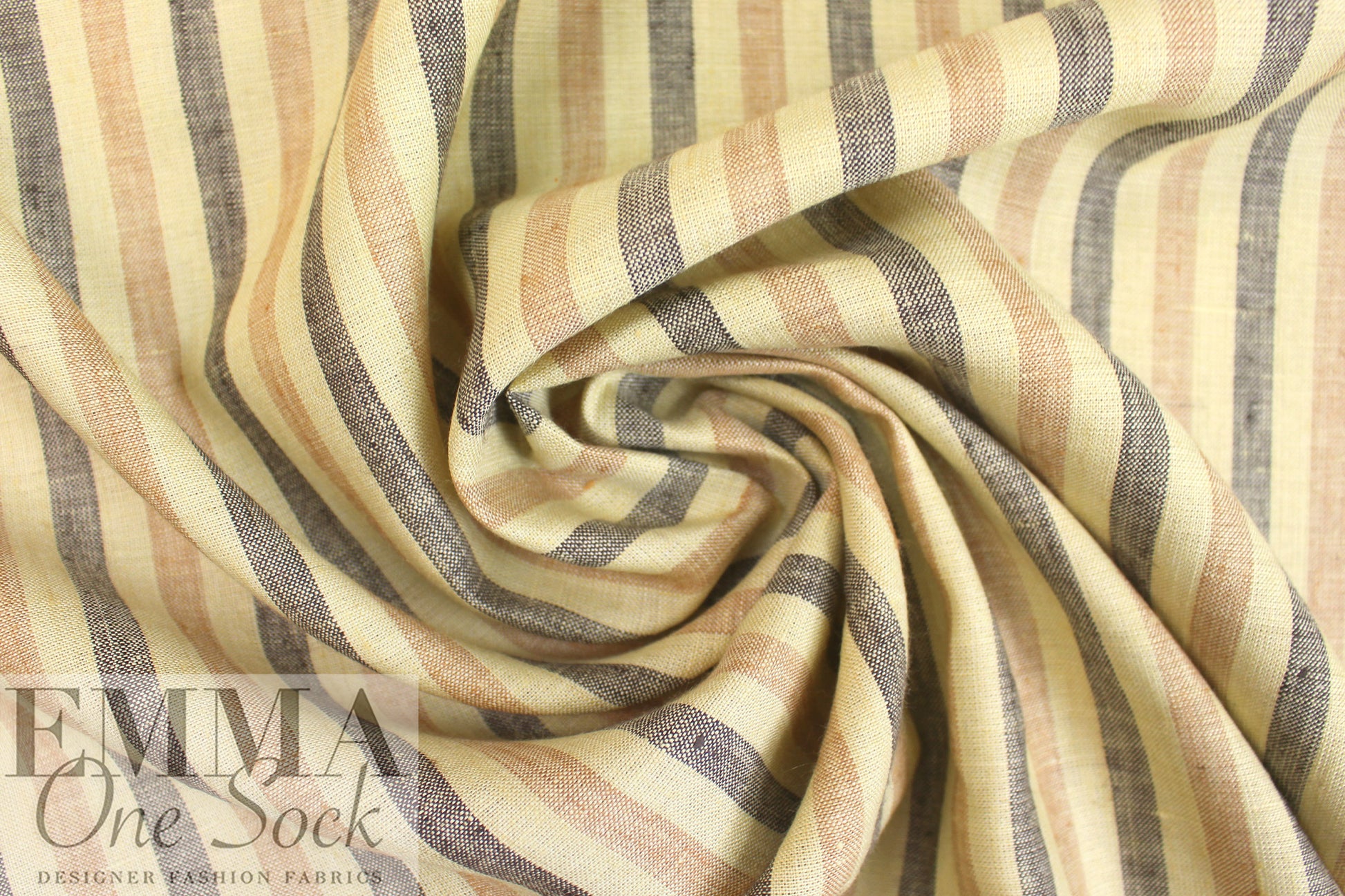 This is a beautiful medium-light weight linen woven with yarn-dyed stripes running vertically. It is nearly opaque with some body in the drape. The stripes (1.5" repeat) are woven in, not printed, alternating in maize, umber and nougat (PANTONE 12-0712, 19-0810, 16-1334) and it looks the same on both sides. This is a fantastic fabric for a structured or slightly drapey projects. Make a tunic, overshirt, lined dress, beach cover-up, casual pants, etc. Test first if you wish to hand or machine wash and hang to dry, or dry clean.