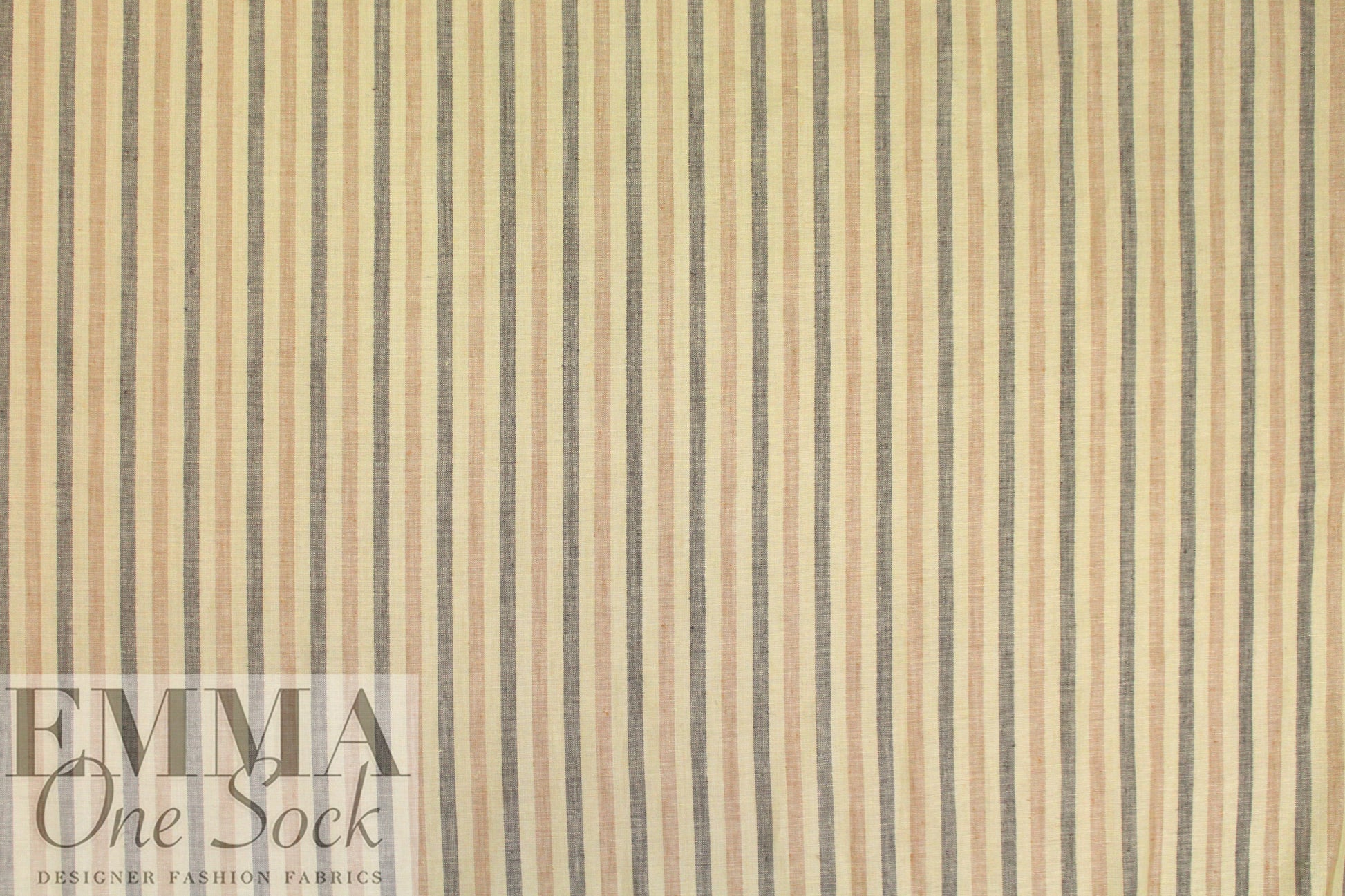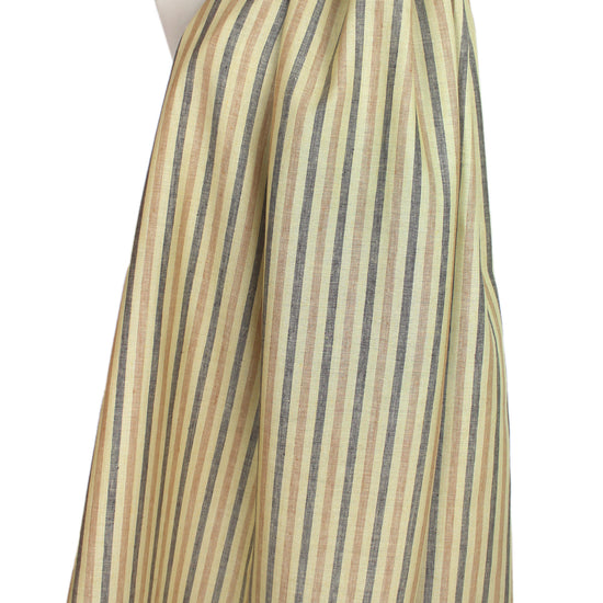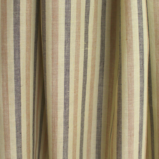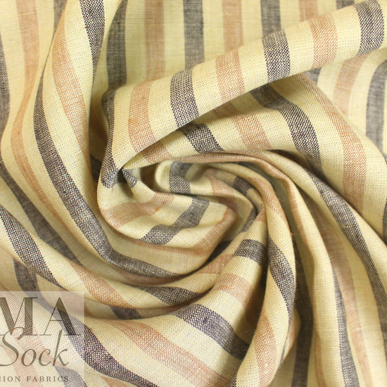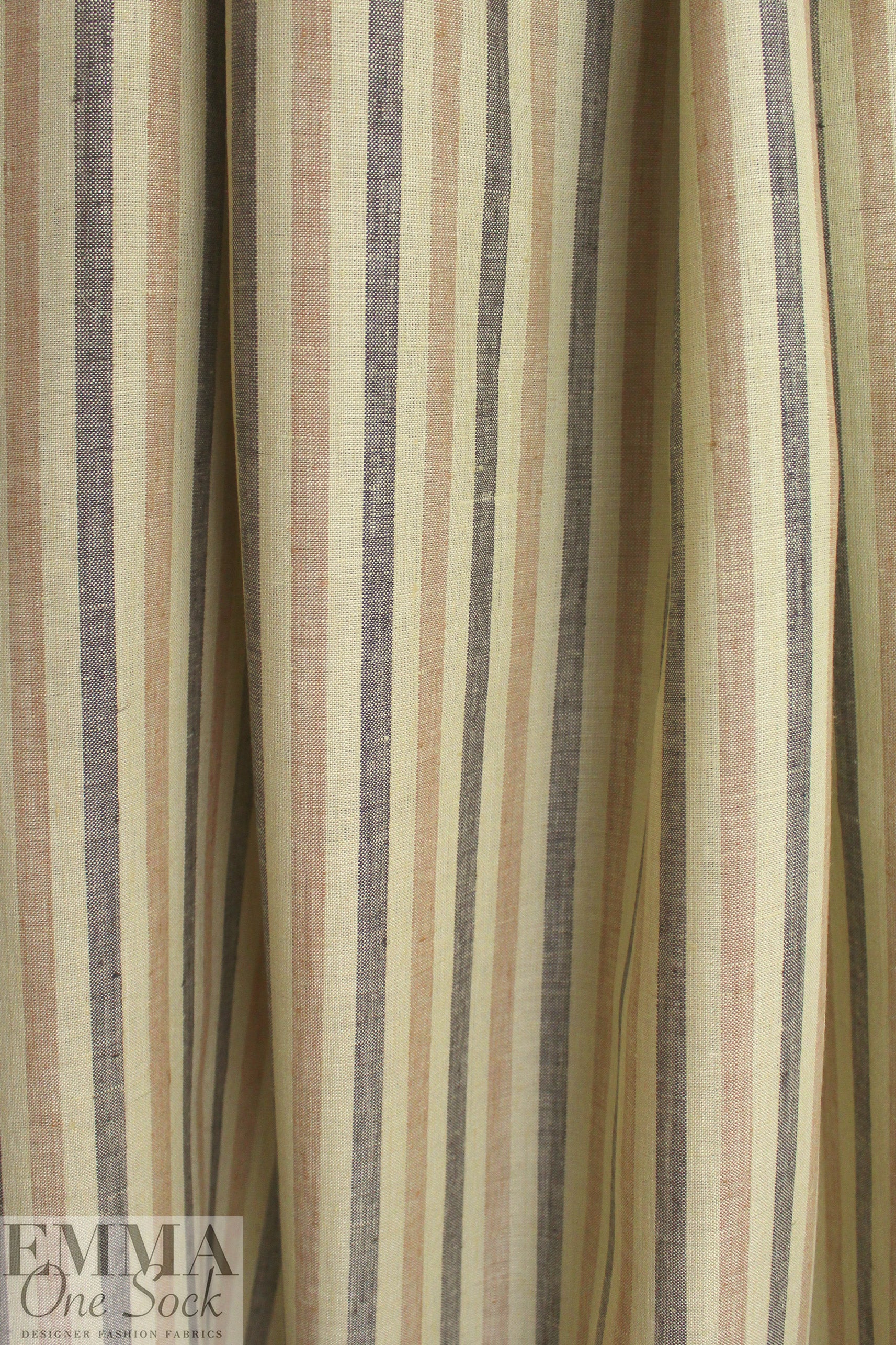 This is a beautiful medium-light weight linen woven with yarn-dyed stripes running vertically. It is nearly opaque with some body in the drape. The stripes (1.5" repeat) are woven in, not printed, alternating in maize, umber and nougat (PANTONE 12-0712, 19-0810, 16-1334) and it looks the same on both sides. This is a fantastic fabric for a structured or slightly drapey projects. Make a tunic, overshirt, lined dress, beach cover-up, casual pants, etc. Test first if you wish to hand or machine wash and hang to dry, or dry clean.
