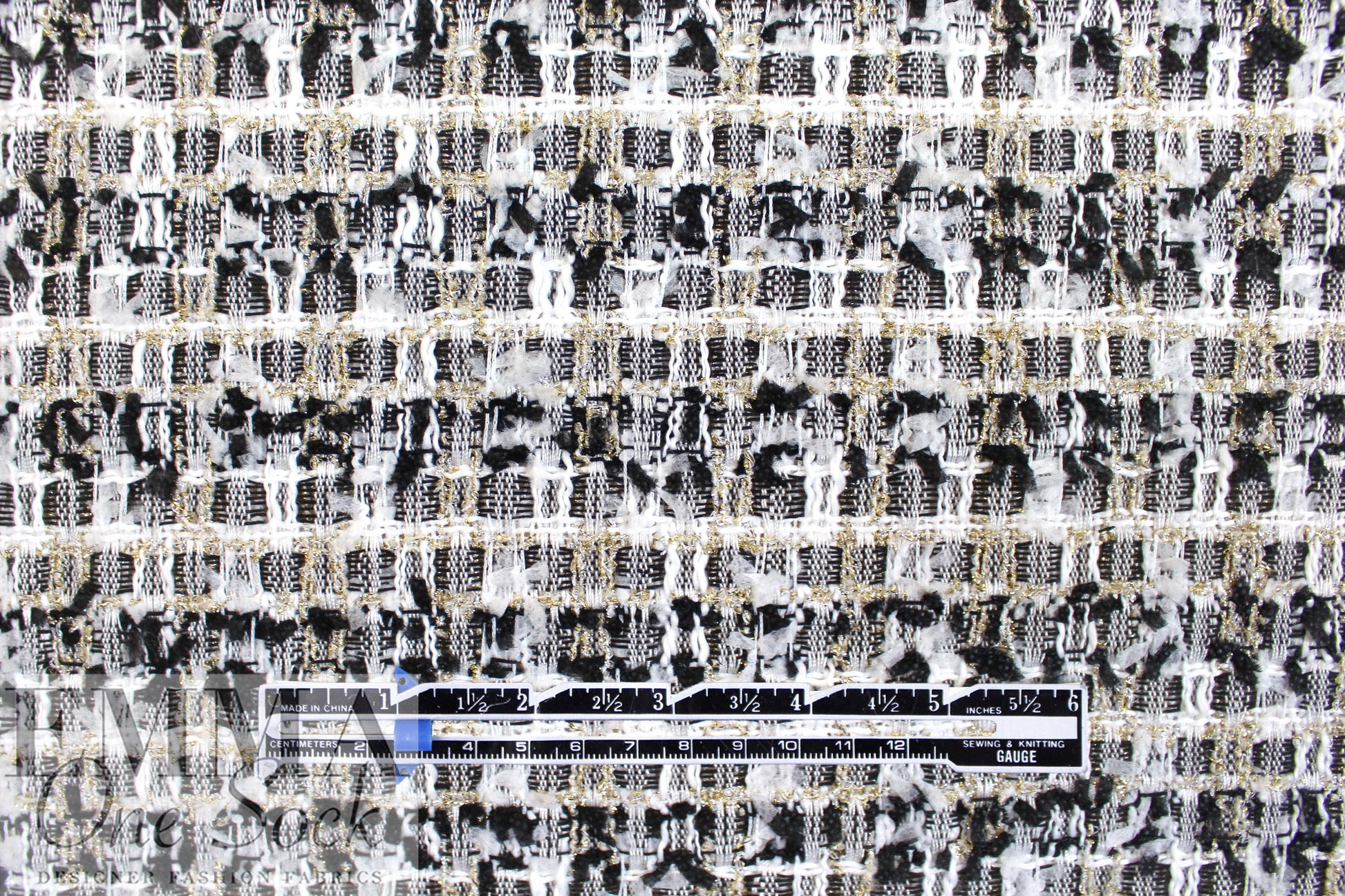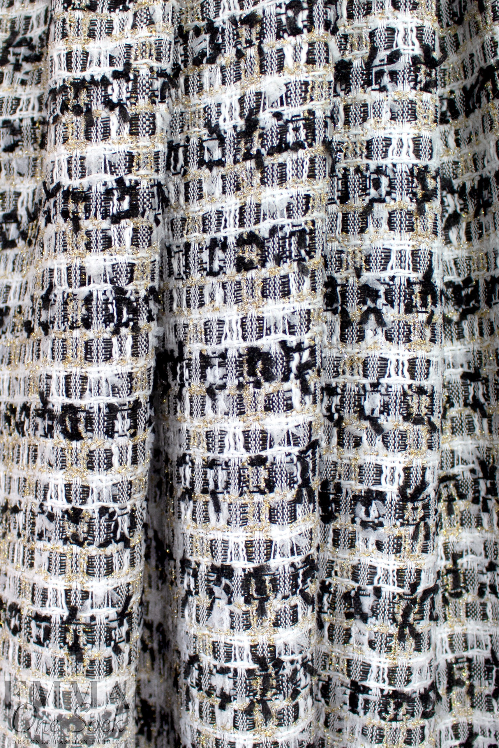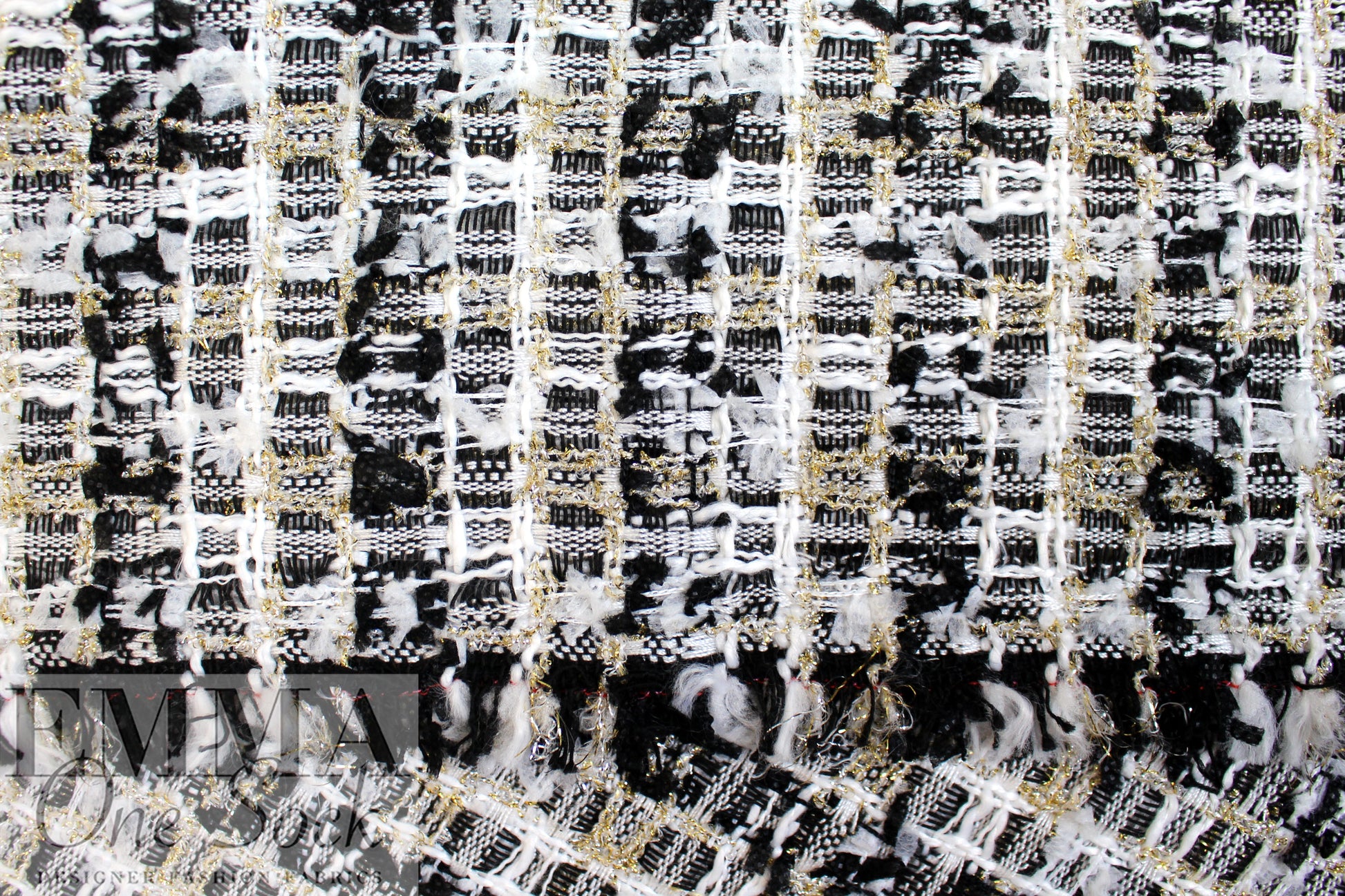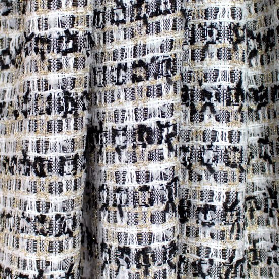 This is a wonderful Chanel-style boucle' with an eye-catching, high contrast combination of black, white and sparkly gold. It has fibers of varying thicknesses and textures as well as fine metallic threads woven in an intricate basketweave with roughly a 1.5"repeat. This fabric has a very slightly open, yet nearly opaque weave with fringed selvages, and it can also be fringed across the grain. It is a malleable, medium suiting weight with body in the drape, perfect for Chanel-style jackets, suits, skirt, topper coat, etc. Line with silk charmeuse or Bemberg. Dry cleaning recommended.
