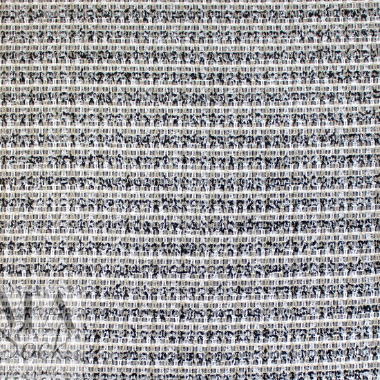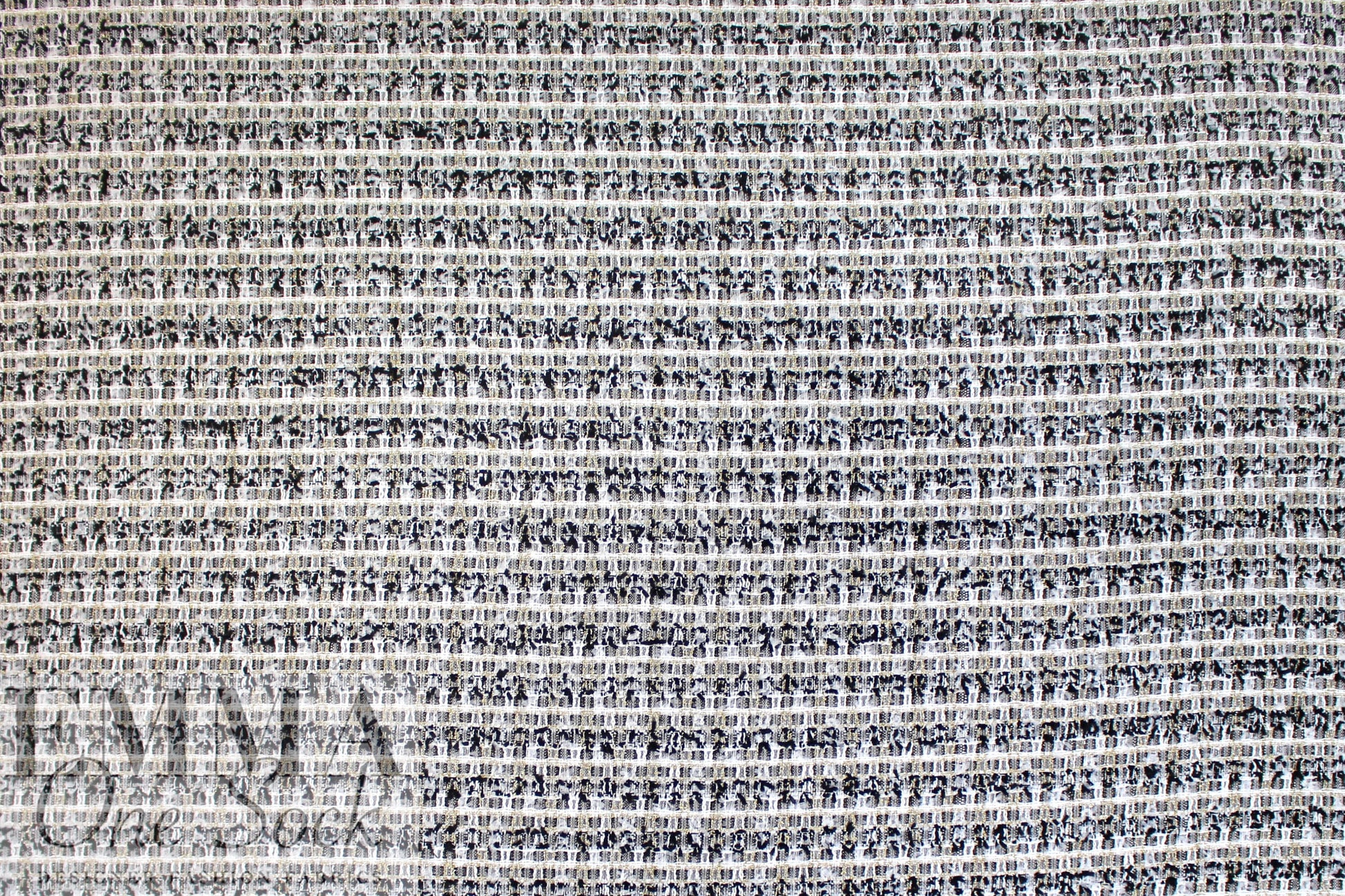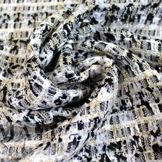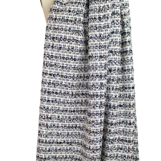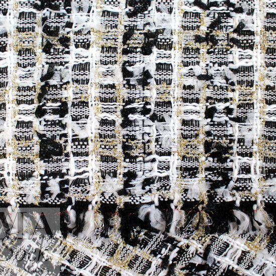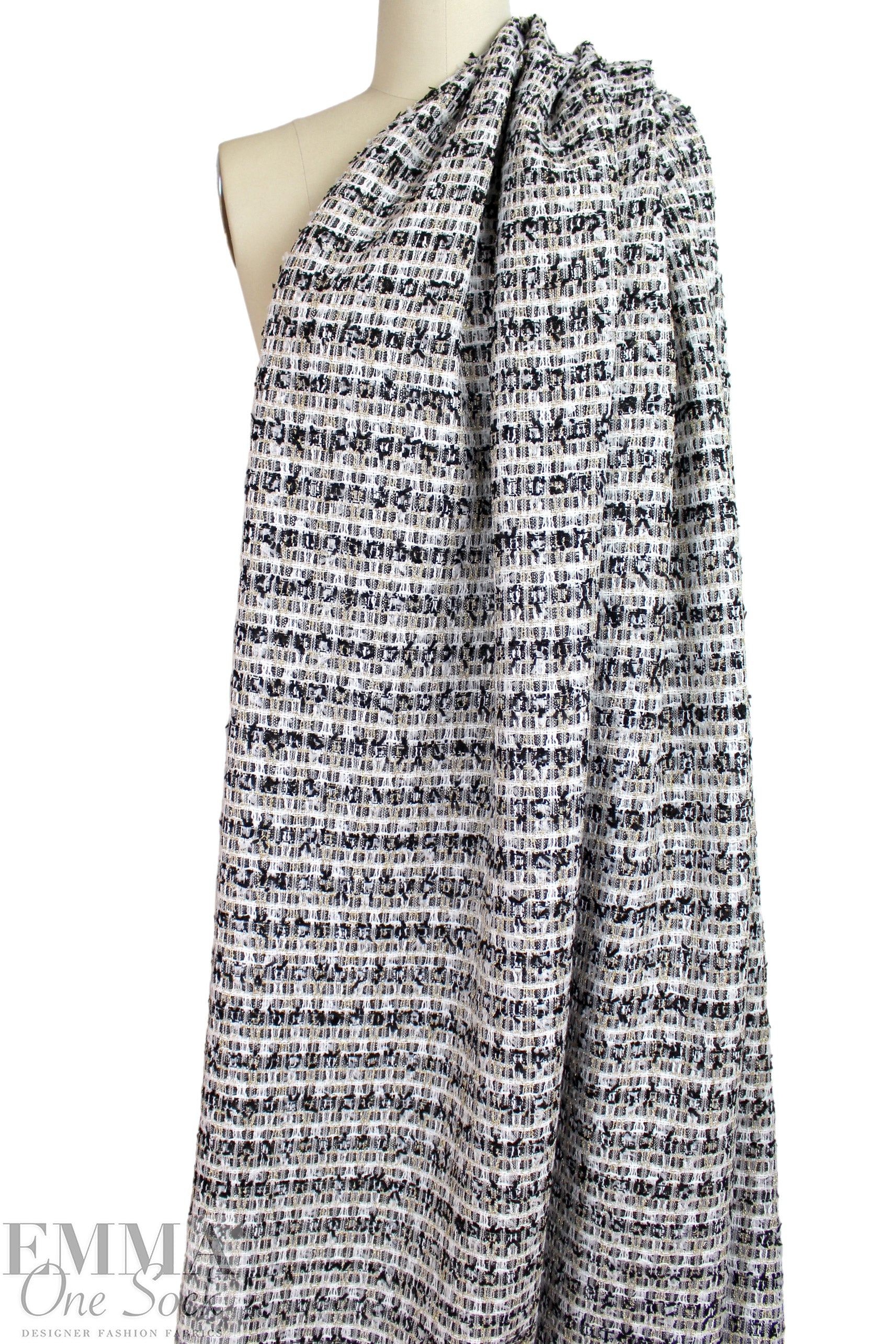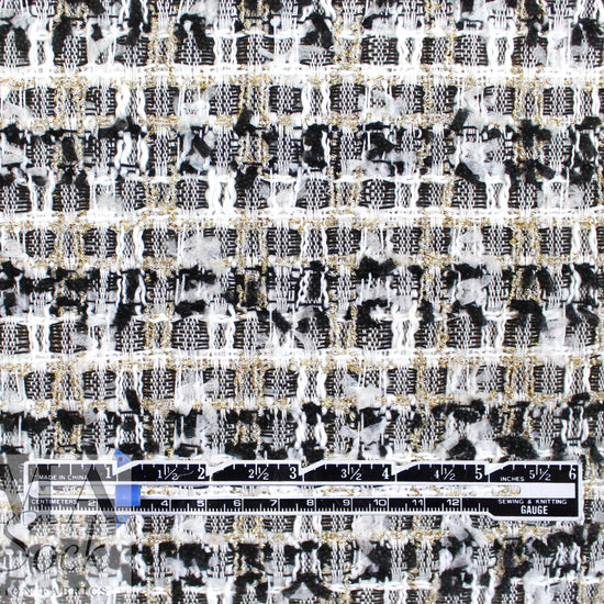 This is a wonderful Chanel-style boucle' with an eye-catching, high contrast combination of black, white and sparkly gold. It has fibers of varying thicknesses and textures as well as fine metallic threads woven in an intricate basketweave with roughly a 1.5"repeat. This fabric has a very slightly open, yet nearly opaque weave with fringed selvages, and it can also be fringed across the grain. It is a malleable, medium suiting weight with body in the drape, perfect for Chanel-style jackets, suits, skirt, topper coat, etc. Line with silk charmeuse or Bemberg. Dry cleaning recommended.