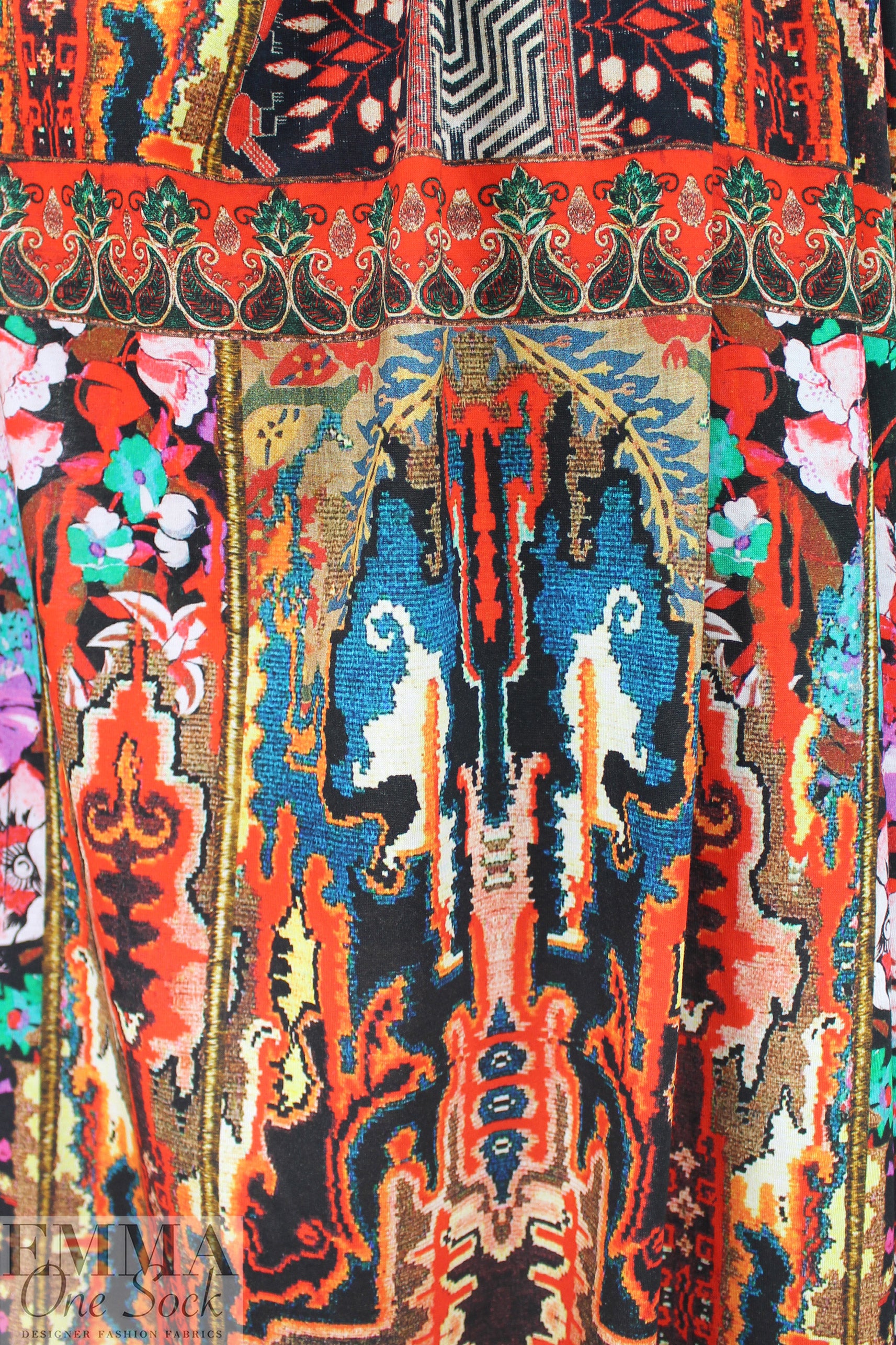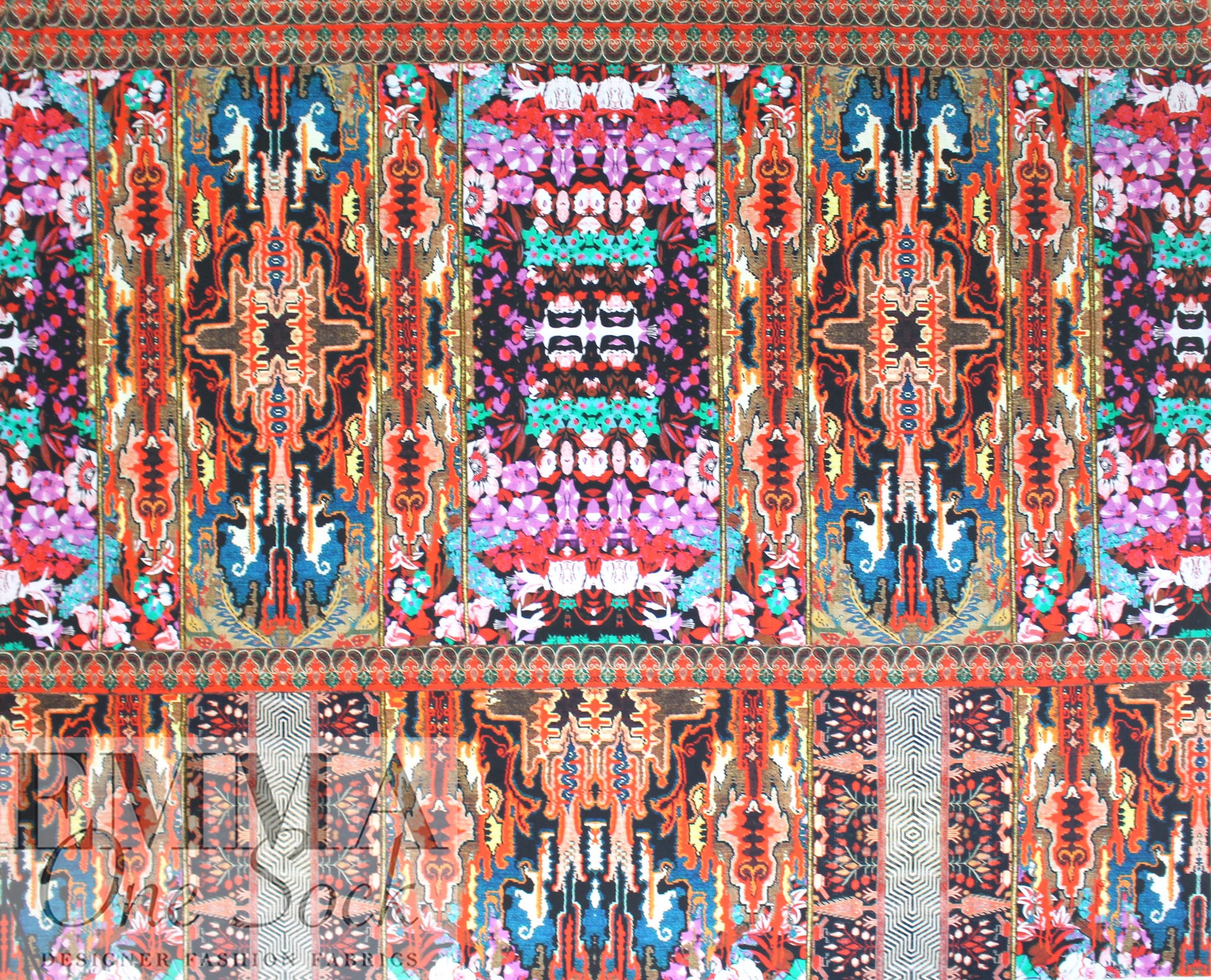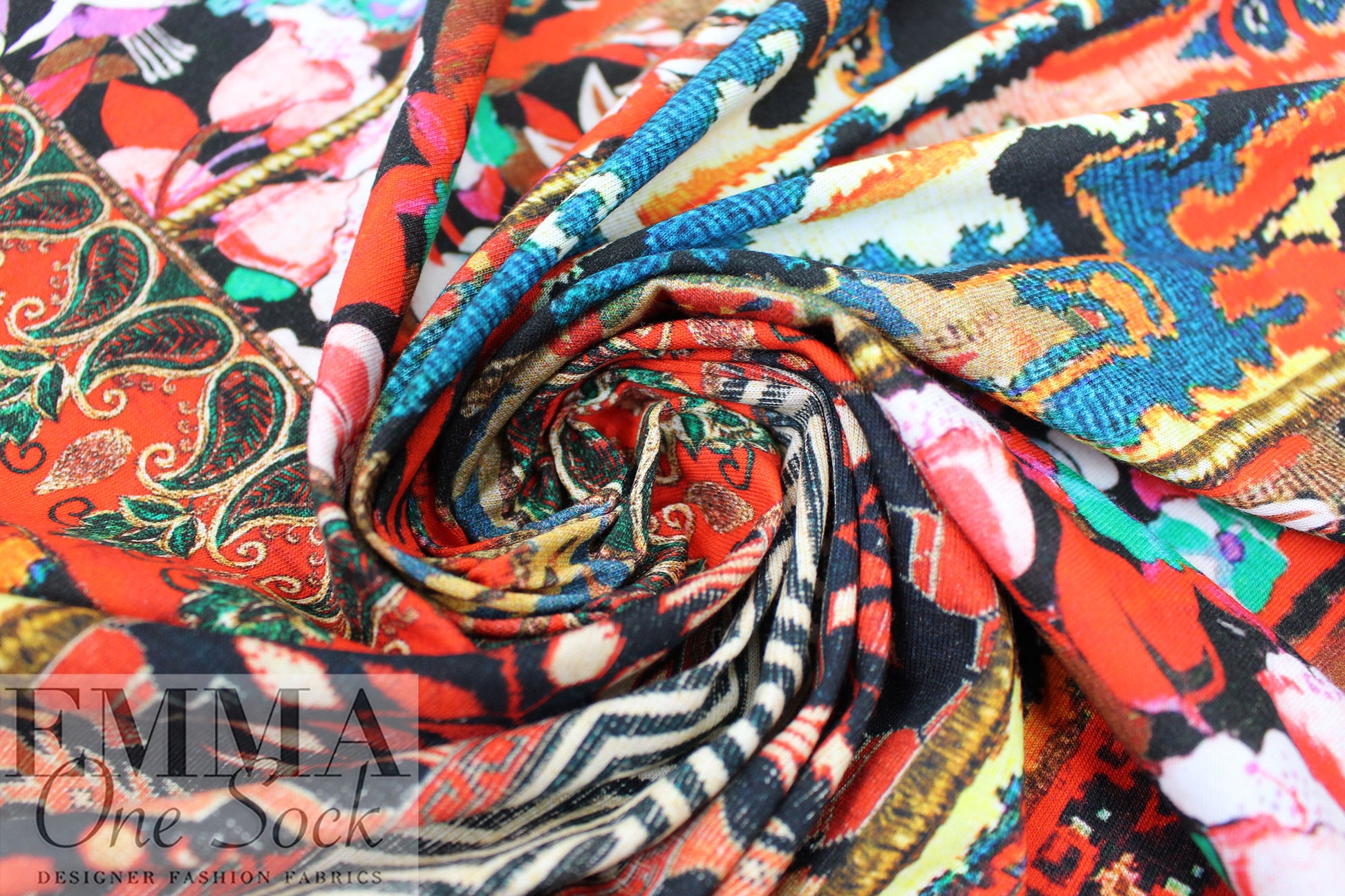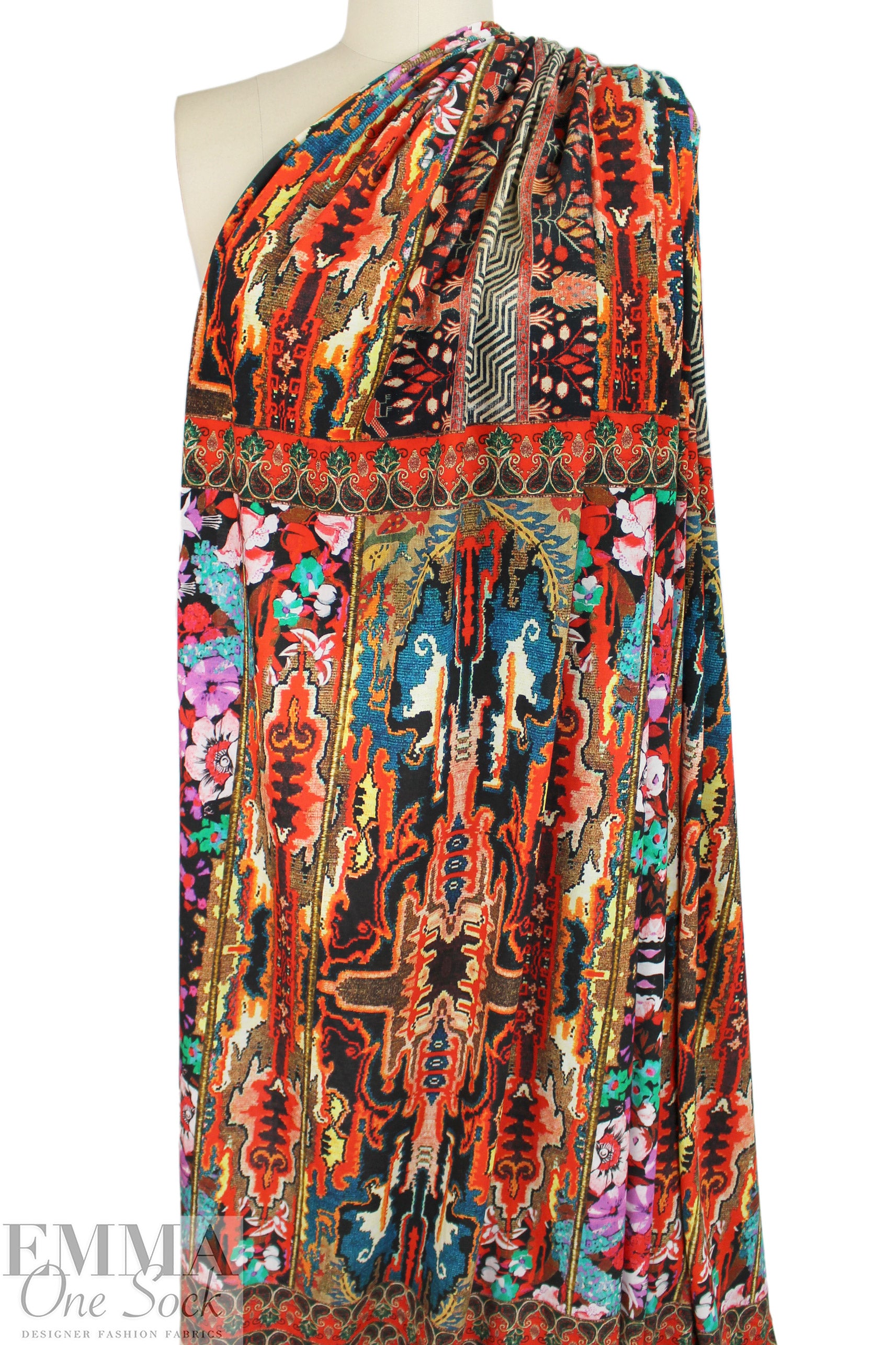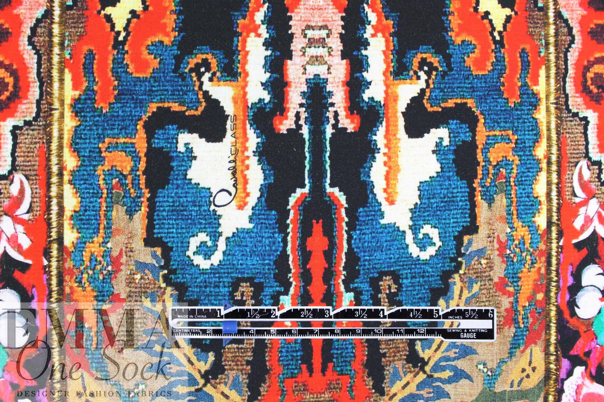 From Italy, this is a fabulous printed cotton knit, lightweight yet opaque with a lovely, soft drape. The beautiful 'Moravian tile' print features various shades of grenadine, topaz, violet, mint, canary, black, white, etc. (PANTONE 17-1558, 18-4535, 16-3320, 17-5937, 12-0633, etc.). It has 20% stretch in the width only. Great for tees, tops, tunics, etc. Beautiful quality! Hand wash or machine wash gentle and hang to dry (please test first!).