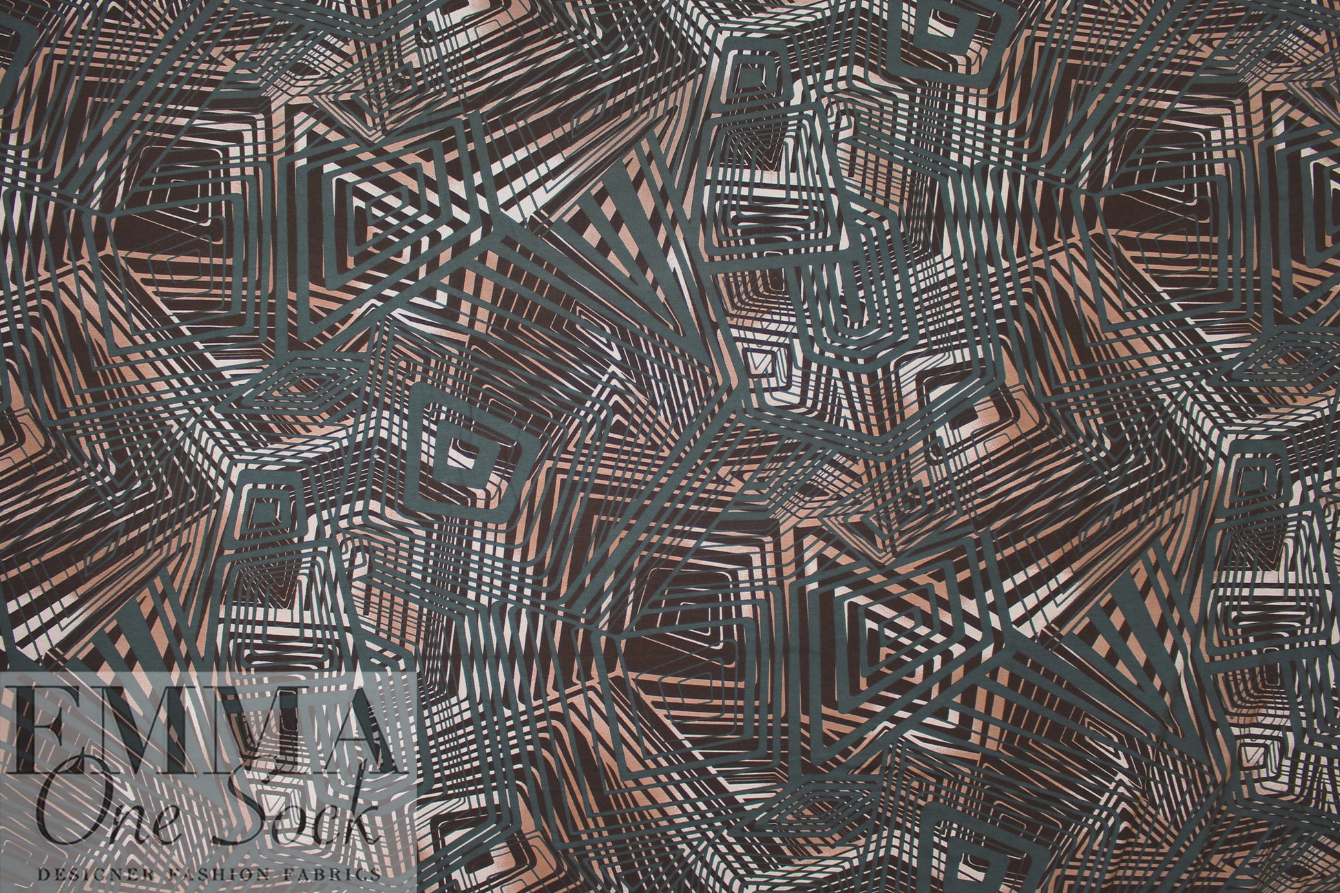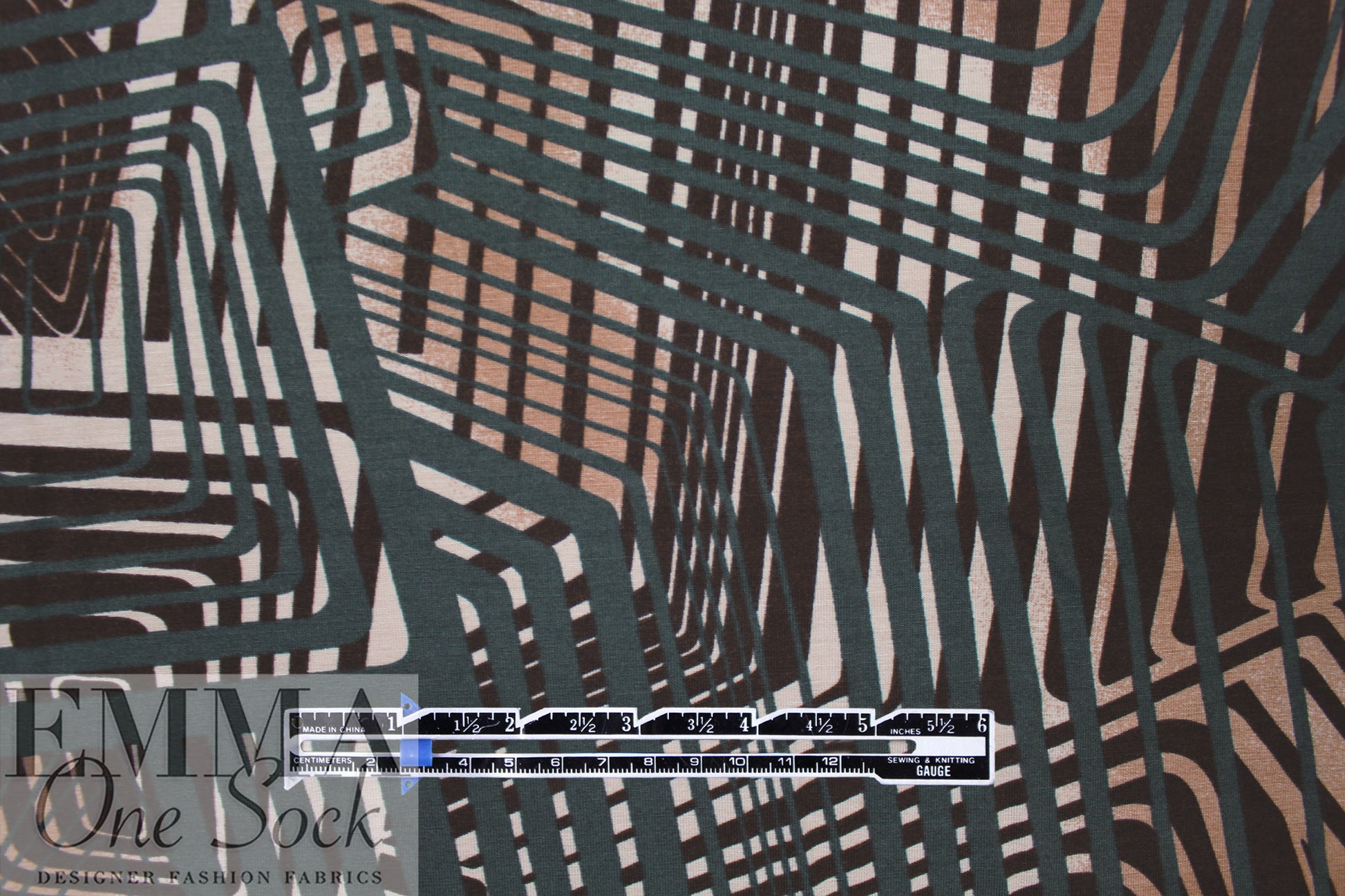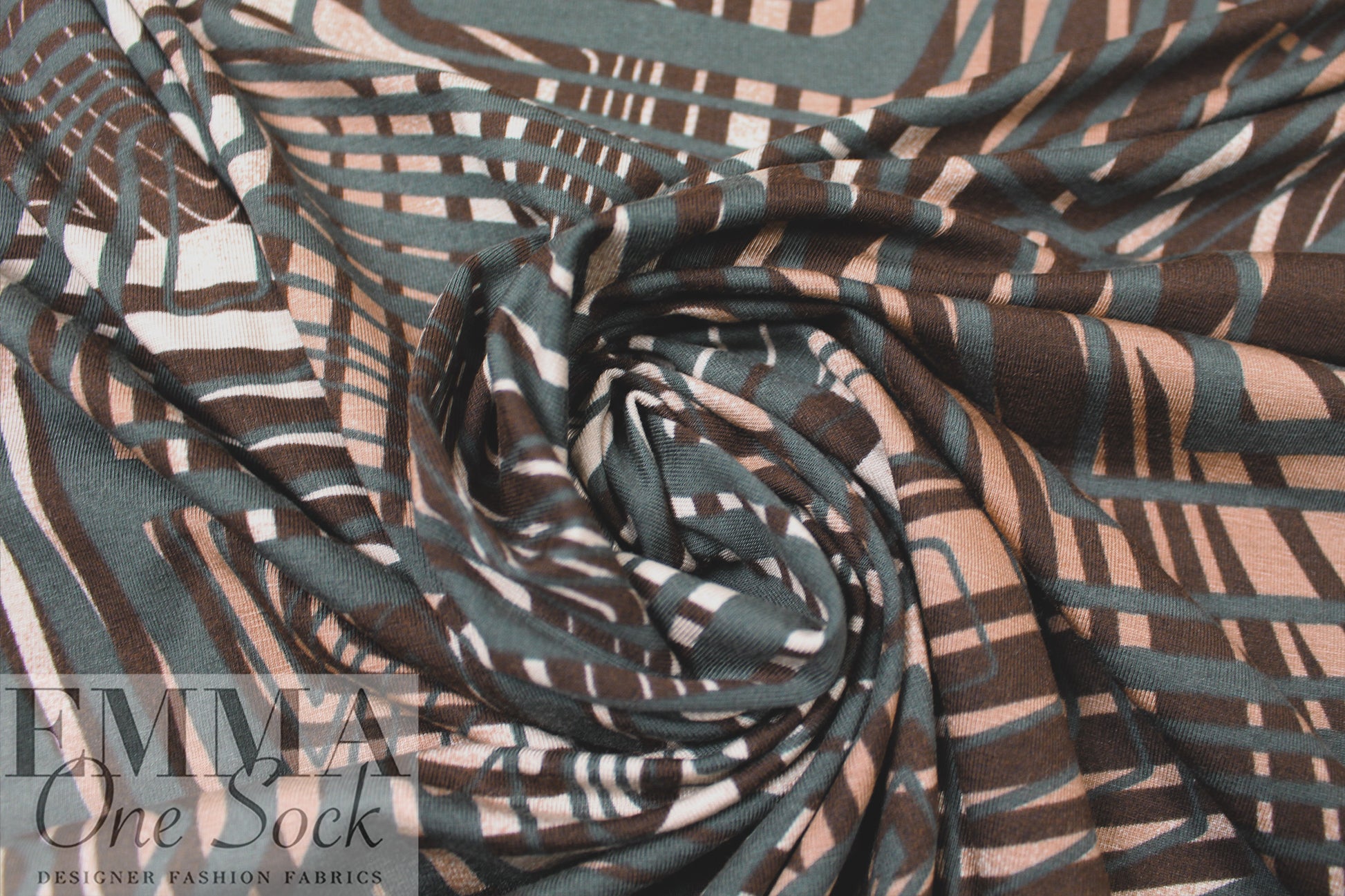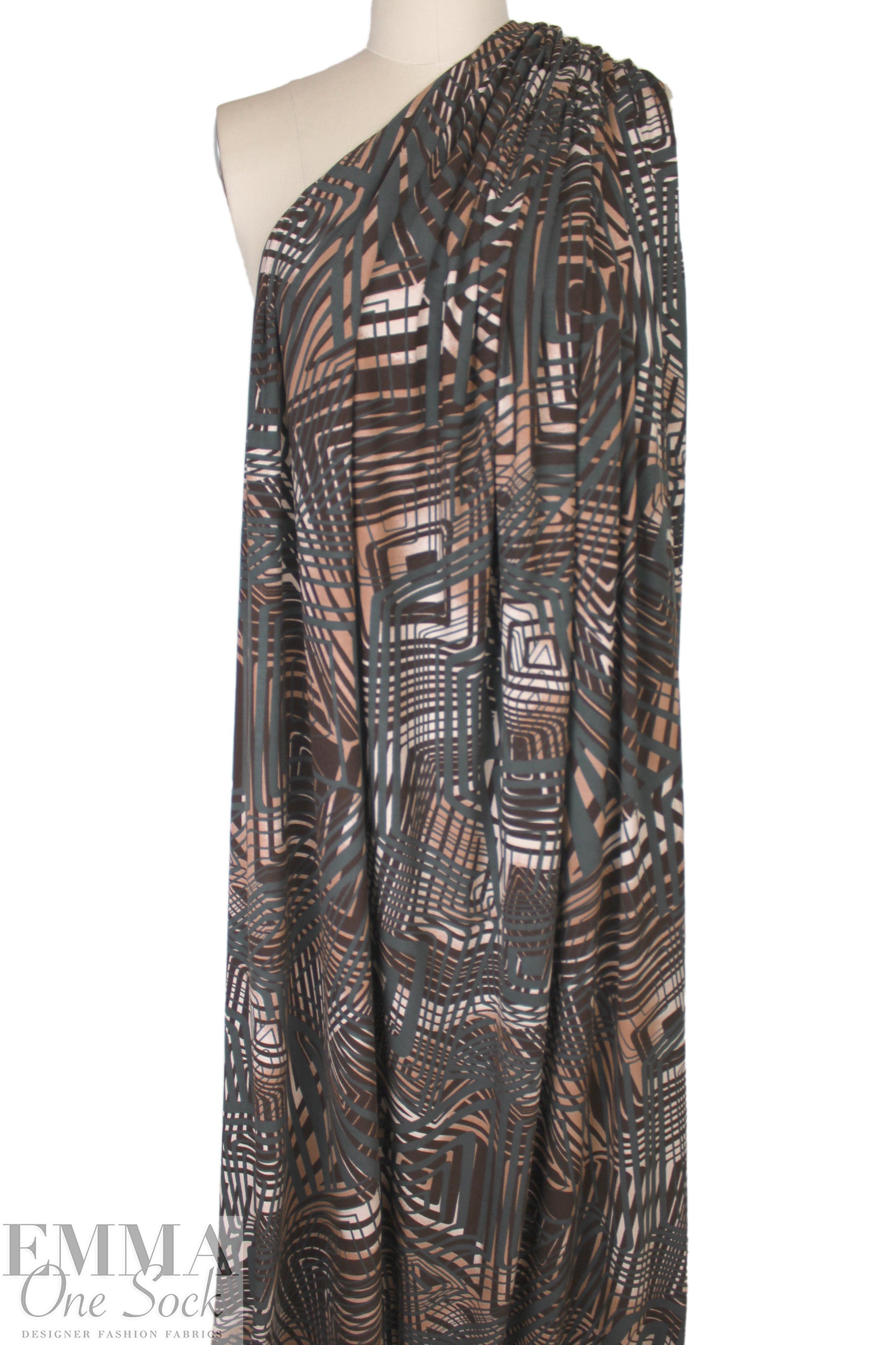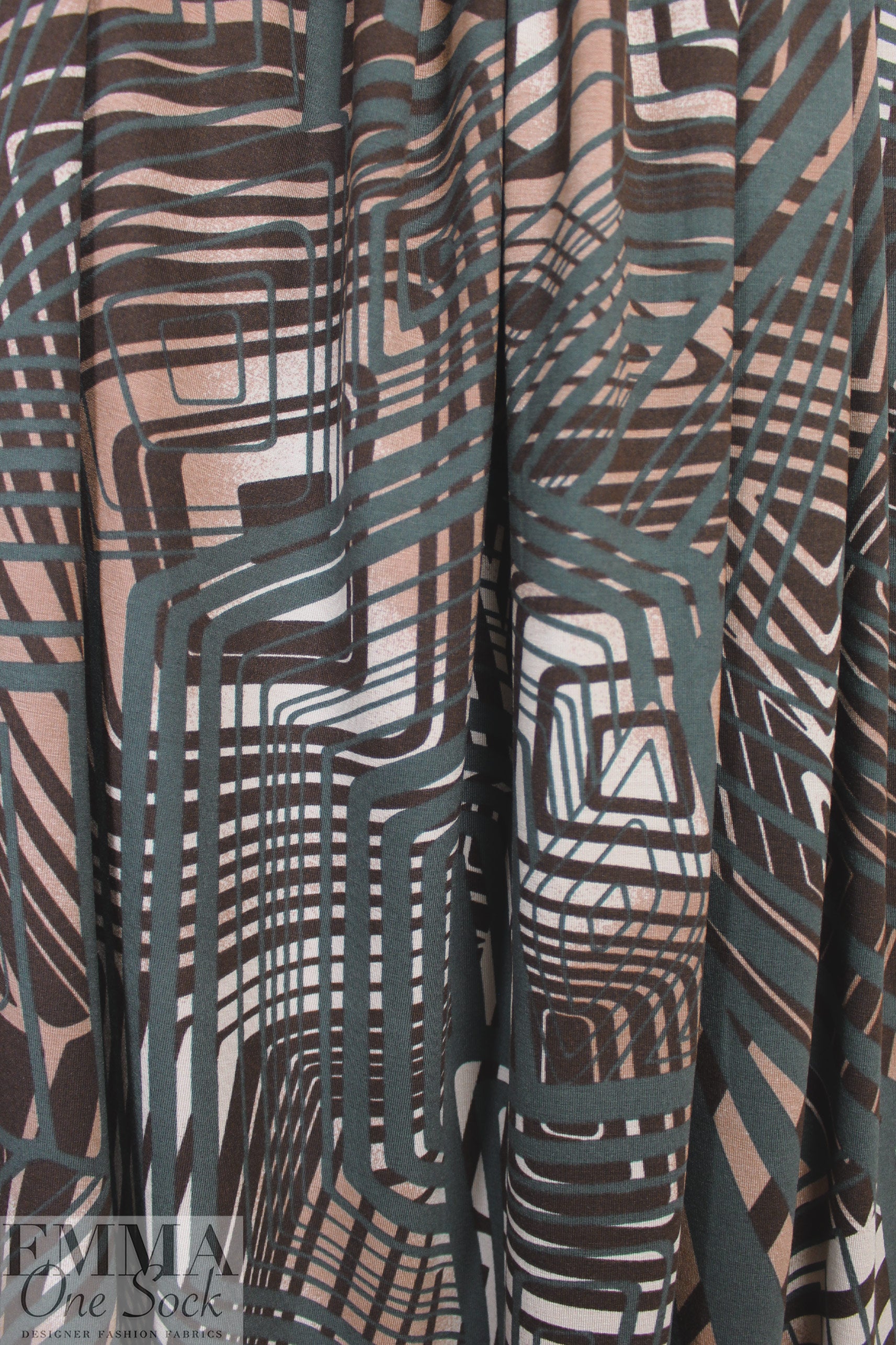 *Special price! Vendor's discount passed on to you.* Made in Italy, this is a gorgeous viscose/spandex knit, light weight yet opaque with lots of drape and about 40% stretch in the width and 20% in the length. The "twist and turn" graphic print has a 31" repeat featuring French roast, fawn, teal-tinted dark grey, etc. (PANTONE 19-1020, 15-1315, 18-4011, etc.). Great for tees, tops, tunics, etc. Test first if you would like to hand or machine wash, cold, hang to dry.