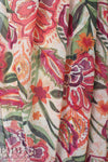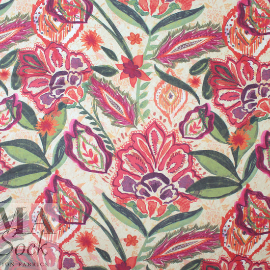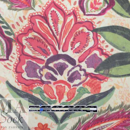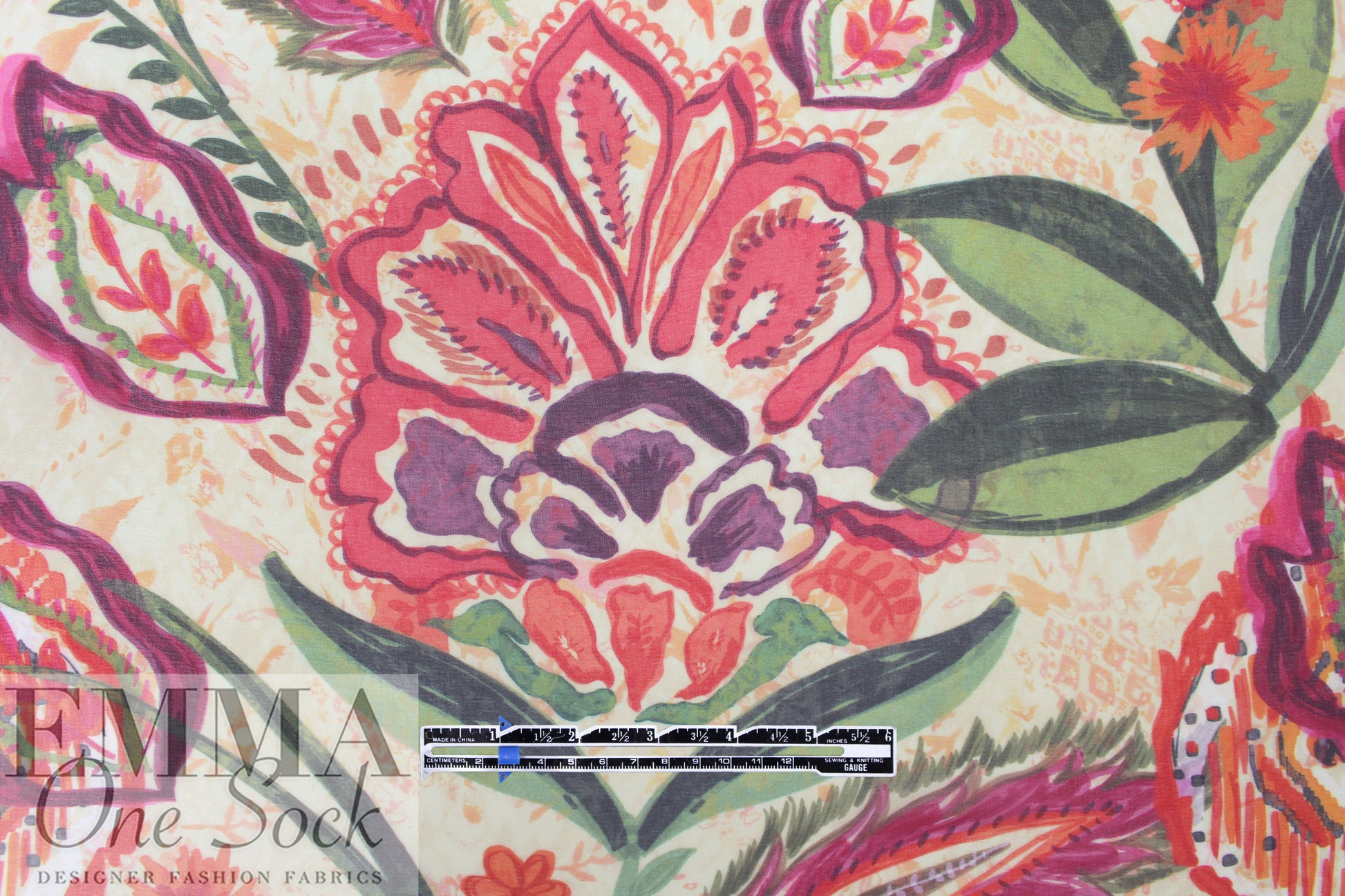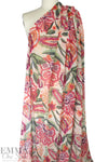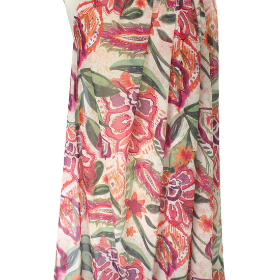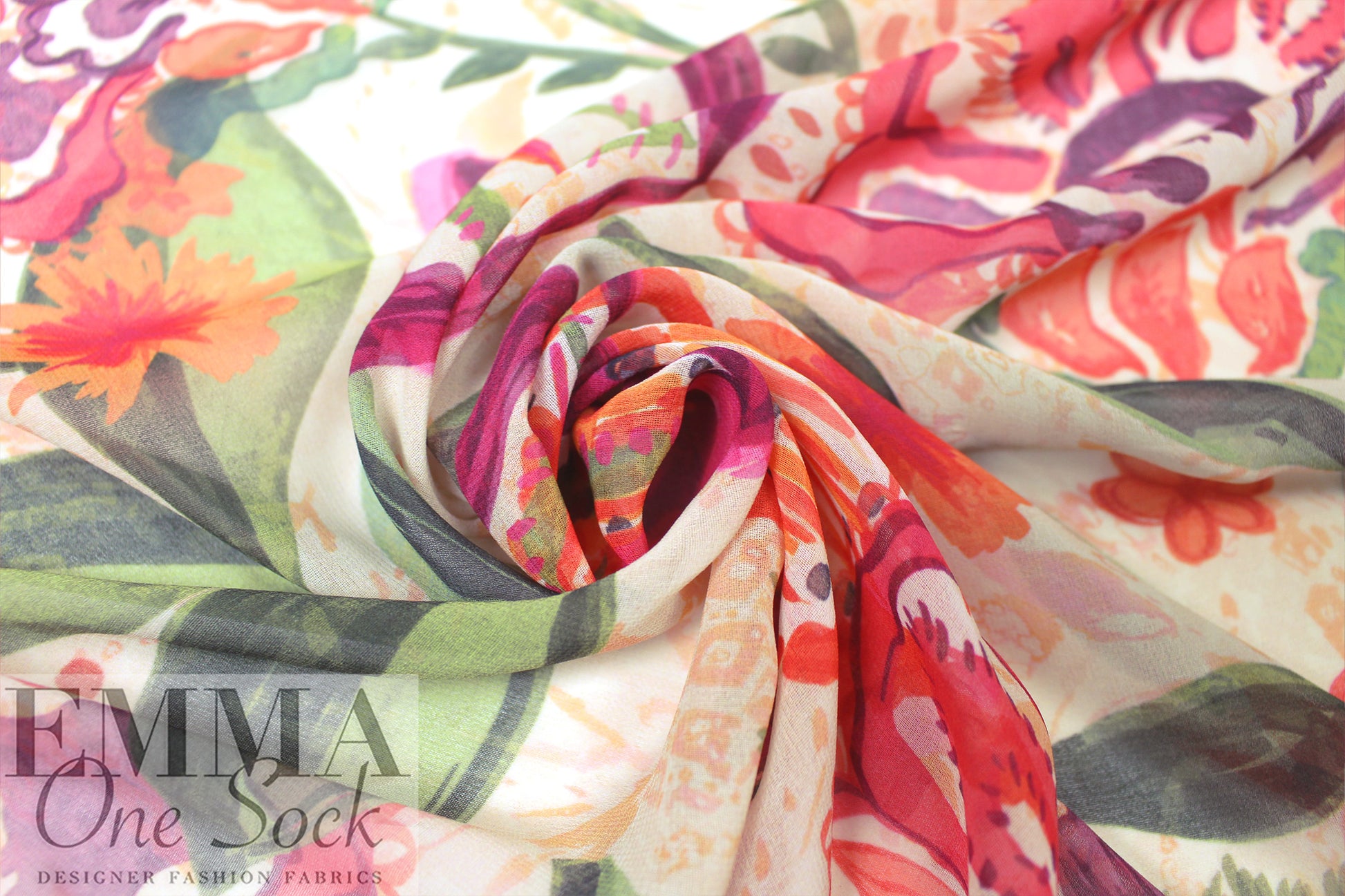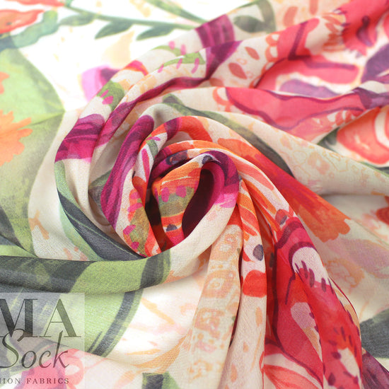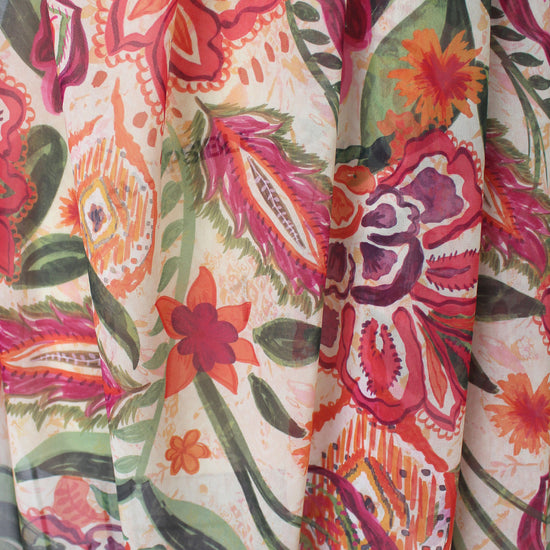 This is a lovely polyester chiffon, a featherweight woven, sheer/semi-sheer with a soft drape. The wonderful 'watercolor wildflowers' print (18.25" repeat) features stylized flowers and leaves in shades of daylily, grape, berry, pomegranate, etc. on a butter cream ground (PANTONE 11-0809, 18-1764, 18-1720, 16-0430, 16-1337, etc.). It is perfect for a scarf, overlay for a blouse, top or tunic, etc. Hand wash and hang to dry or dry clean and iron on low.