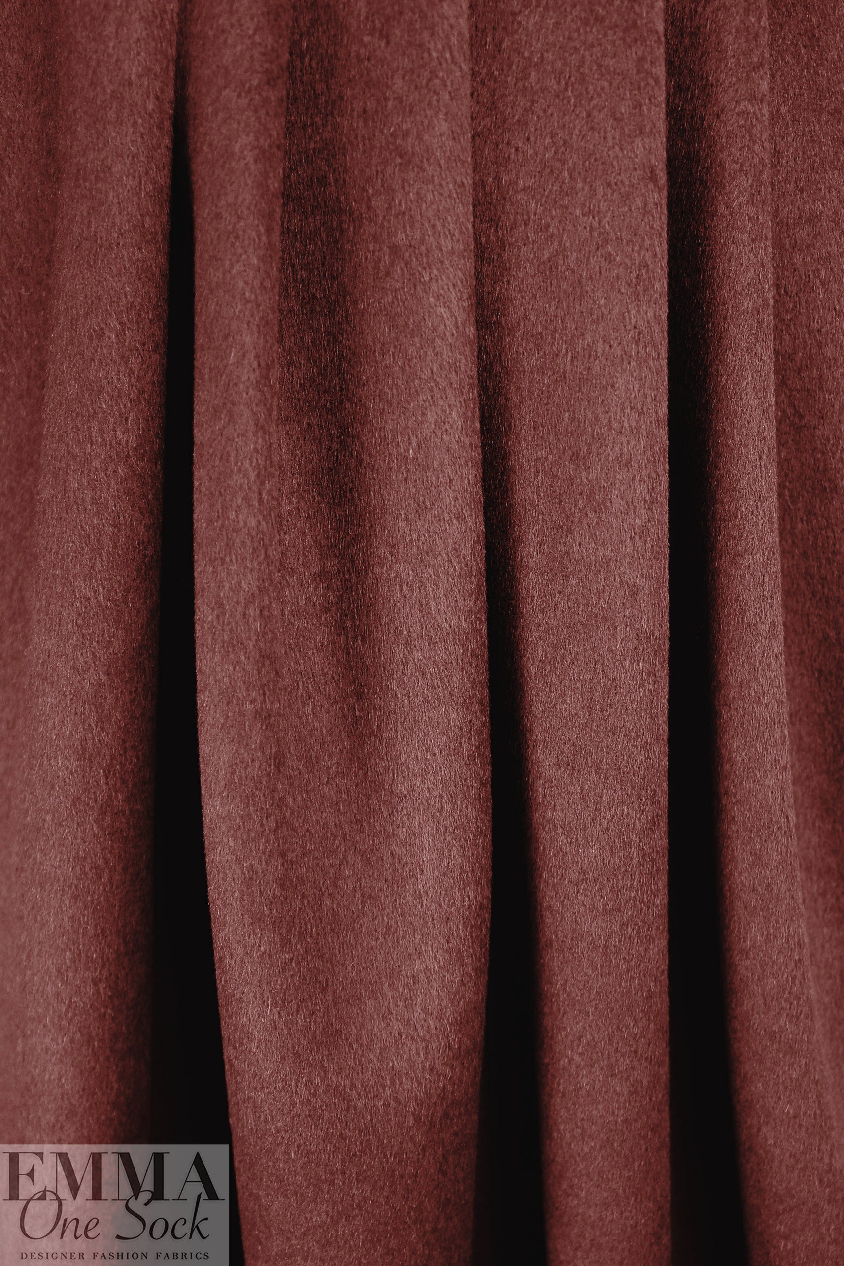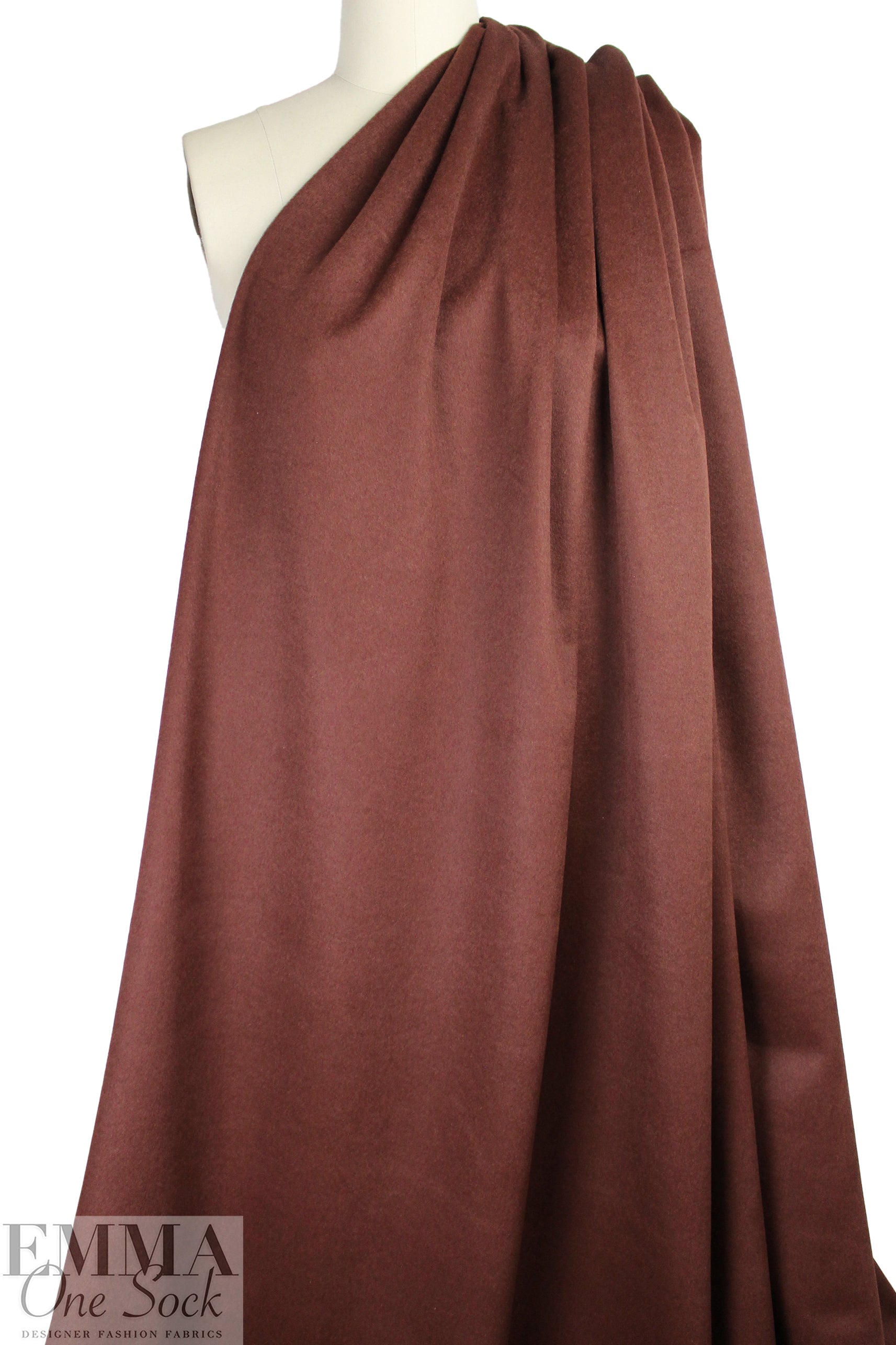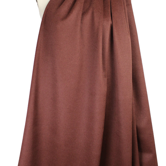 This is a stunning quality brushed wool woven, a lighter coating weight with a soft and cozy brushed texture and some body in the drape. It is medium weight, opaque, and has a "weightless" feel (not super heavy and dense). The edges do not fray, and it does not stretch, so it would make a lovely unlined topper, cape, jacket, hat, winter skirt, etc. Of course, you can also line it if you wish! The color is a rich mahogany (PANTONE 19-1331 but not quite as dark). Dry clean only.