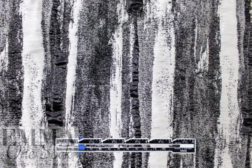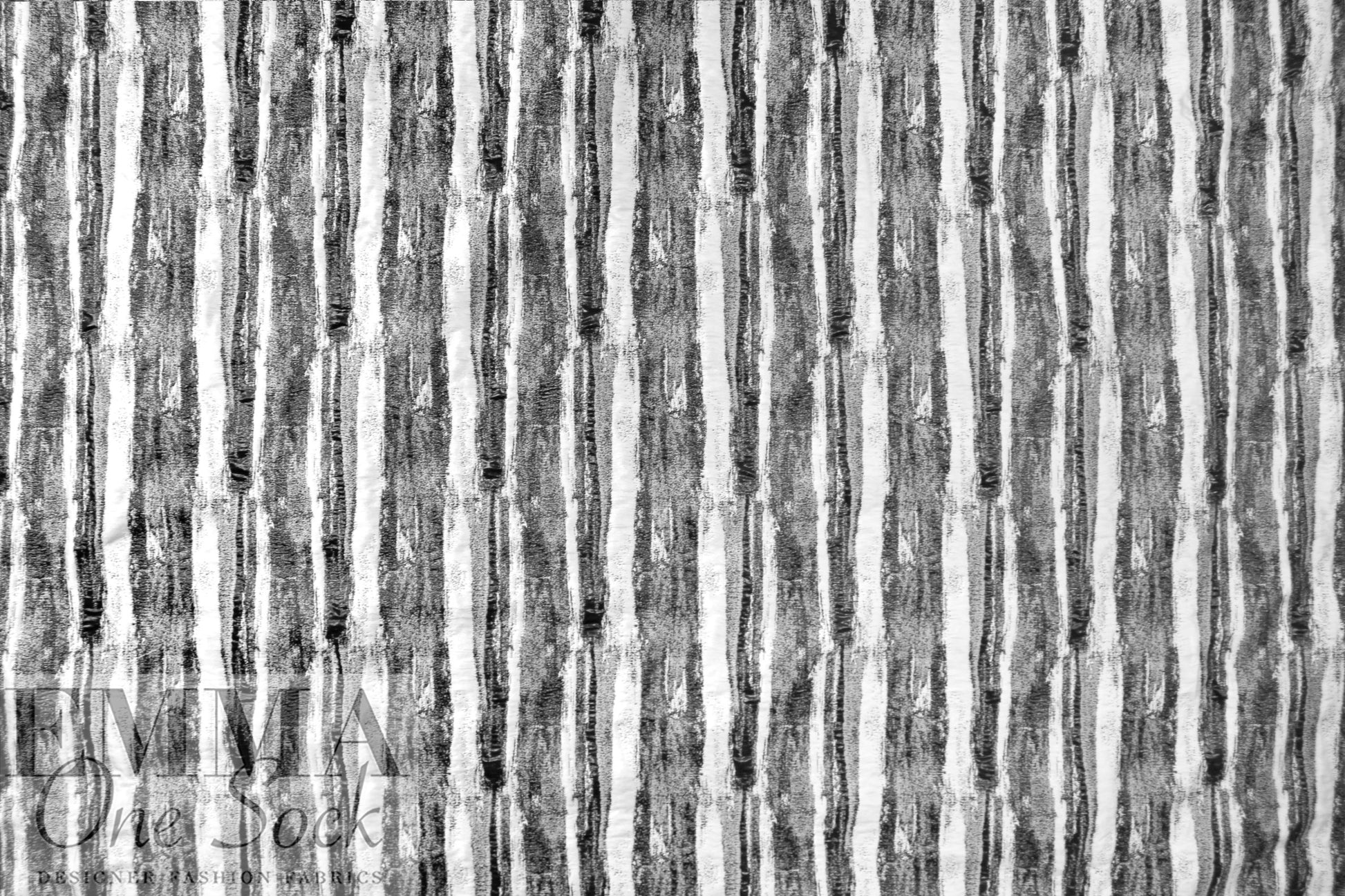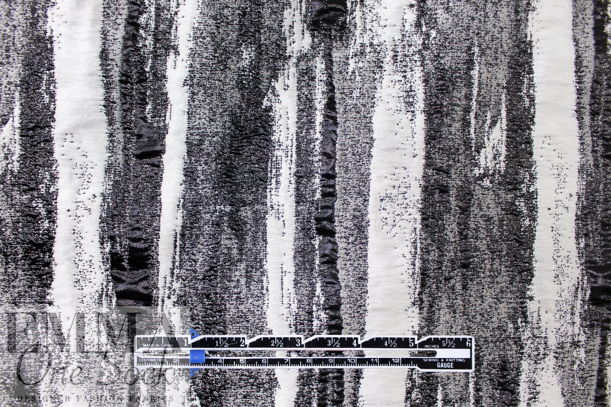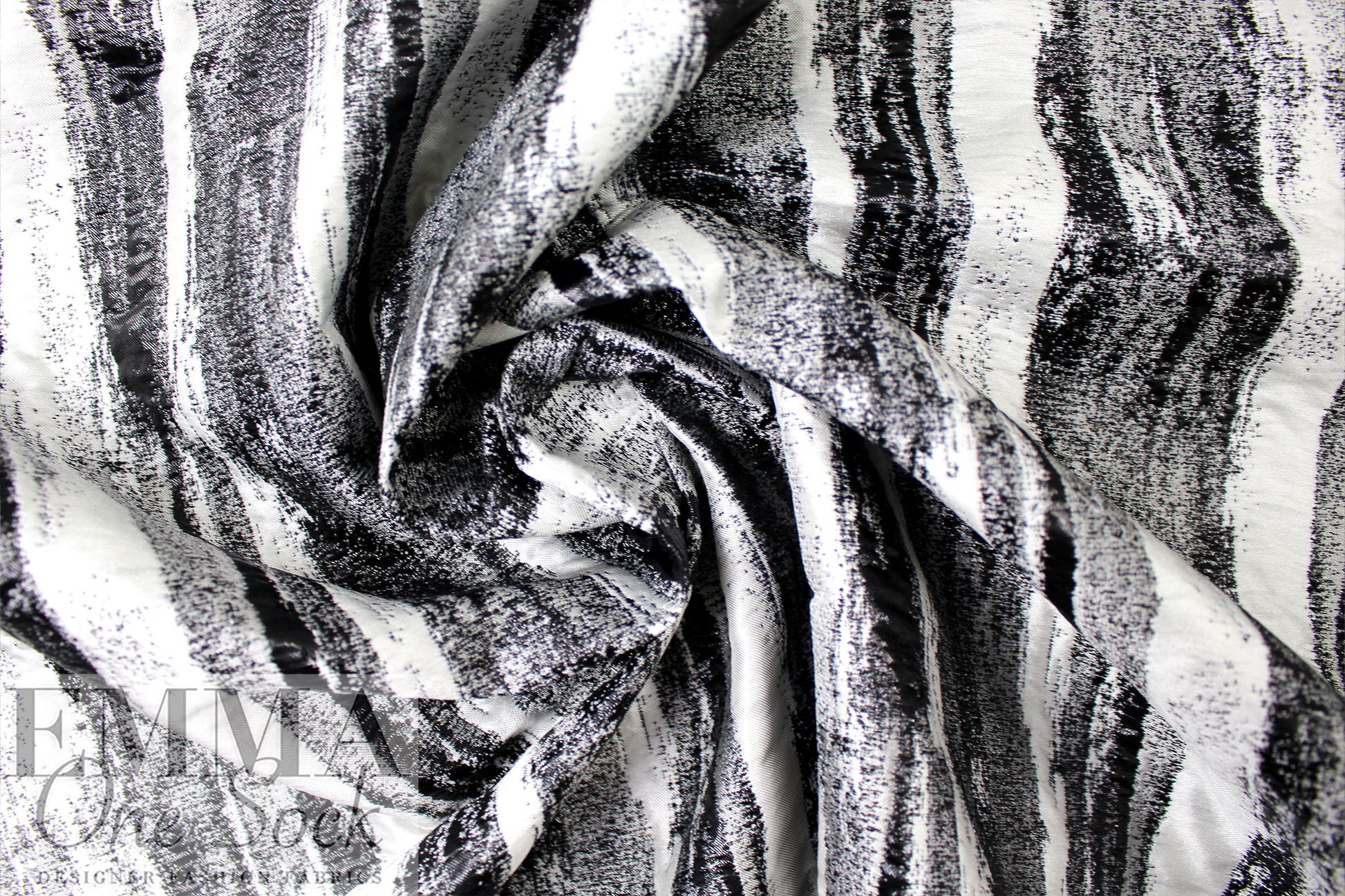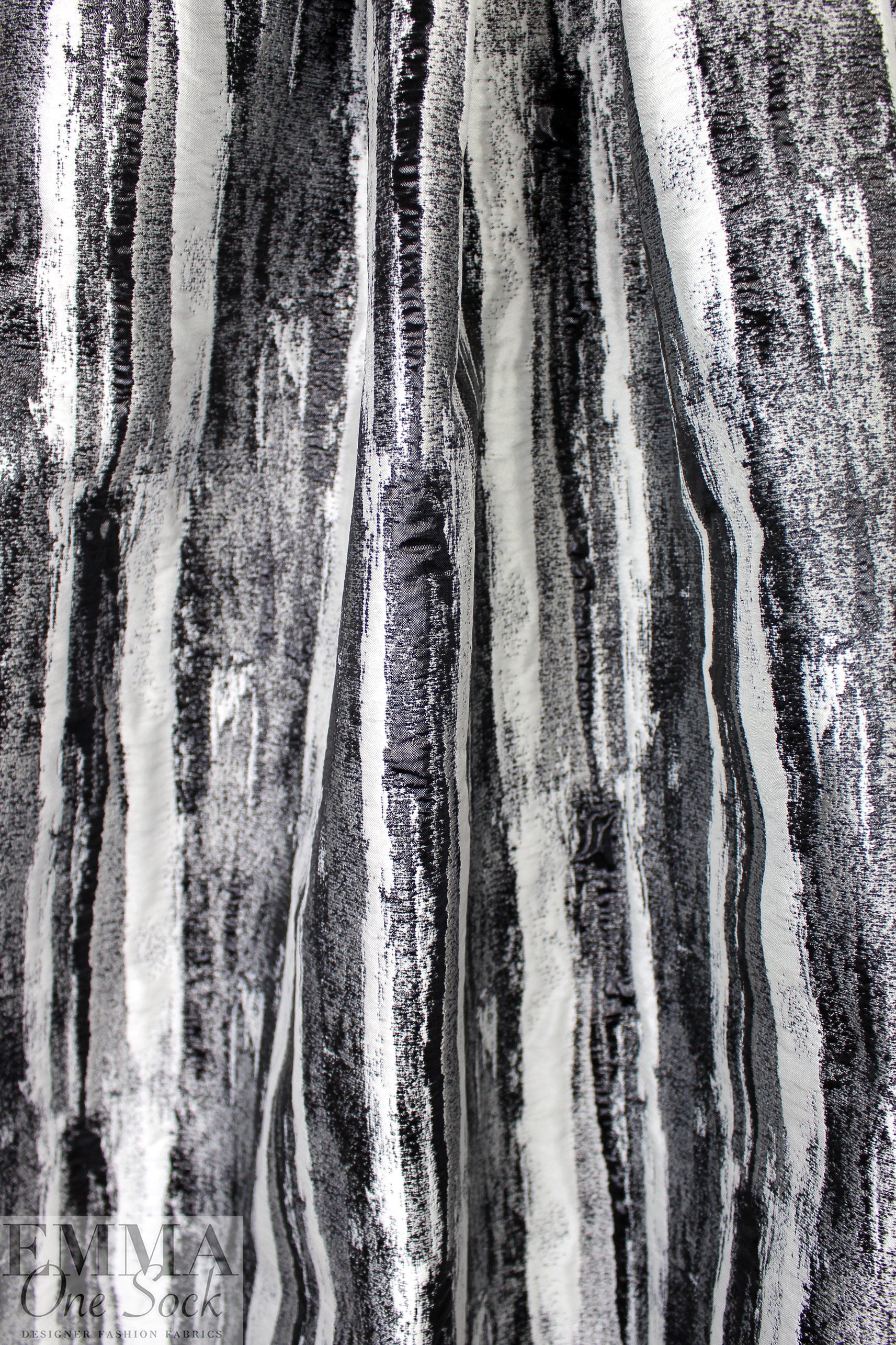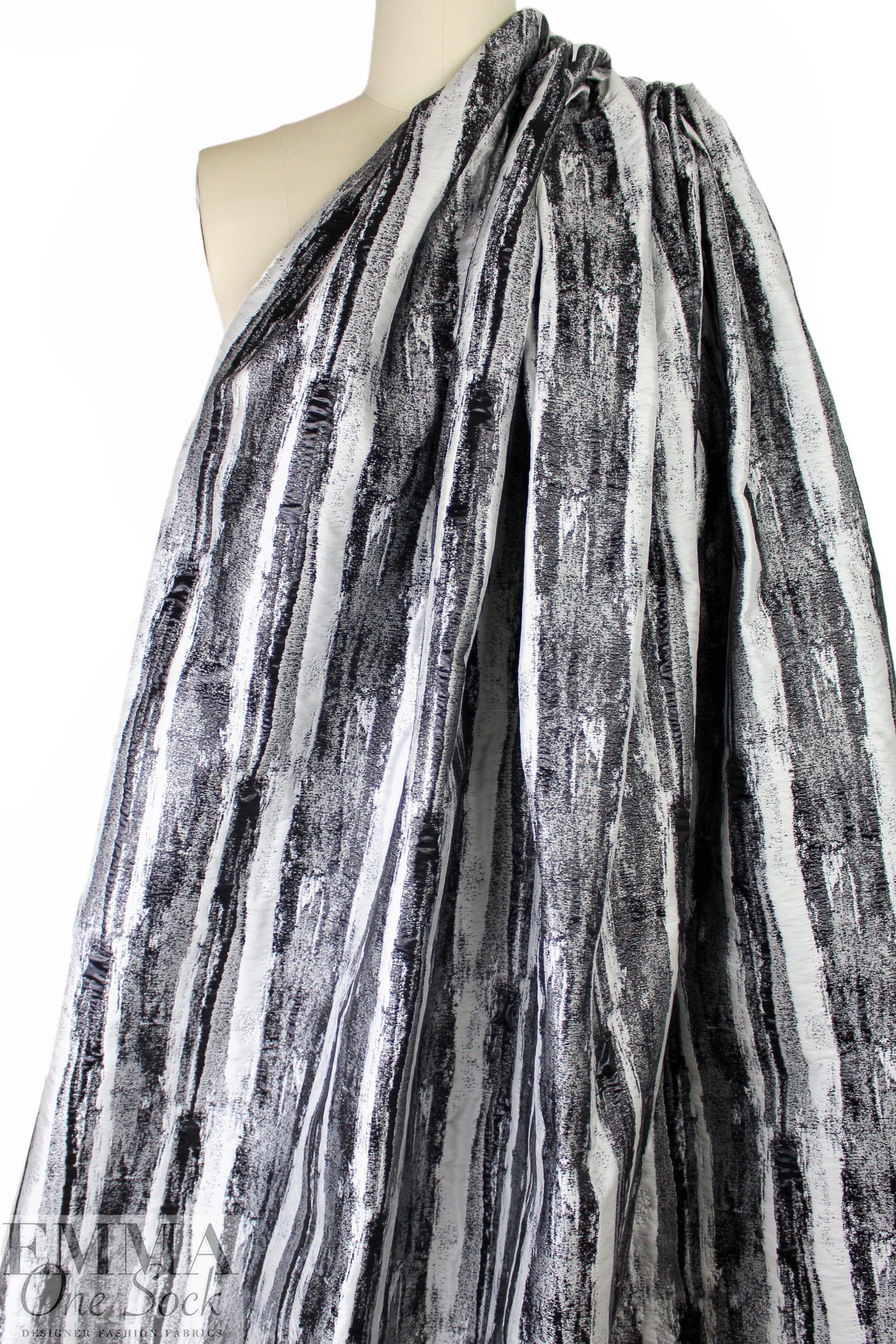 From a designer and made in Italy, this is a gorgeous eveningwear brocade with a mix of satin and glossy fibers. It's a medium weight beauty with a crisp drape and a bit of surface texture in some of the sparkly areas. The elegant yet edgy pattern (9" repeat) features hatchy vertical stripes in glossy black and pearlized white.It is opaque and perfect for a dressy jacket or topper coat, etc. Dry cleaning recommended.