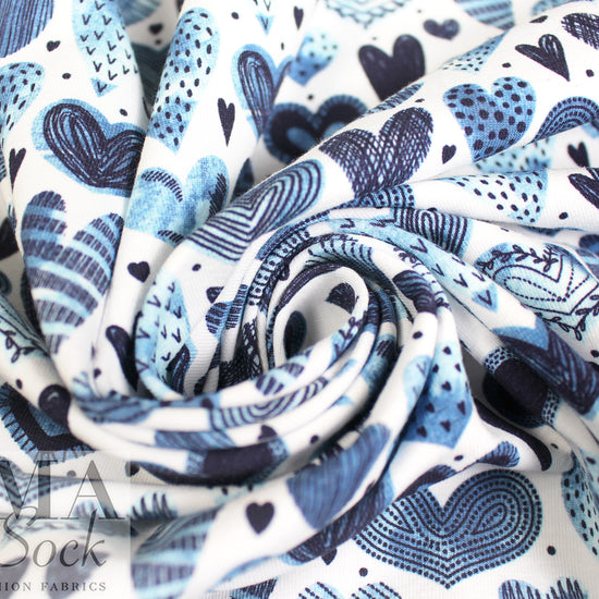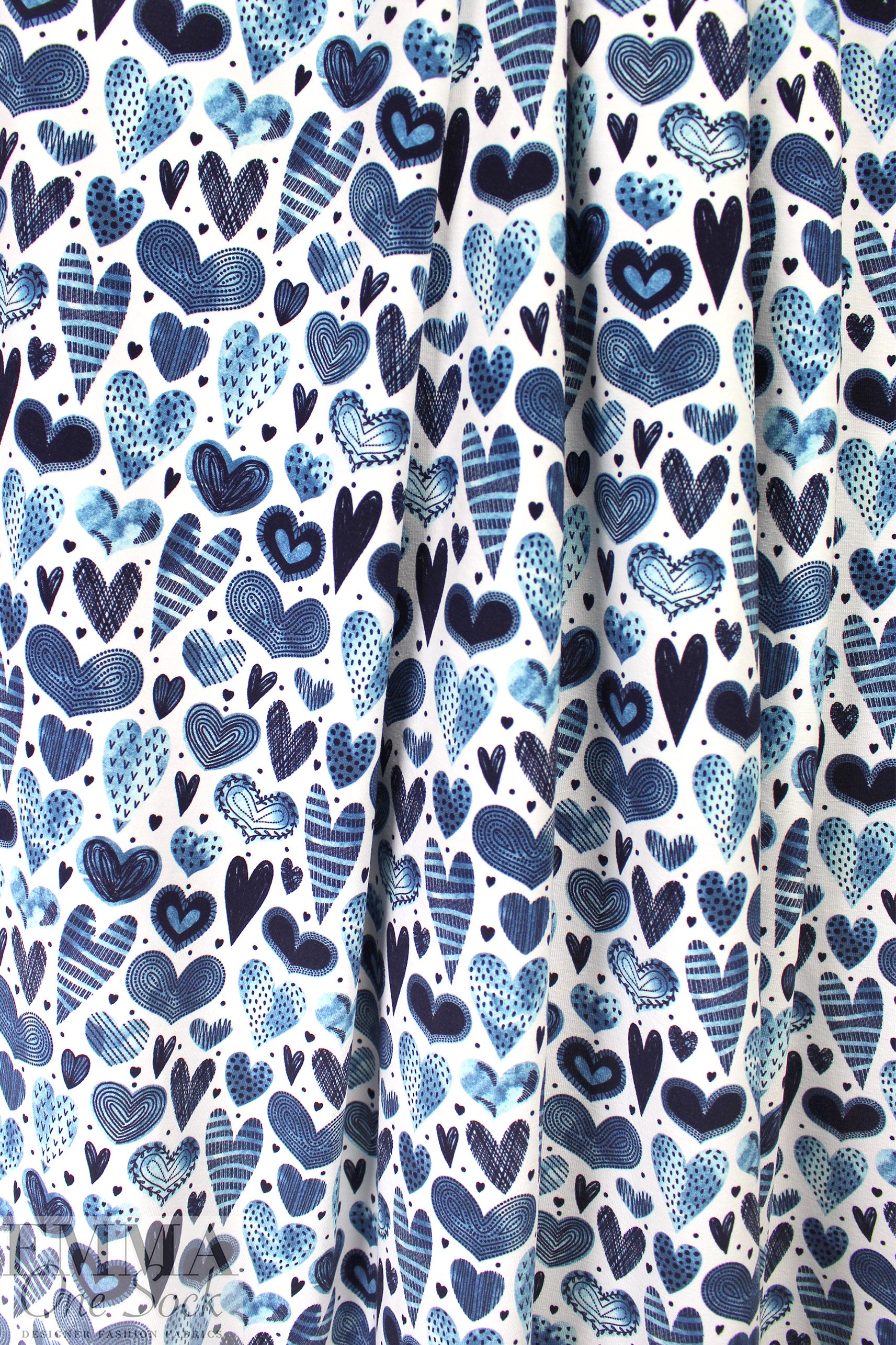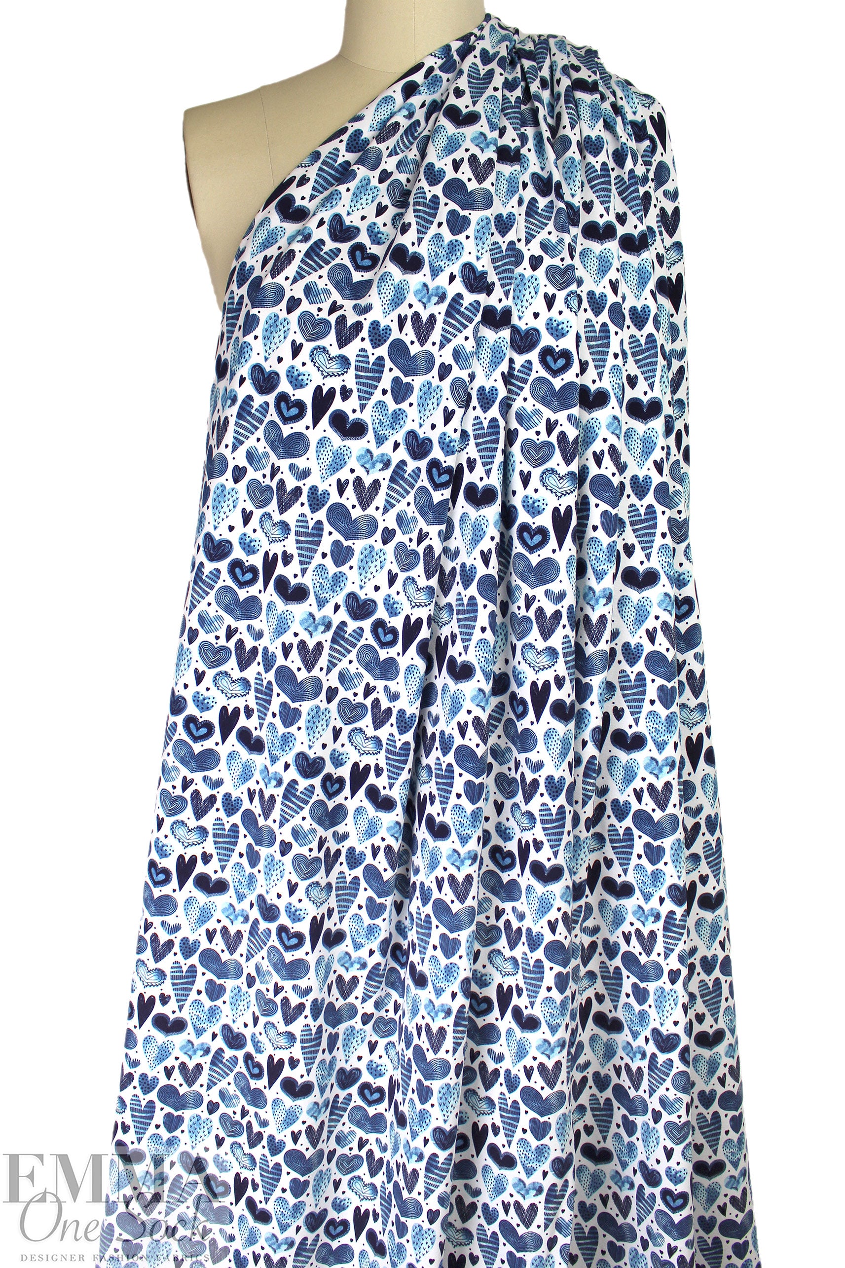 This beautiful cotton/spandex print is imported from The Netherlands, and the quality of the fabric is sublime. The digitally printed "love note" design has a 4.75" repeat and features shades of light and dark denimy blues on a soft white background (PANTONE 19-3920, 18-4036, etc.). Soft and substantial, it has about 50% stretch in both directions, and is opaque with a bit of body in the drape. It is Oeko-Tex certified for non-toxic chemicals and dyes. Make a great tee, top, dress, tunic, dress or skirt, etc. The manufacturer recommends hand or machine wash warm, hang to dry. Please test first.