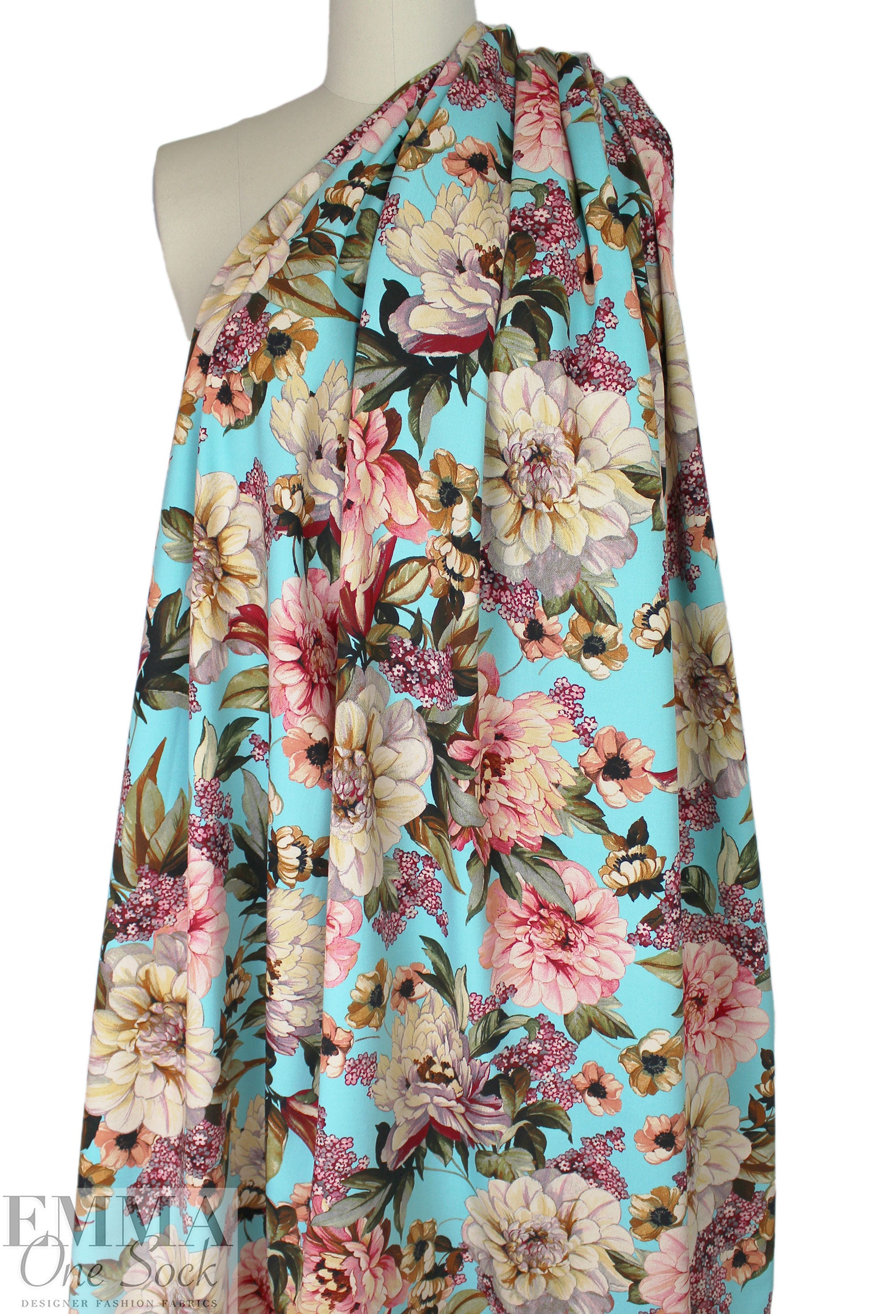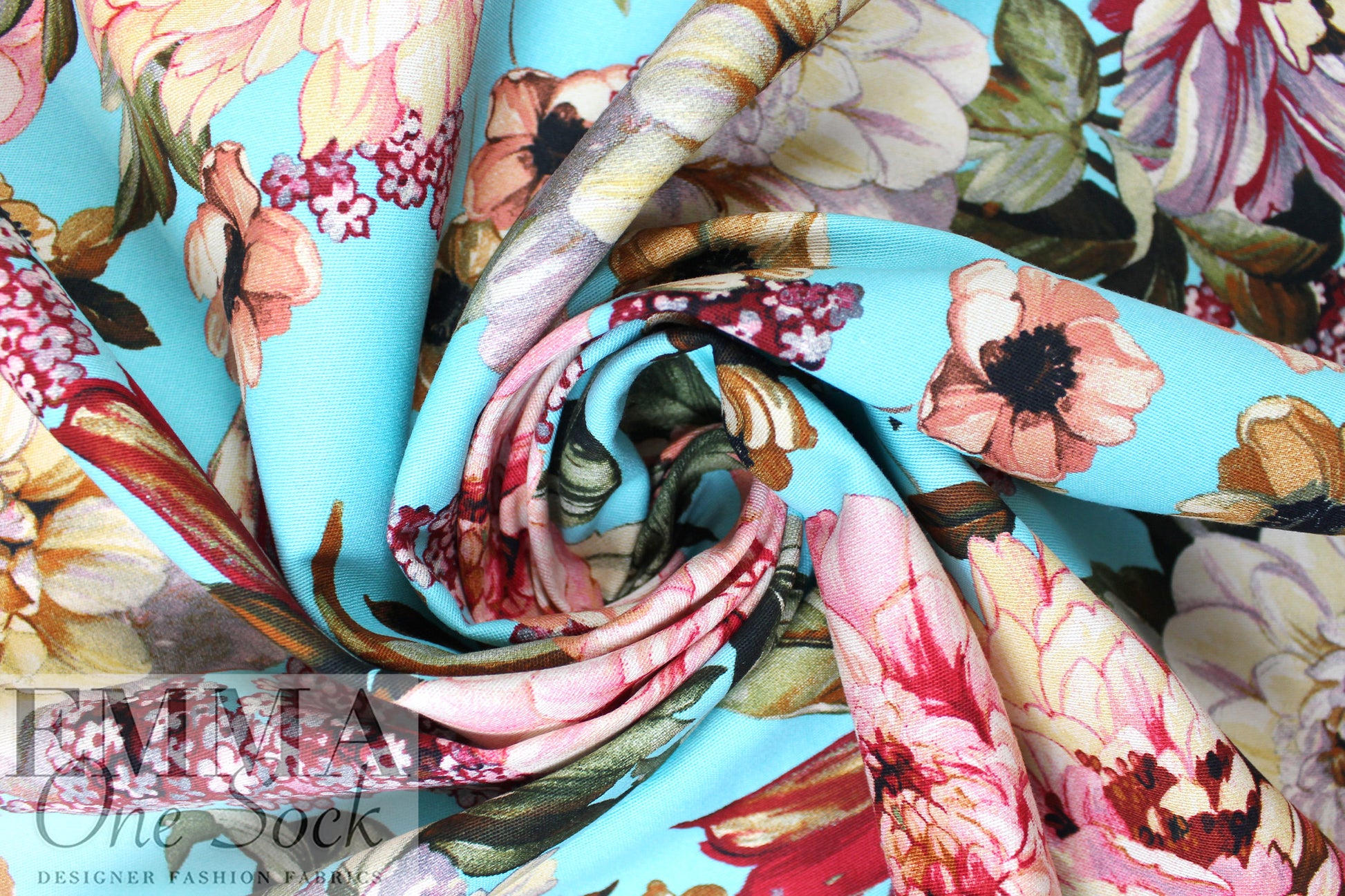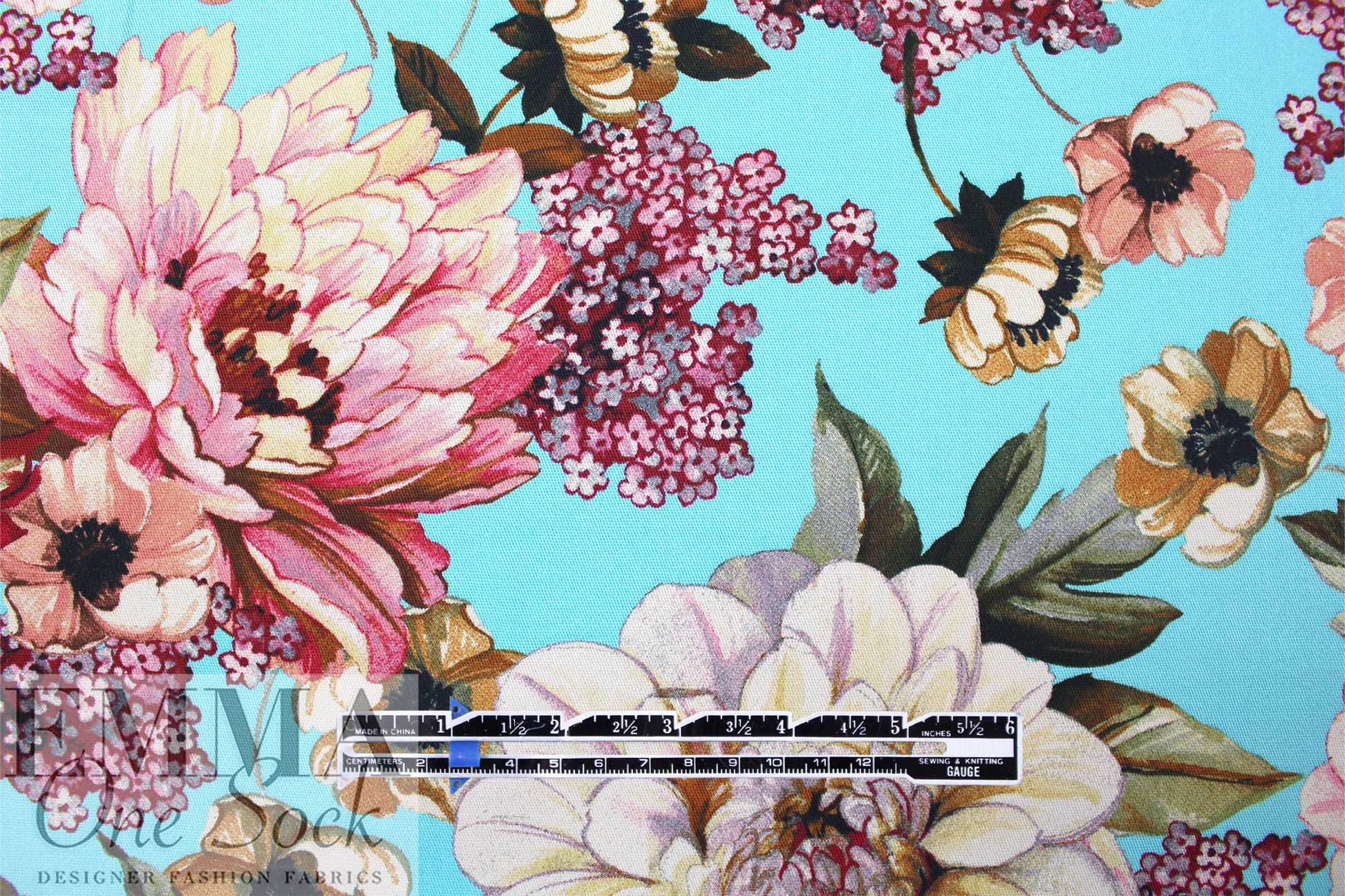 From Italy, this lovely designer cotton stretch woven has a canvas stitch texture and 10% stretch in the width only. The timeless "peony bouquets" print (23.5" repeat) features shades of buttercream, sienna, olive green, sangria, etc. on an aqua background (PANTONE 13-1018, 12-0720, 17-0625, 19-2047, 15-4722 ish, etc.). The fabric weight and drape are similar to a lighter weight denim, substantial and opaque with a somewhat crisp, cottony drape. It is perfect for jeans, jacket, structured dress or skirt, etc. Hand or machine wash cold, hang to dry (please test first).