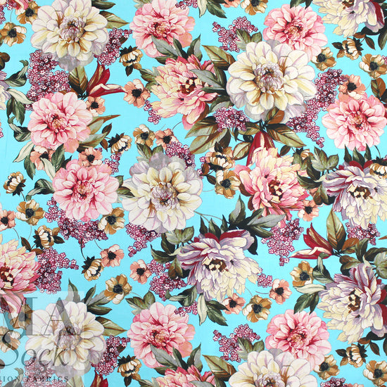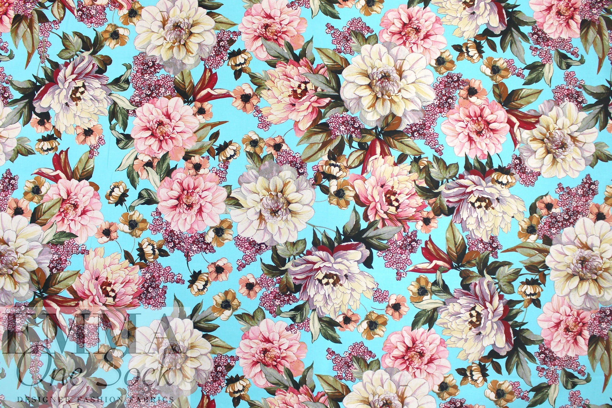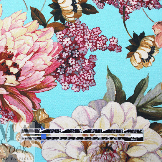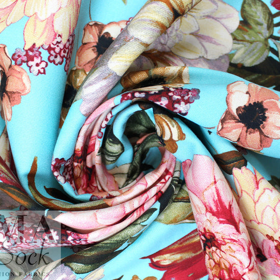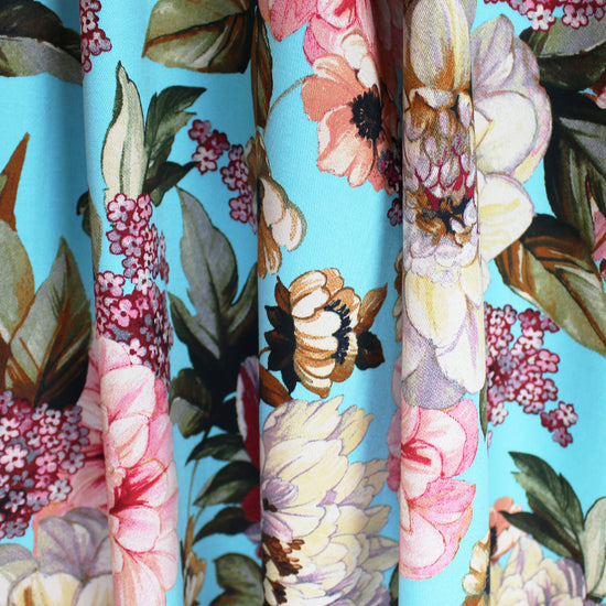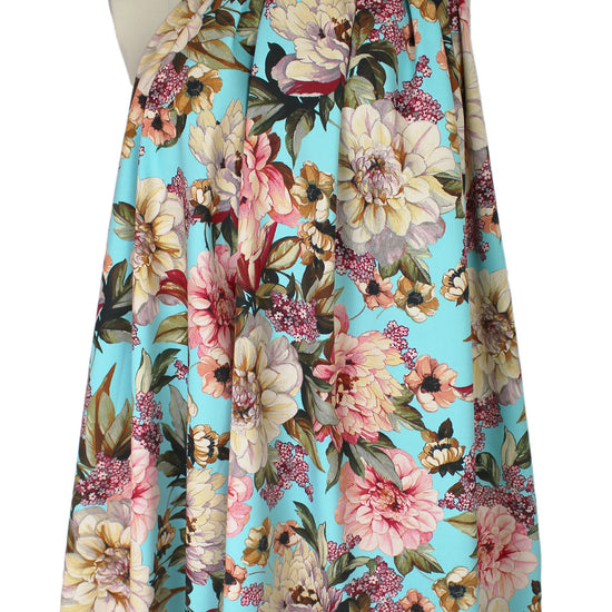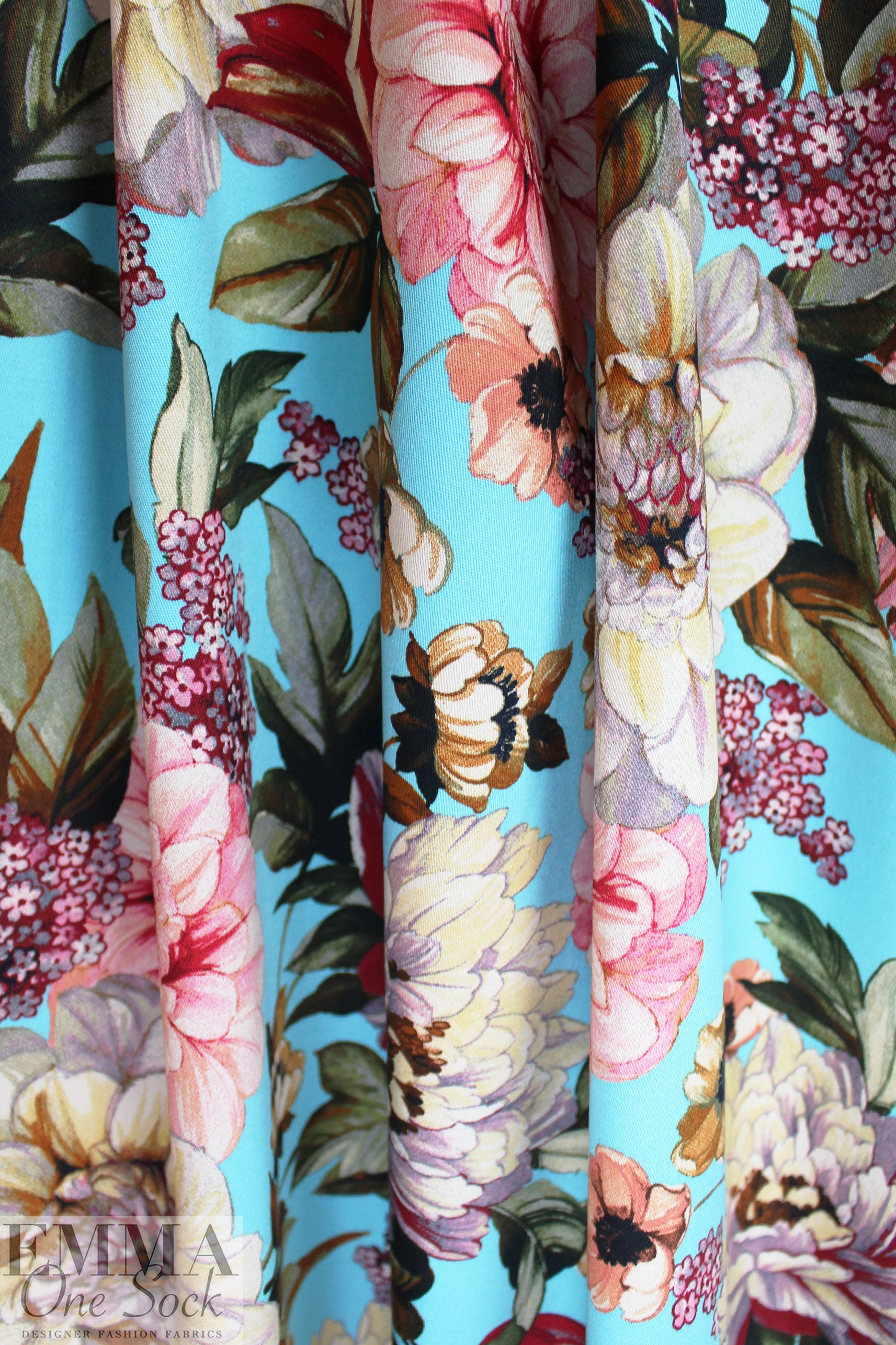 From Italy, this lovely designer cotton stretch woven has a canvas stitch texture and 10% stretch in the width only. The timeless "peony bouquets" print (23.5" repeat) features shades of buttercream, sienna, olive green, sangria, etc. on an aqua background (PANTONE 13-1018, 12-0720, 17-0625, 19-2047, 15-4722 ish, etc.). The fabric weight and drape are similar to a lighter weight denim, substantial and opaque with a somewhat crisp, cottony drape. It is perfect for jeans, jacket, structured dress or skirt, etc. Hand or machine wash cold, hang to dry (please test first).