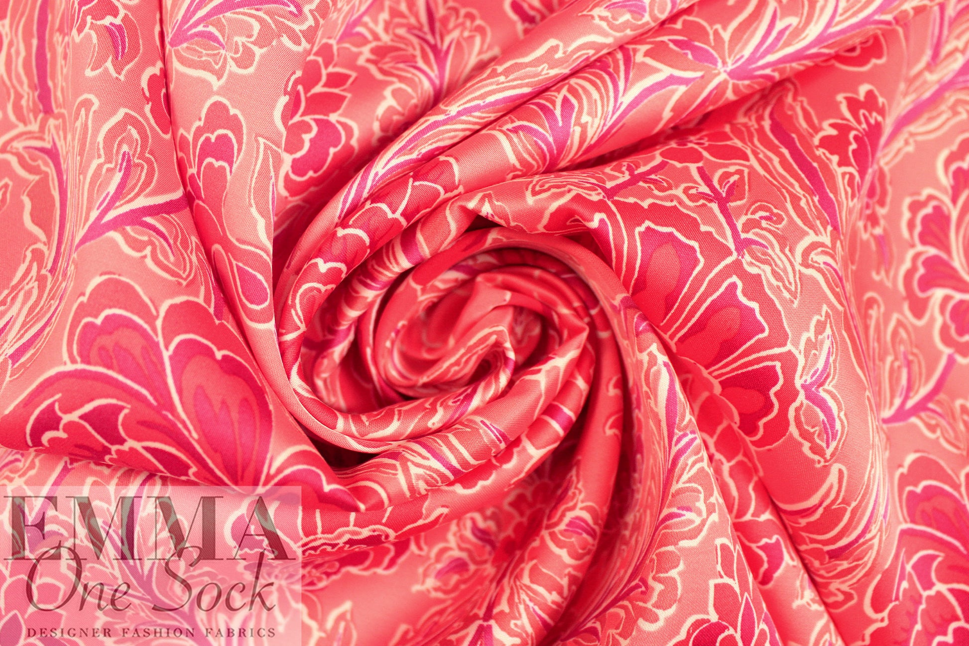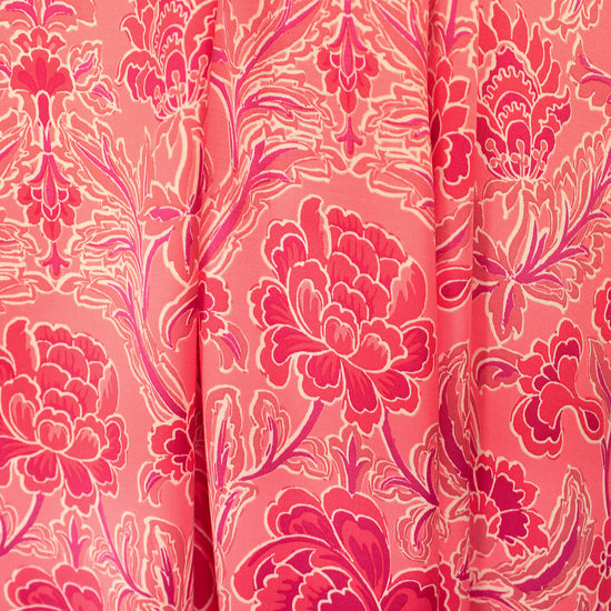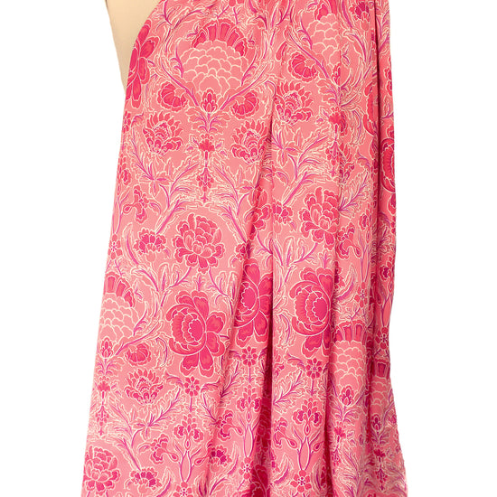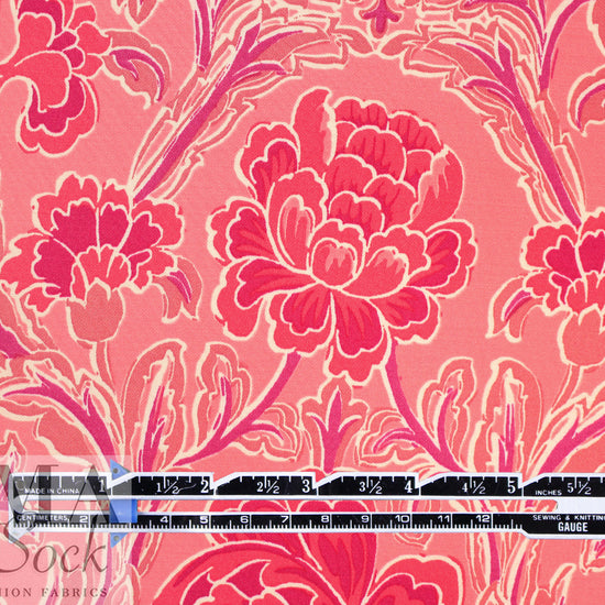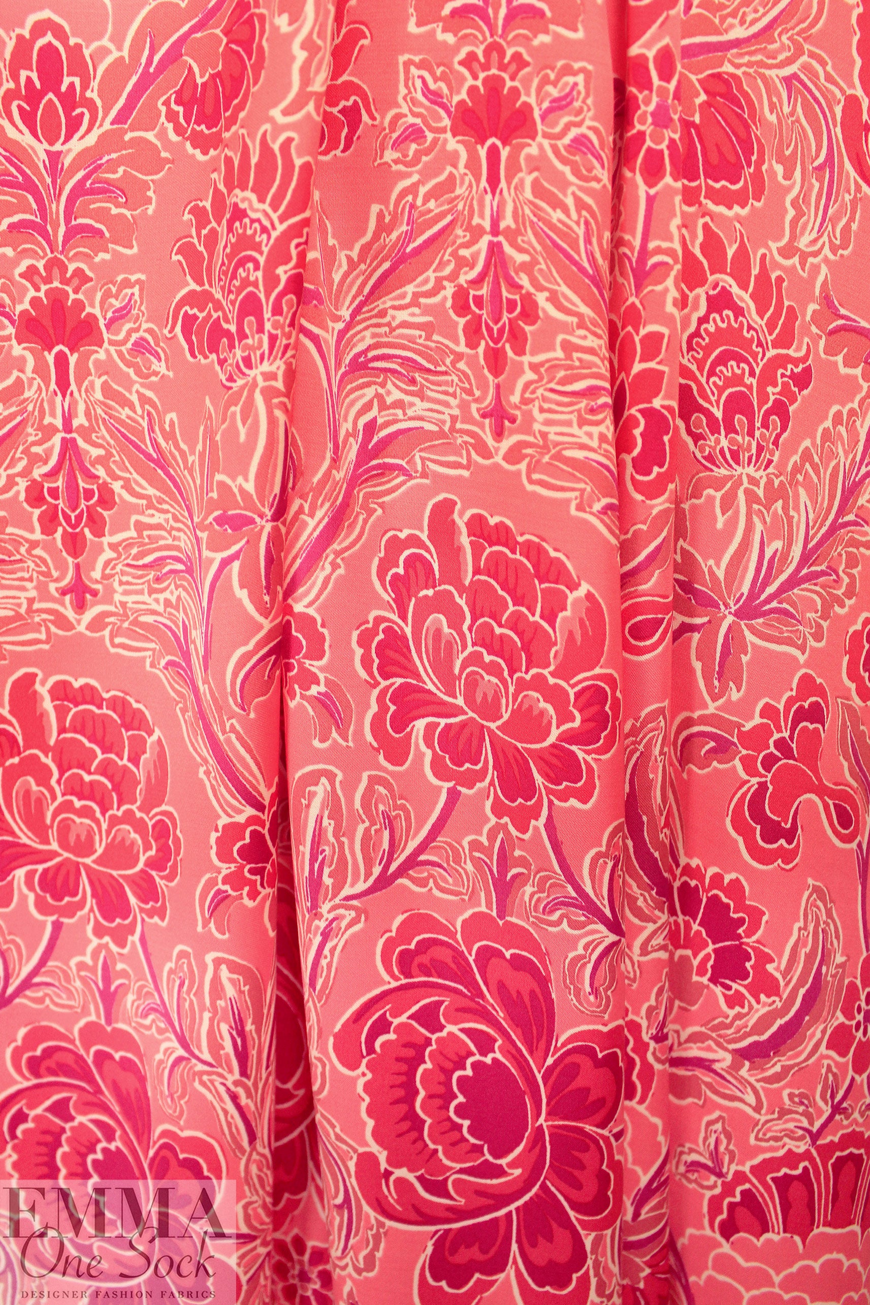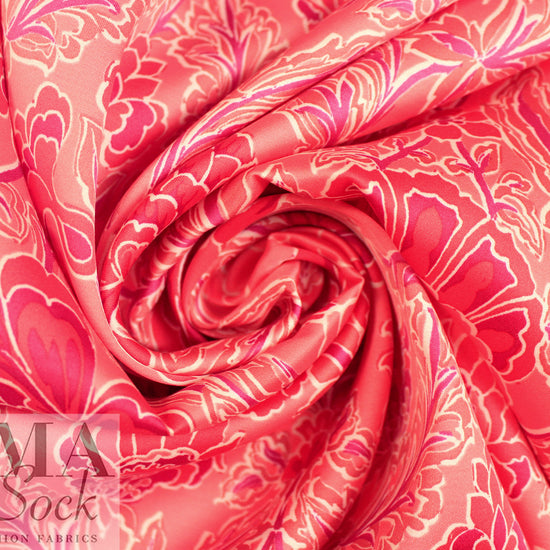 From Italy, comes this beautiful viscose satin woven with a lustrous and smooth surface, using a new and more sustainable iteration of viscose called Ecovero. This beauty is light weight and opaque with a floaty, soft drape. The 'deco drama' floral scroll print (25.5" repeat) features strawberry pink, coral, dusty rose, plum and white (PANTONE 16-1731, 18-1651, 17-1512, etc.) . It is perfect for a shirt, blouse, tunic, top, lined dress or skirt, etc. It would also make a lovely lining for a tailored jacket or coat. Hand wash, hang to dry (please test first), or dry clean. EcoVero is a viscose fabric made from sustainably sourced, renewable resources and the end product is completely biodegradable. The overall environmental impact is so low that it has been awarded the prestigious EU Ecolabel. EcoVero performs exceptionally well for everyday wear as it is very soft, comfortable, breathable and durable with a lovely drape. A wonderful choice for your professional wardrobe as well, as this fabric retains vivid color, does not pill and can mimic silk. EcoVero is an exciting development in eco-friendly fashion.