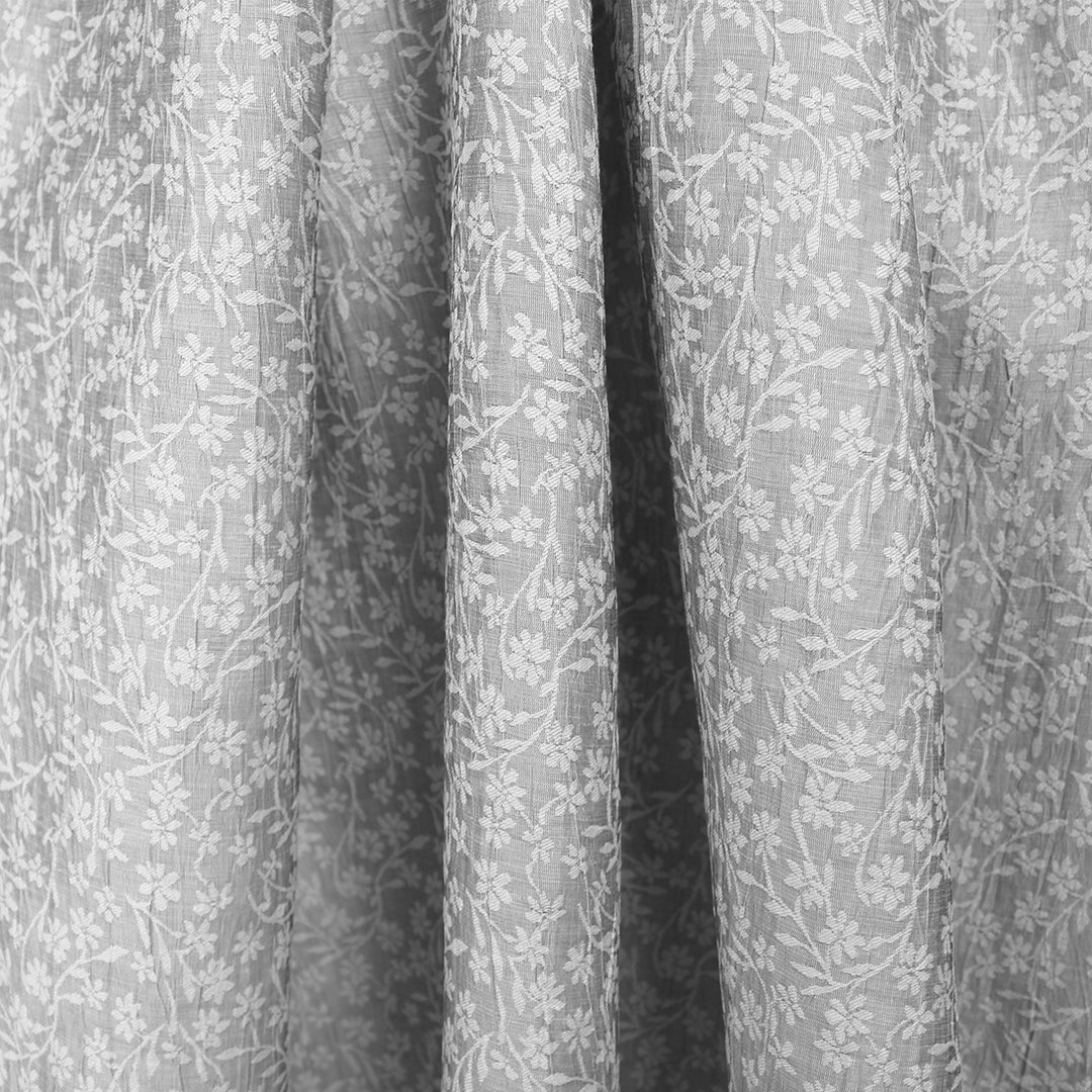 This is an absolutely stunning linen blend jacquard woven, a lightweight and semi-opaque beauty with some body in the drape. It has a very elegant, small-scale floral design which is more opaque than the background. The flowers are woven in a soft white on a cool, silvery gray background (PANTONE 15-0000). The crinkle texture and embroidered look bring depth and interest. Sophisticated and very chic! The reverse is also very beautiful, with more emphasis on the soft white, so it has a lighter, more muted effect. Make a blouse, shirt, tunic, kimono, dress, skirt, etc. Some styles may need lining or layering. Dry cleaning recommended. Test first if you wish to try hand- or machine- washing.