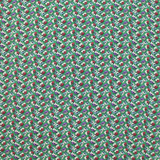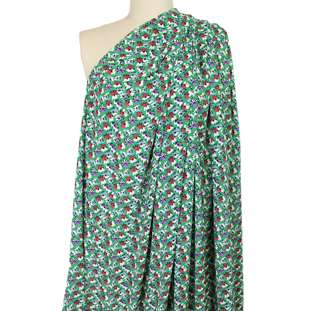 This is a wonderful new technology polyester woven that is much like a lightweight silk or rayon crepe, drapey and semi-opaque with a matte finish. It's a fabulous alternative to silk or rayon, and the small scale "blarney flowers" graphic (2" repeat), is cheerful and versatile. It features blossoms in shades of marsala, dusty blue, violet, off-white and black on a blarney green background (PANTONE 14-4210,17-3628, 18-1438, 17-5528, etc.). Make a blouse, top, tunic, dress, maxi-dress, skirt, etc. Some styles may need lining since it is lightweight. It is almost equally saturated on the reverse. Hand or machine wash, hang to dry.