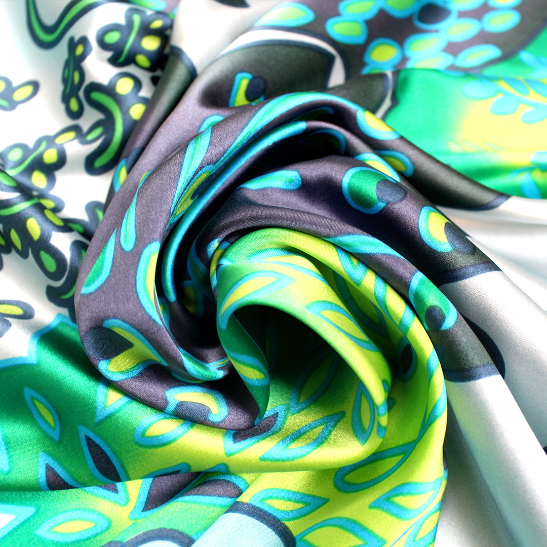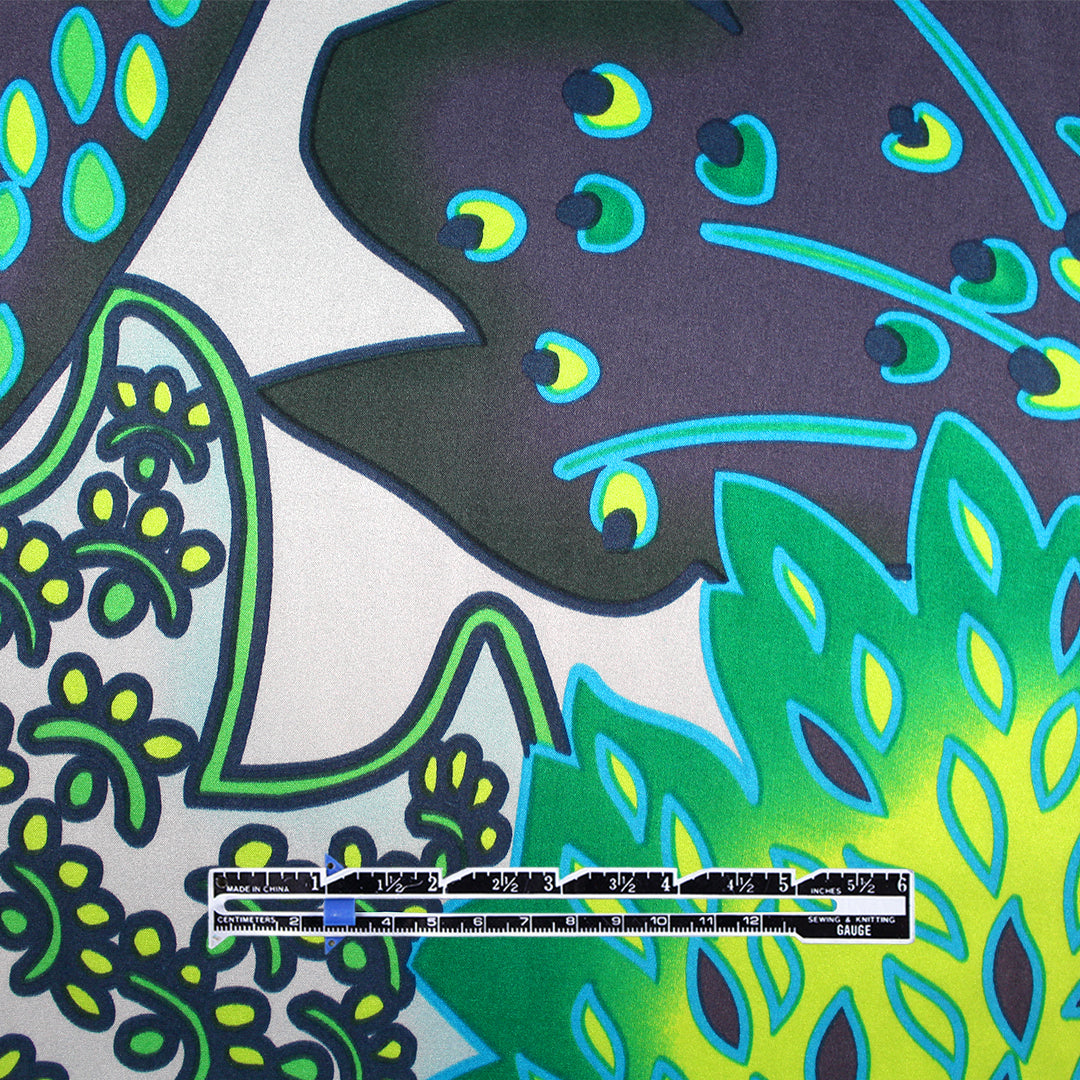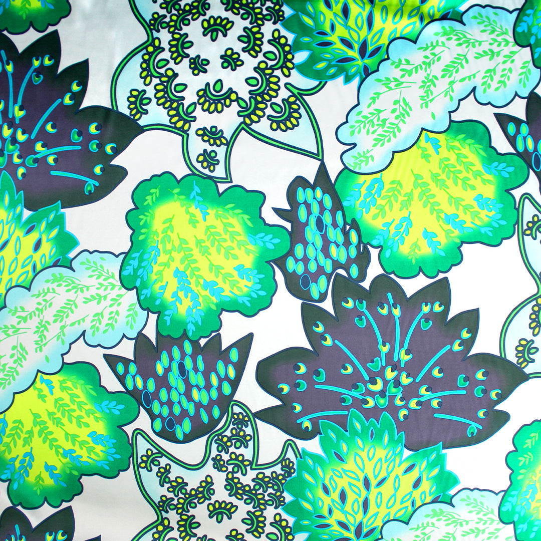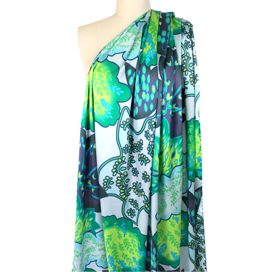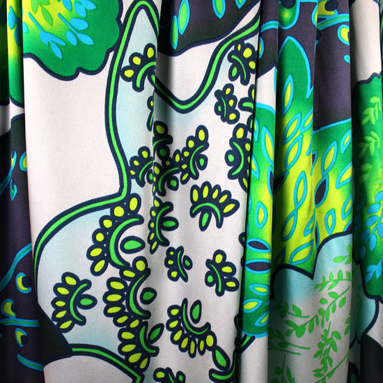 This beautiful silk stretch charmeuse print is a blouse weight, opaque with a soft drape and about 20% widthwise stretch. The "emerald acres" print (30" repeat) features shades of emerald, lime, sky blue, deep navy, black, blue fog, etc. (PANTONE 13-4303, 17-5937 is close, 13-0442, 17-4432, 19-3928, etc.). Perfect for a blouse, tunic, dress, skirt, or a luxury stretch lining for a jacket or coat. Dry clean or test first if you wish to try another method.