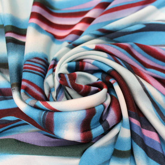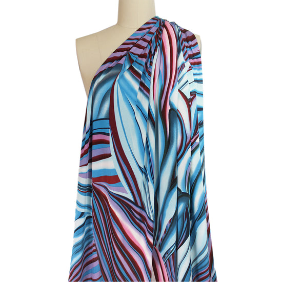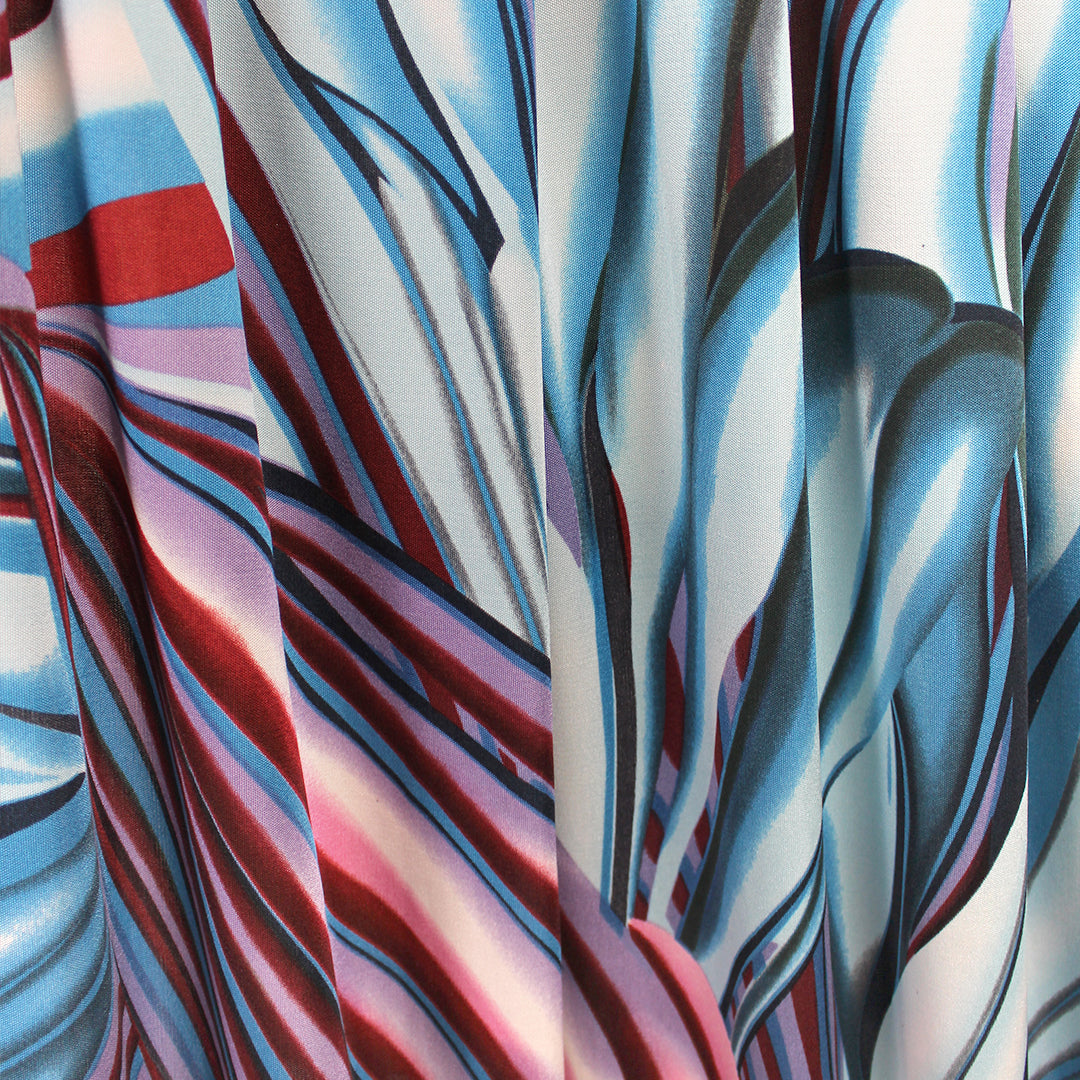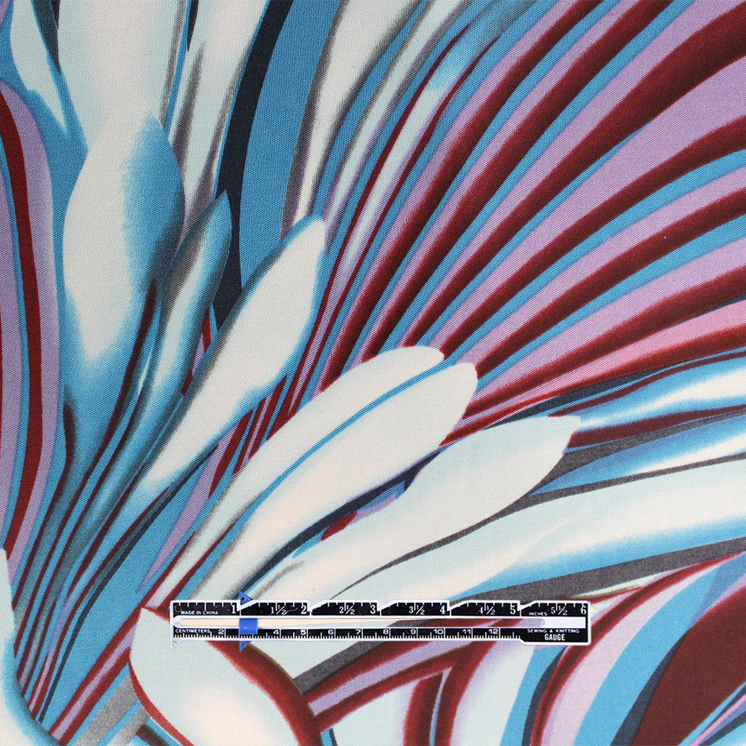A rare find these days! This lovely quality printed silk jersey from a US supplier of designer deadstock has a "fluent petals" graphic design (30" repeat) printed in lavender, sky blue, auburn, soft white, etc. (PANTONE 16-3815, 17-4247, 19-1338, etc.). It has a luxurious, silky, airy and light weight feel. It is drapey, nearly opaque, with 30% widthwise stretch (stable lengthwise). It is perfect for any pattern that calls for silk jersey, a top, tee, tunic, luxury loungewear, dress, etc. Some styles may need lining. Note the narrow width and order accordingly. Dry clean, or test first if you choose to hand wash, and hang to dry.