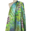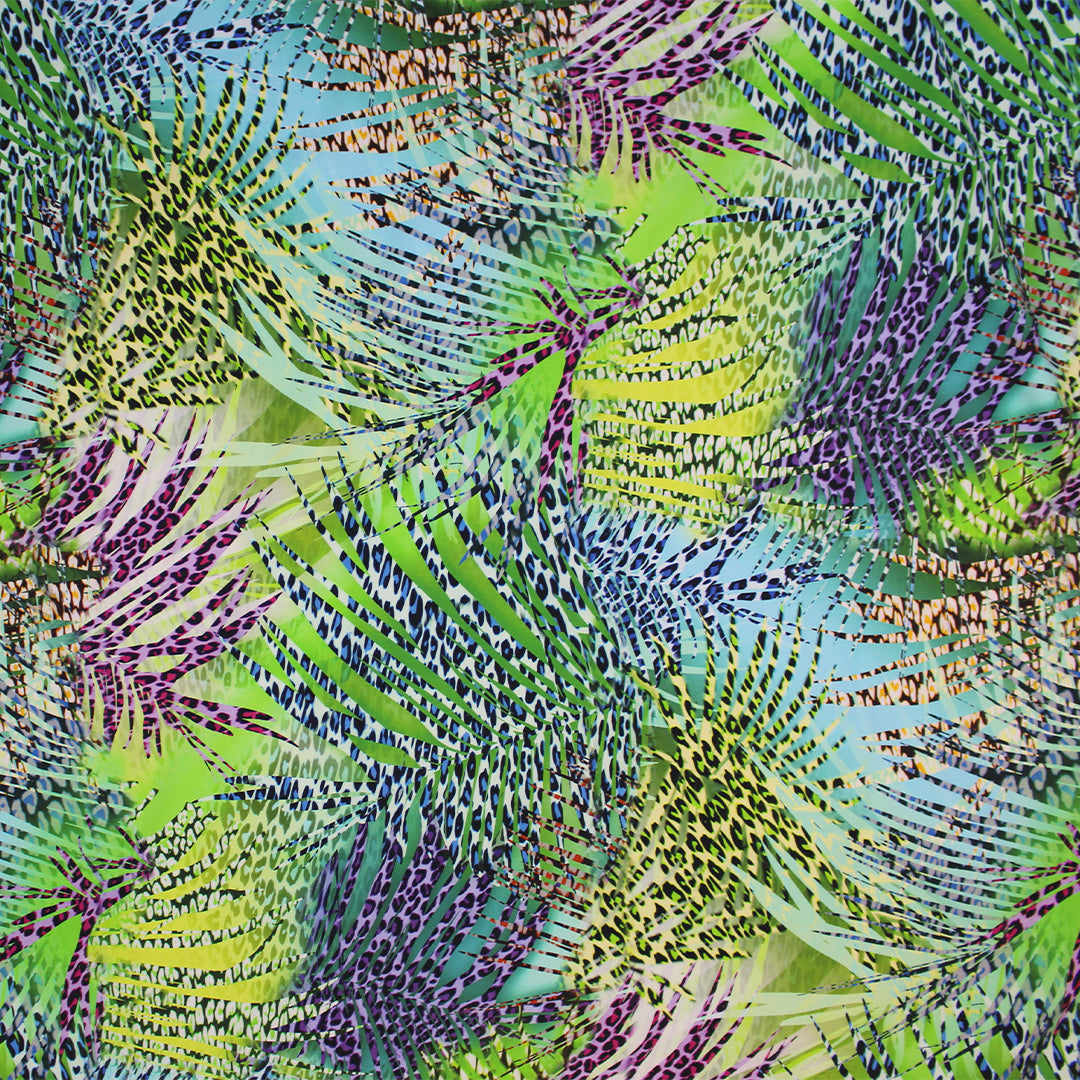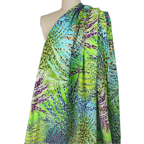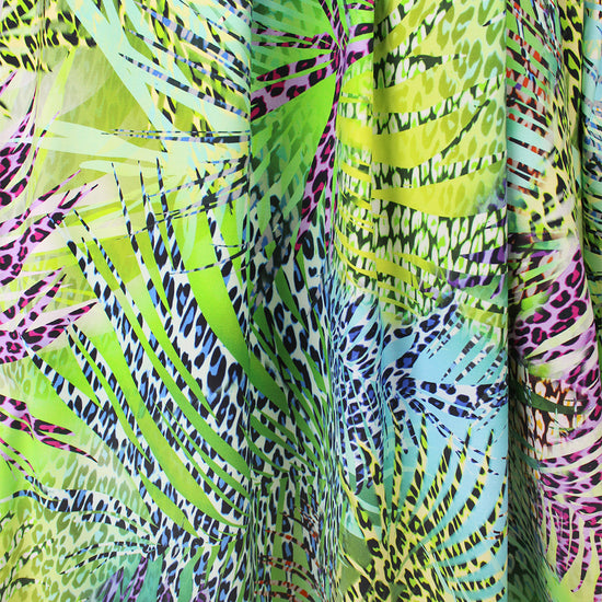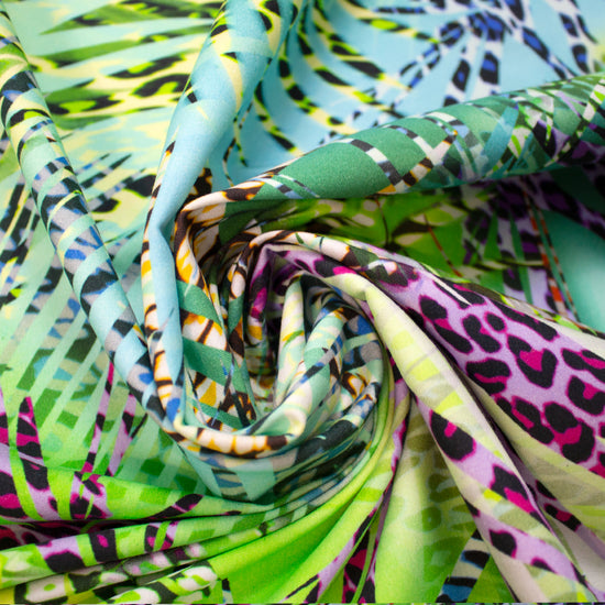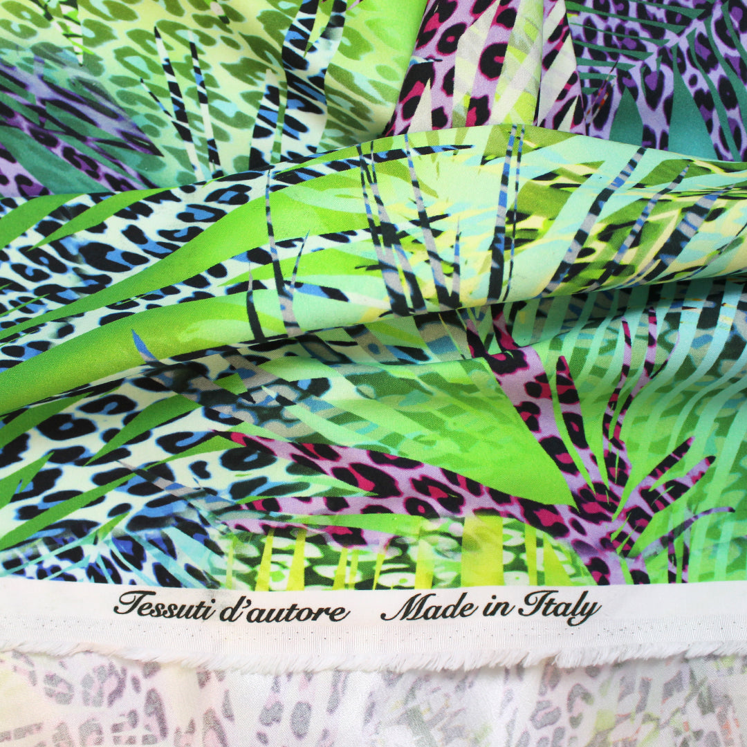 This lively print from Italy is a soft and smooth stretch cotton/viscose woven. It is opaque and medium weight with 20% stretch in the width only. The reverse side only has a satin finish, eliminating the need for lining as it is smooth and silky. There is body in the drape, and the amazing 'leopard impression' print features leaf-like shapes with a leopard pattern on an airbrush background in shades of orchid, iris, turquoise, dandelion, kiwi, spring green, black, etc. (PANTONE 15-0545, 14-1064, 17-3020, 18-3943, 15-4722, etc.) A wonderful choice for a jacket, topper coat, structured dress or skirt, stretch jeans, etc. Test first: hand or machine wash, and hang to dry.