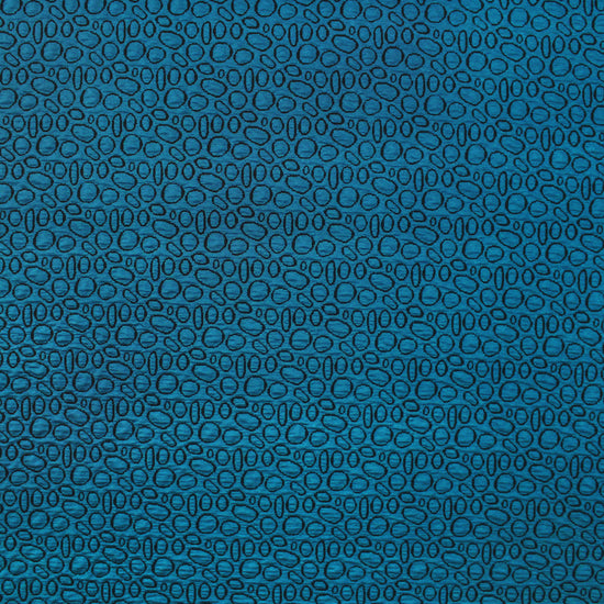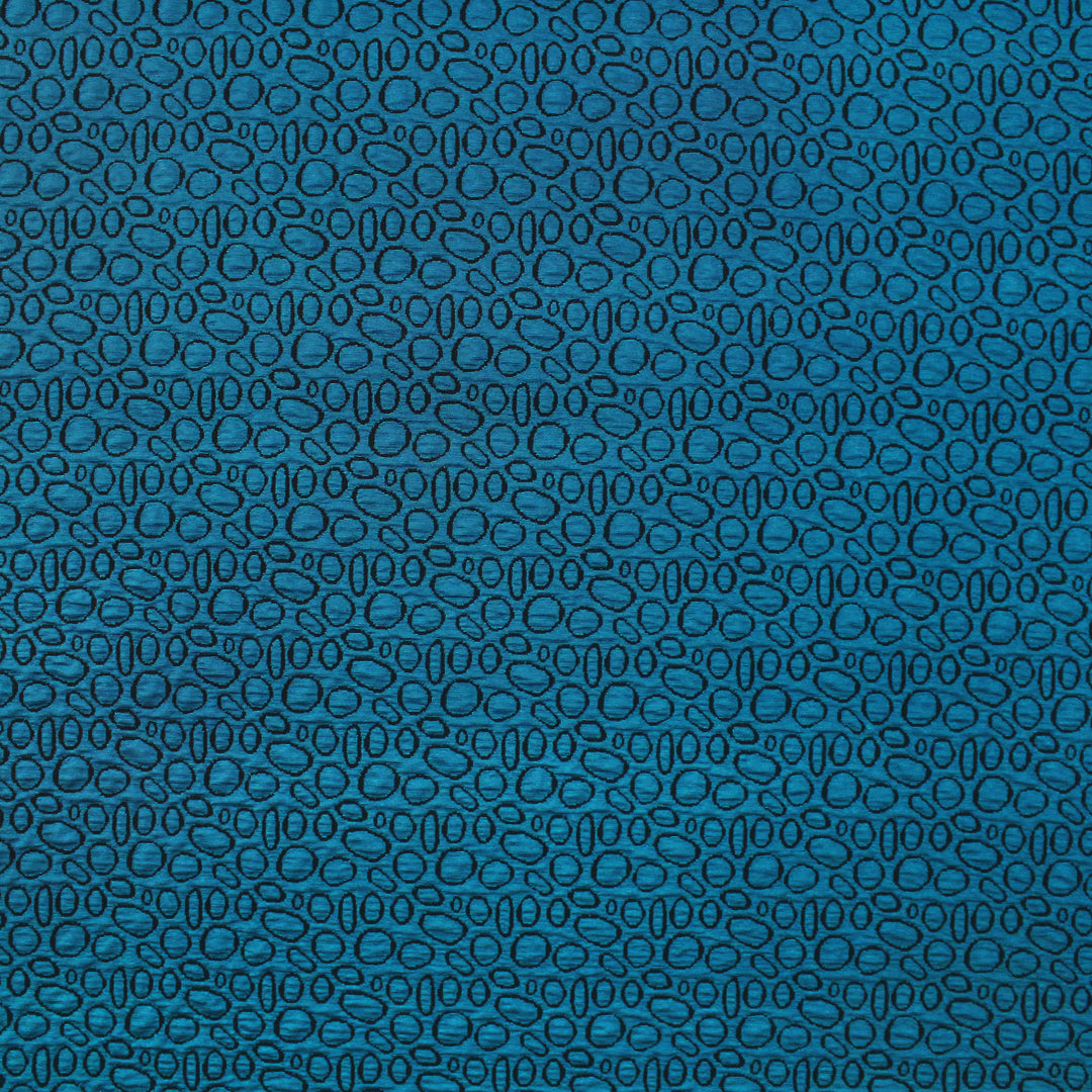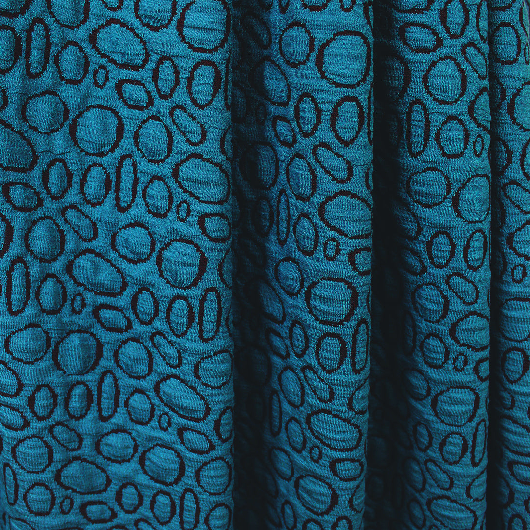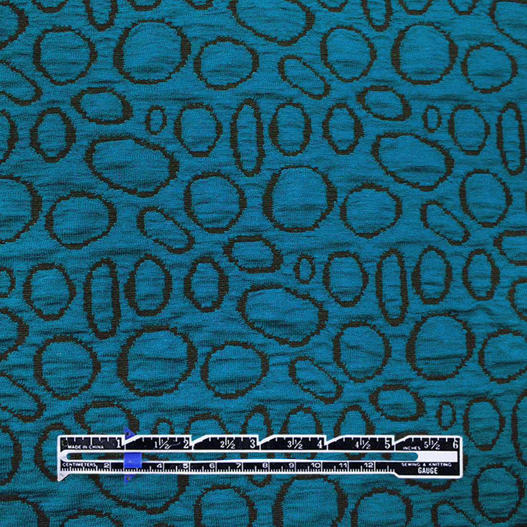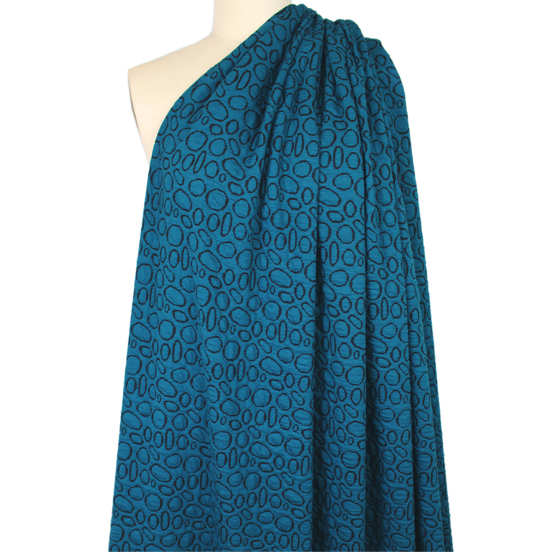 This wonderful quality yarn-dye jacquard knit is a substantial and opaque two-layer knit with a soft hand and drape with a touch of body. It has about 20% stretch in each direction with nice recovery. The ellipse pattern (8.5" repeat) is knitted in to attach the top layer and backing, causing a matelassé puckering for a delightfully interesting texture. The colors are teal and black (PANTONE 18-4833 is close, etc.), and the backing is black but not really meant to be seen. Lining is not necessary for comfort or opacity. It is perfect for a cardigan, pullover, knit dress or skirt, tunic, tee, etc. Hand wash or TEST FIRST if you wish to try machine washing. Hang or lay flat to dry.