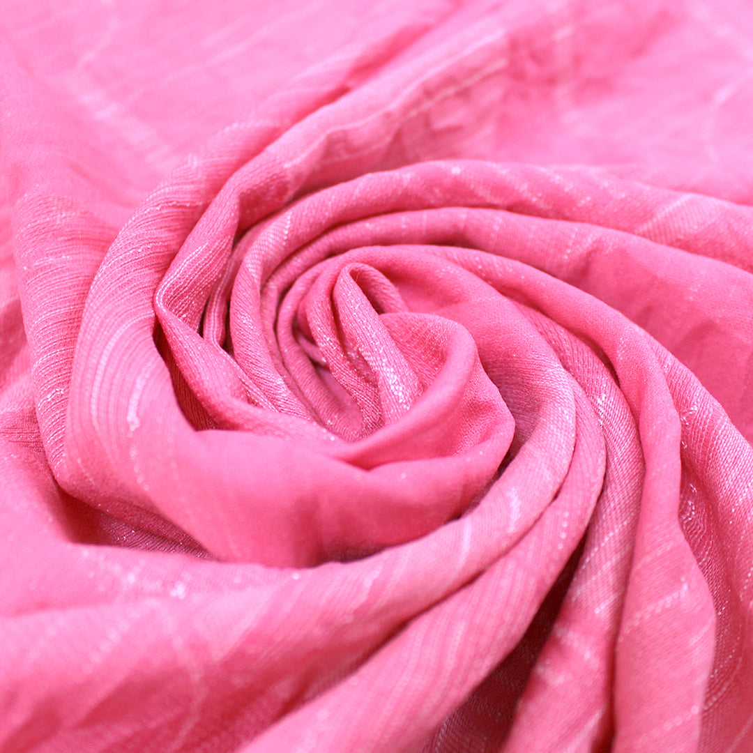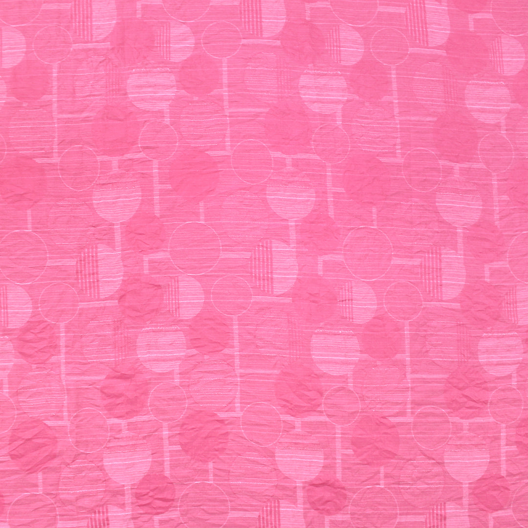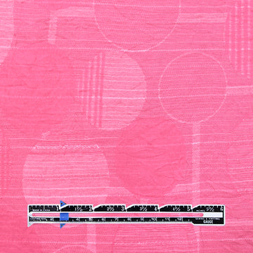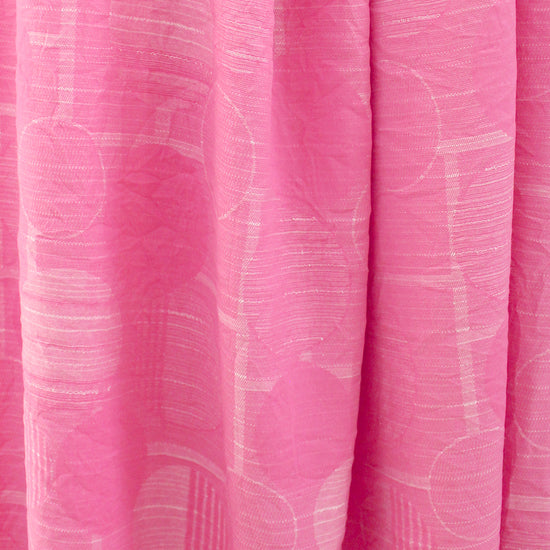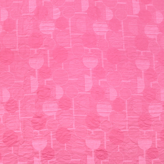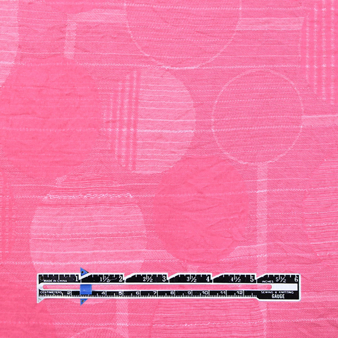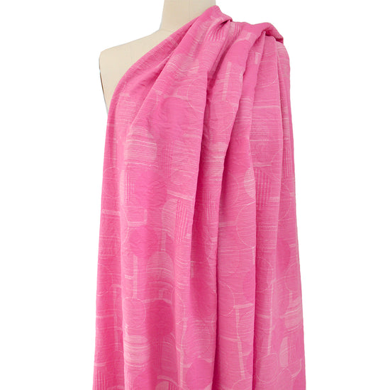 From Italian designer deadstock, this is a wonderful jacquard woven, light weight and opaque with a soft drape that has a touch of body. The 'pink Malibu' design (14.125" repeat) is woven-in with strawberry pink and shiny pearl highlights (PANTONE 16-2126 is close, 11-0701) and is perfectly on-trend! The design is inverted on the reverse side, but very similar in appearance. There is a mix of yarn types that create subtle changes in texture, making this fabric mostly flat but intriguing to the eye. Make a tailored shirt, dress, skirt, tunic, etc. Please test first: hand wash and hang to dry, or dry clean.