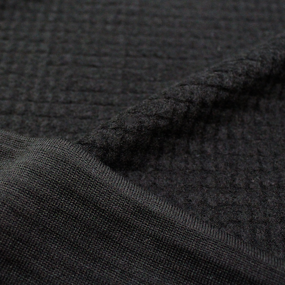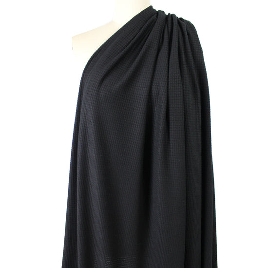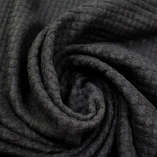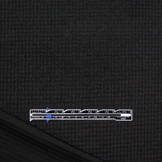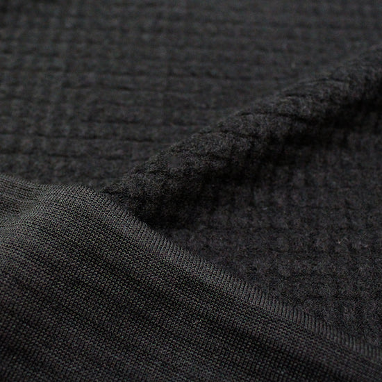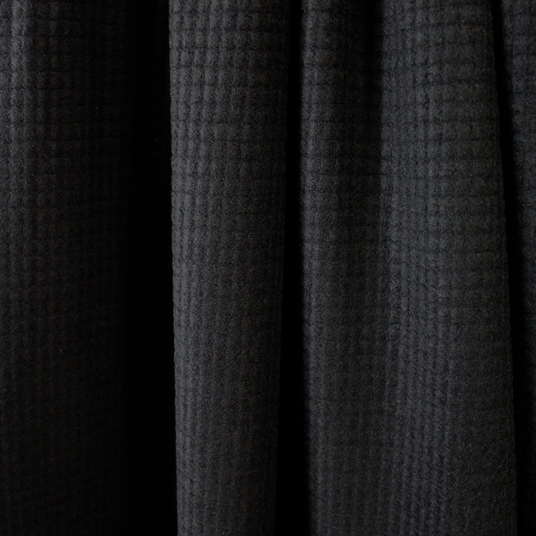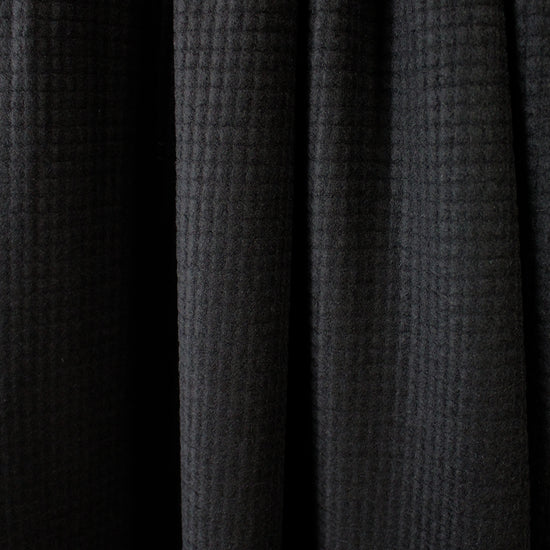From Italian designer deadstock, this amazing wool fleece has the appearance of a waffle knit, but is constructed with a grid of super soft tufted wool squares. The fleecey grid appears on the front side only, with a plain knit stitch on the back. The color is a classic black, and it is just right for a fabulous cozy cardigan, top, tunic, sweater dress, etc. It has about 20% stretch in the width, and is fairly stable in the length. It has a soft drape, and a fleecy, dimensional texture without being heavy. Treat as you would any fine sweater knit (please test first!).