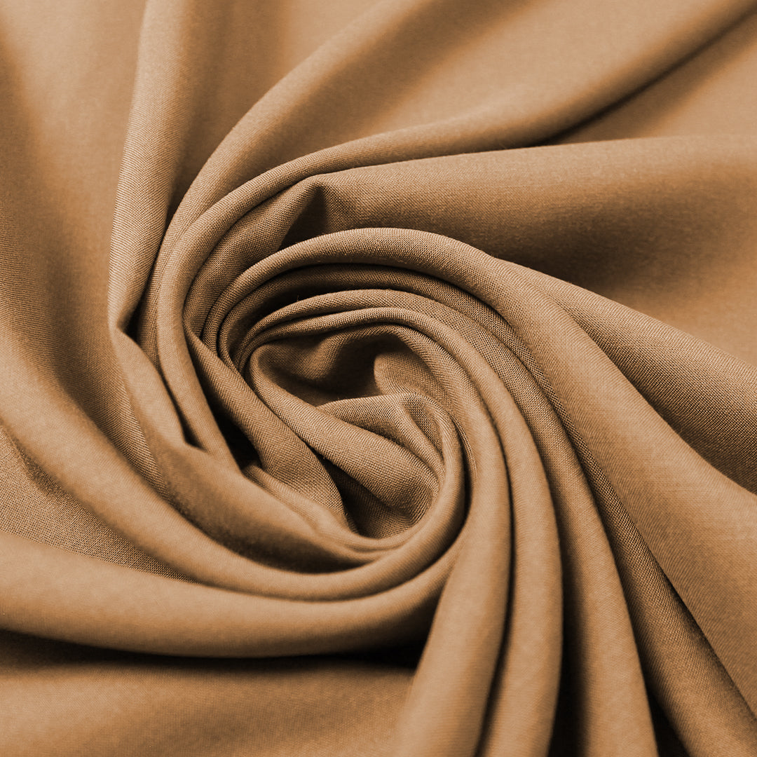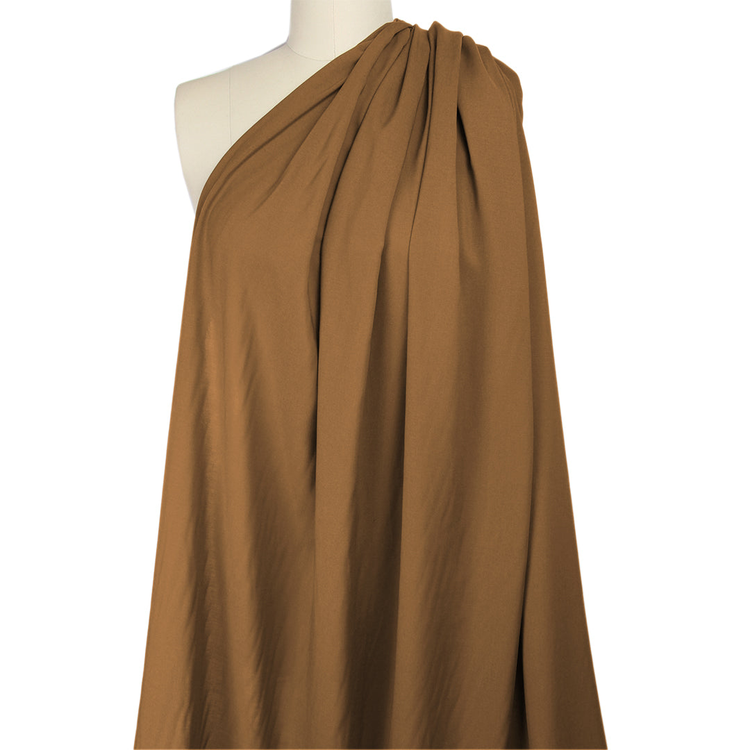 This is a fine quality viscose challis woven, a lightweight beauty that is semi-opaque with a flowing, soft drape. The color is a lovely cinnamon (PANTONE 17-1044). It is perfect for blouses, tunics, tops, etc. Dry clean or hand wash, and hang to dry (please test first).