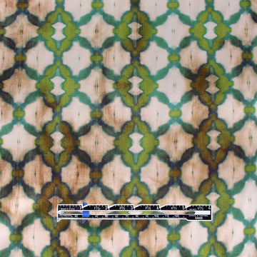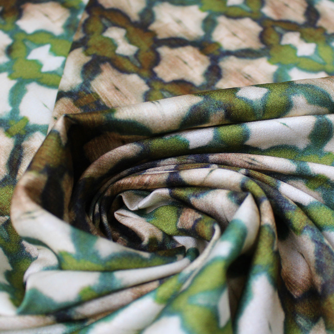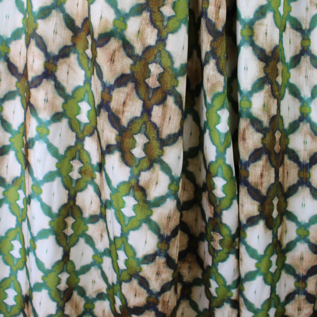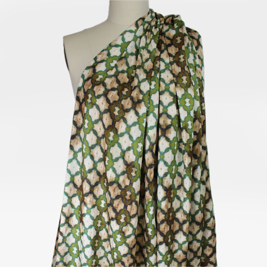 This is a fine quality printed satin viscose woven, a light blouseweight that is opaque with a flowing, soft drape. The wonderful 'batiky lattice' print (23" repeat) features chestnut, moss green, muted emerald green, parchment, and a bit of indigo around the edges (PANTONE 13-1106, 17-1328, 16-0532, 18-1033, 18-6114, etc.). It has a slight satiny sheen (like silk) and no stretch. It is perfect for blouses, tunics, tops, dresses, skirts, etc! Dry clean or hand wash, and hang to dry (please test first).