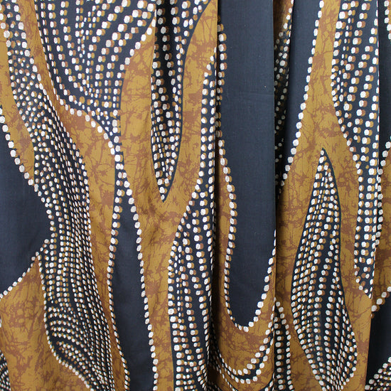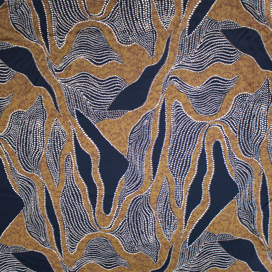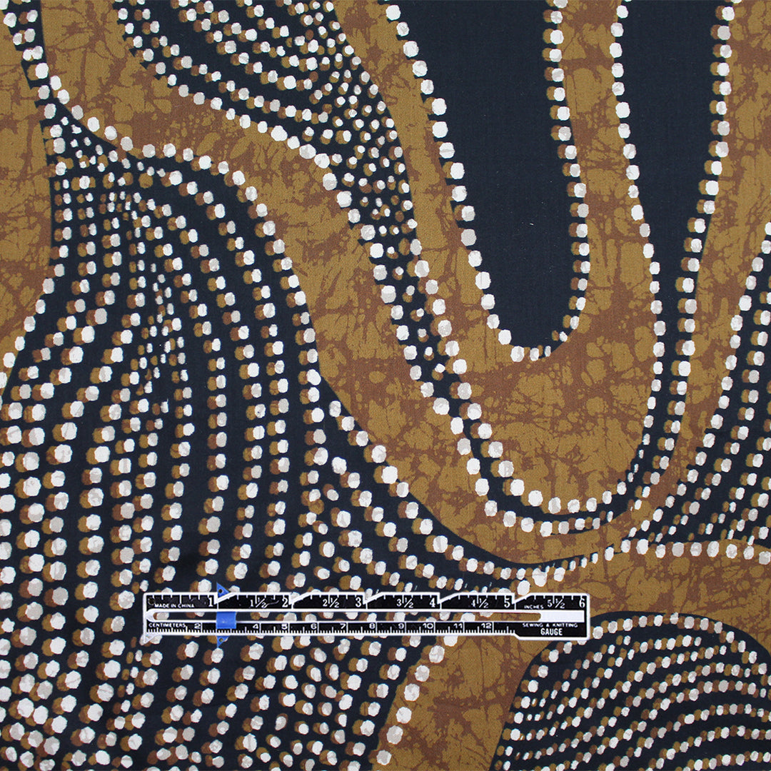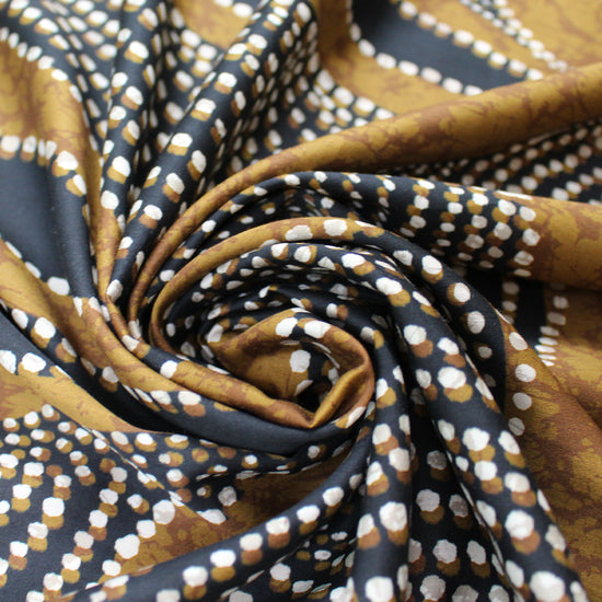 From designer deadstock and made in France, this is a gorgeous quality, all cotton shirting weight woven, stable in both directions and nearly opaque. It has a cottony drape with a little crispness, and is lightweight, soft and smooth. The "drifting clay" print features nubuck, golden brown, cloudy white and black, with some shadings of taupey light gray in the white dots (PANTONE 18-1048, 18-0940, etc.). Perfect for a shirt, top, tunic, skirt, dress, etc. Hand or machine wash gentle, and hang to dry (please test first).