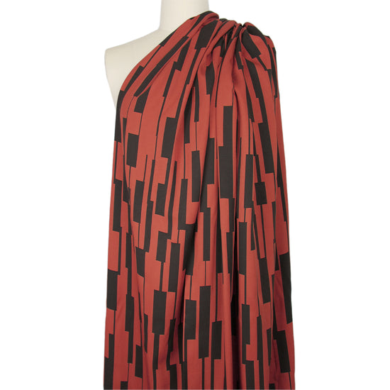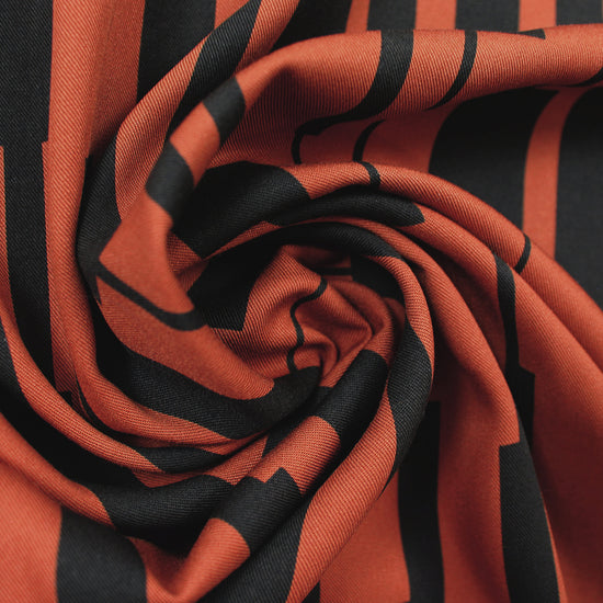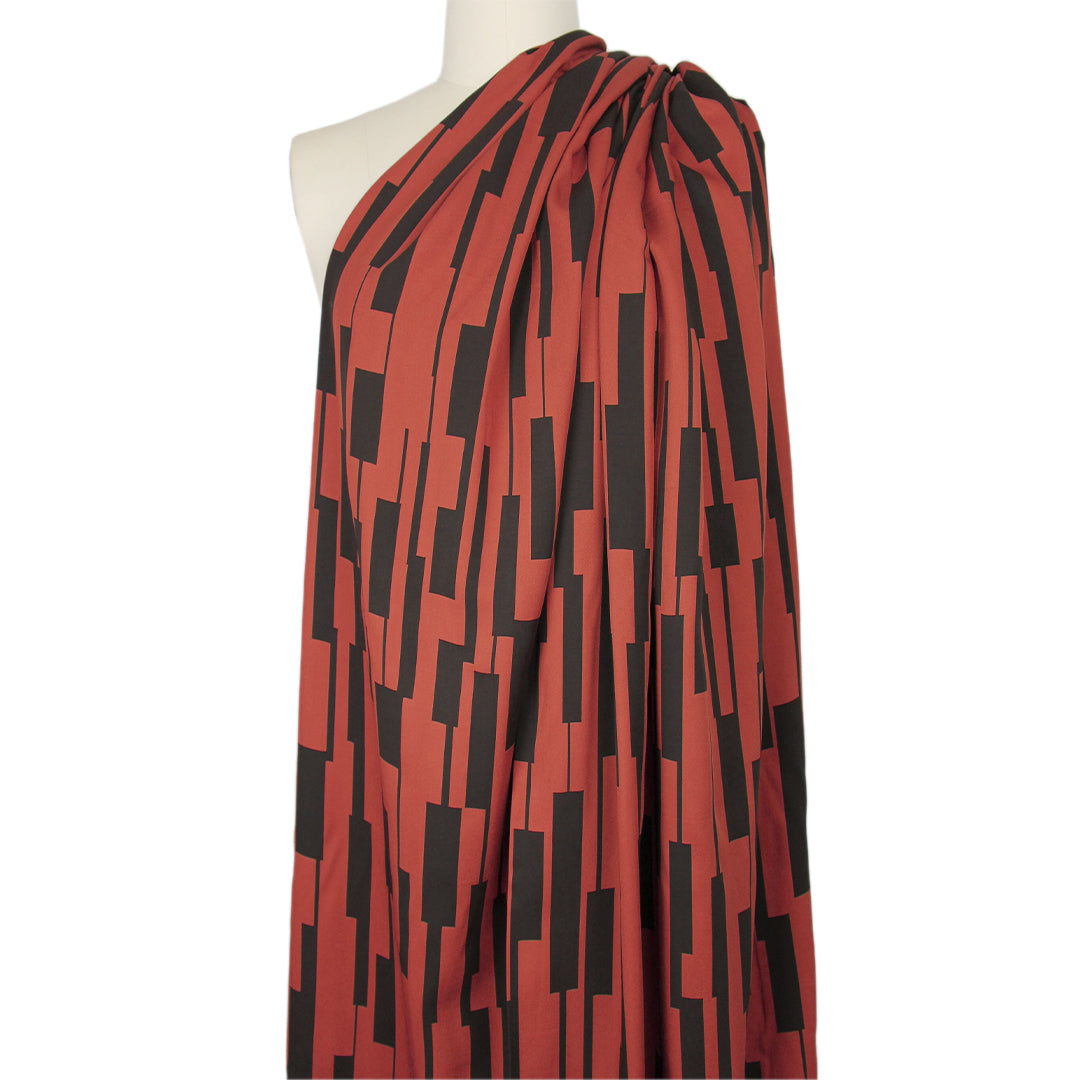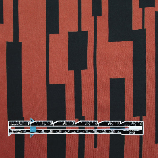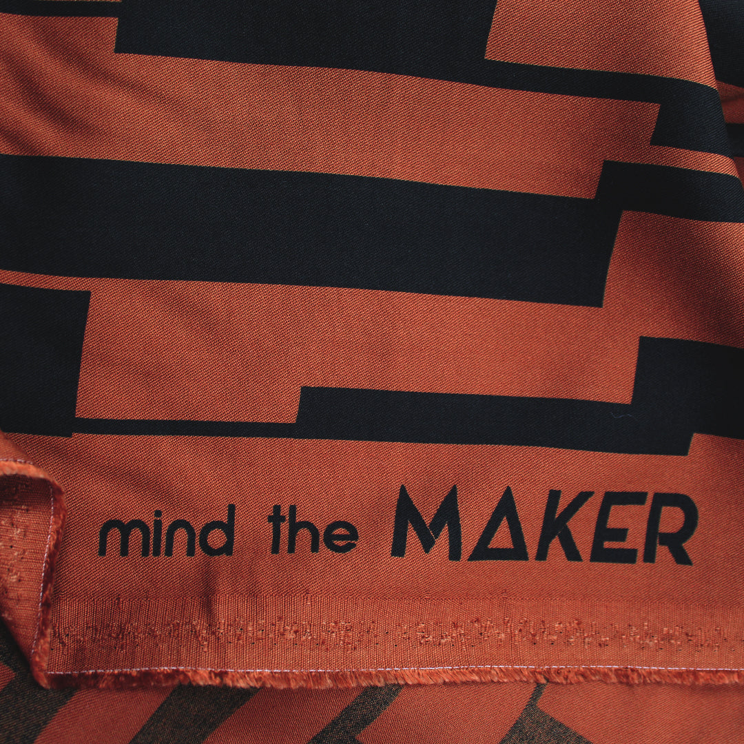 This amazing fabric from Mind the Maker has quite the resume! It is Oeko-Tex certified and woven from 100% LENZING™ ECOVERO™ viscose. This lightweight (yet with substance) and drapey viscose twill has a fabulous and very current "un-square" print (24" vertical repeat) which features a linear graphic in black on a sienna background (PANTONE 19-1245 but lighter). It is opaque with lovely drape, and is perfect for a shirt, blouse, tunic, top, dress, skirt, etc! Hand wash, hang to dry (please test first), or dry clean. EcoVero is a viscose fabric made from sustainably sourced, renewable resources and the end product is completely biodegradable. The overall environmental impact is so low that it has been awarded the prestigious EU Ecolabel. EcoVero performs exceptionally well for everyday wear as it is very soft, comfortable, breathable and durable with a lovely drape and resistance to wrinkling. It is great for sportswear as the cellulose fibers regulate moisture and stay cool. A wonderful choice for your professional wardrobe as well, as this fabric retains vivid color, does not pill and can mimic silk. Versatile, comfortable and easy to wear, EcoVero is an exciting development in eco-friendly fashion.