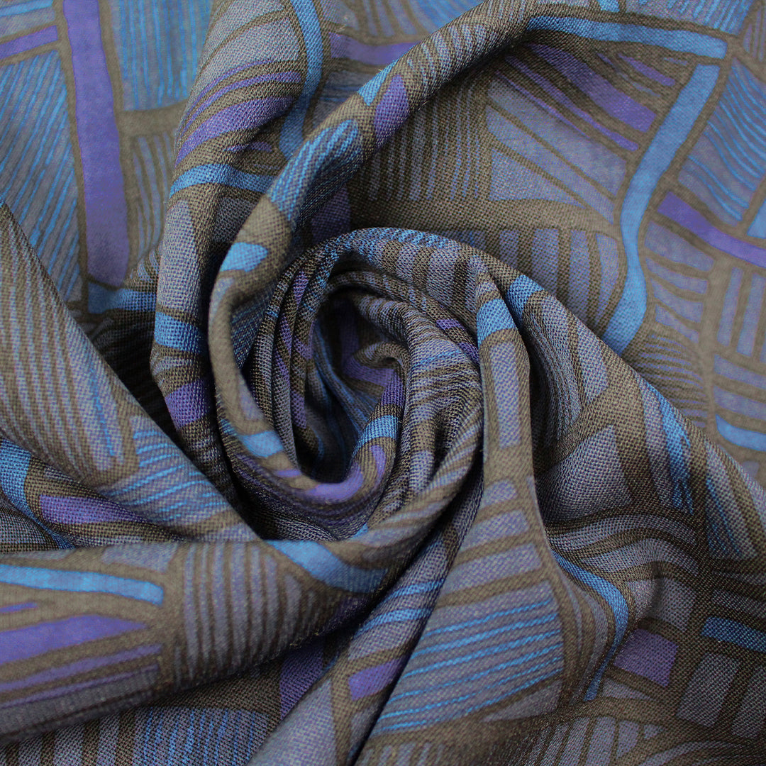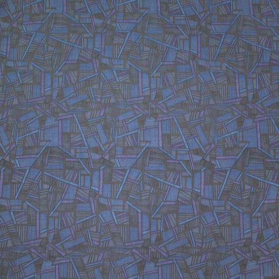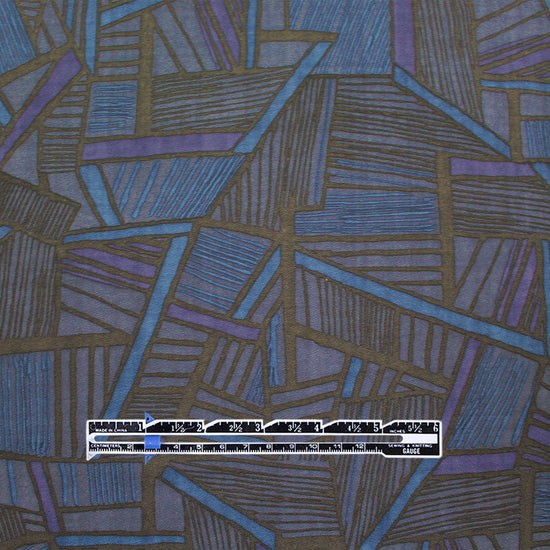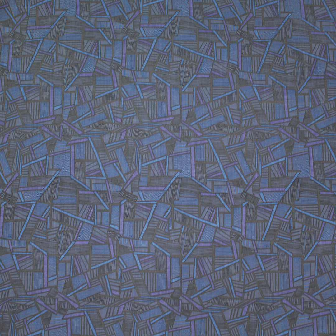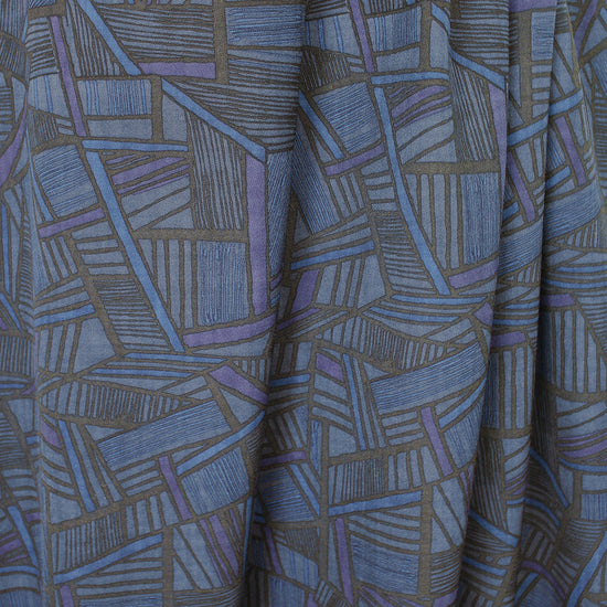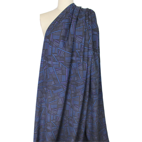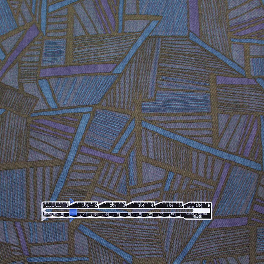 From Italian designer deadstock, this is a dress/suiting weight all-wool woven, with a very refined and smooth micro-pique texture (not at all "wooly"). It is opaque with a matte finish and no stretch, and there is some body in the drape. Over-printed with a wonderful "geometric nocturne" design (18.25" repeat) in a subdued palette of dusky navy, violet, sea blue and black (PANTONE 19-3908, 19-3730, 18-4032, etc.). Best for a sheath dress, tunic, skirt, jacket, pants, etc. Dry clean or treat as you would any fine wool fabric.