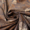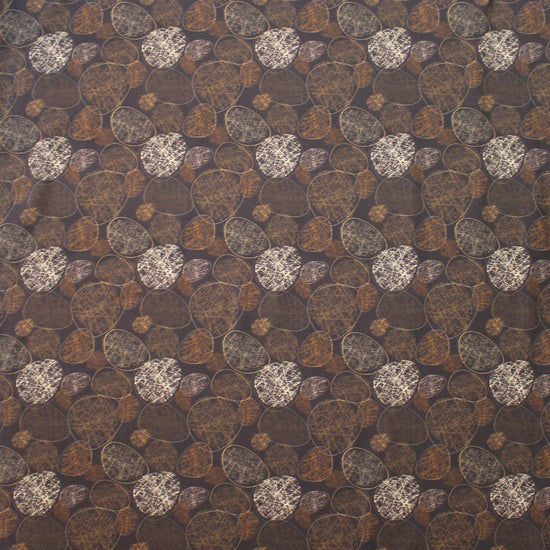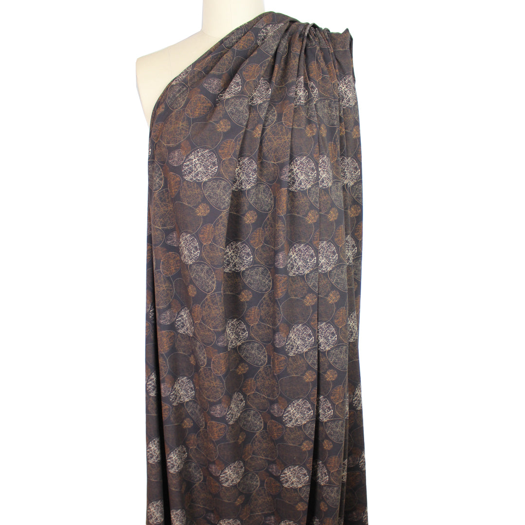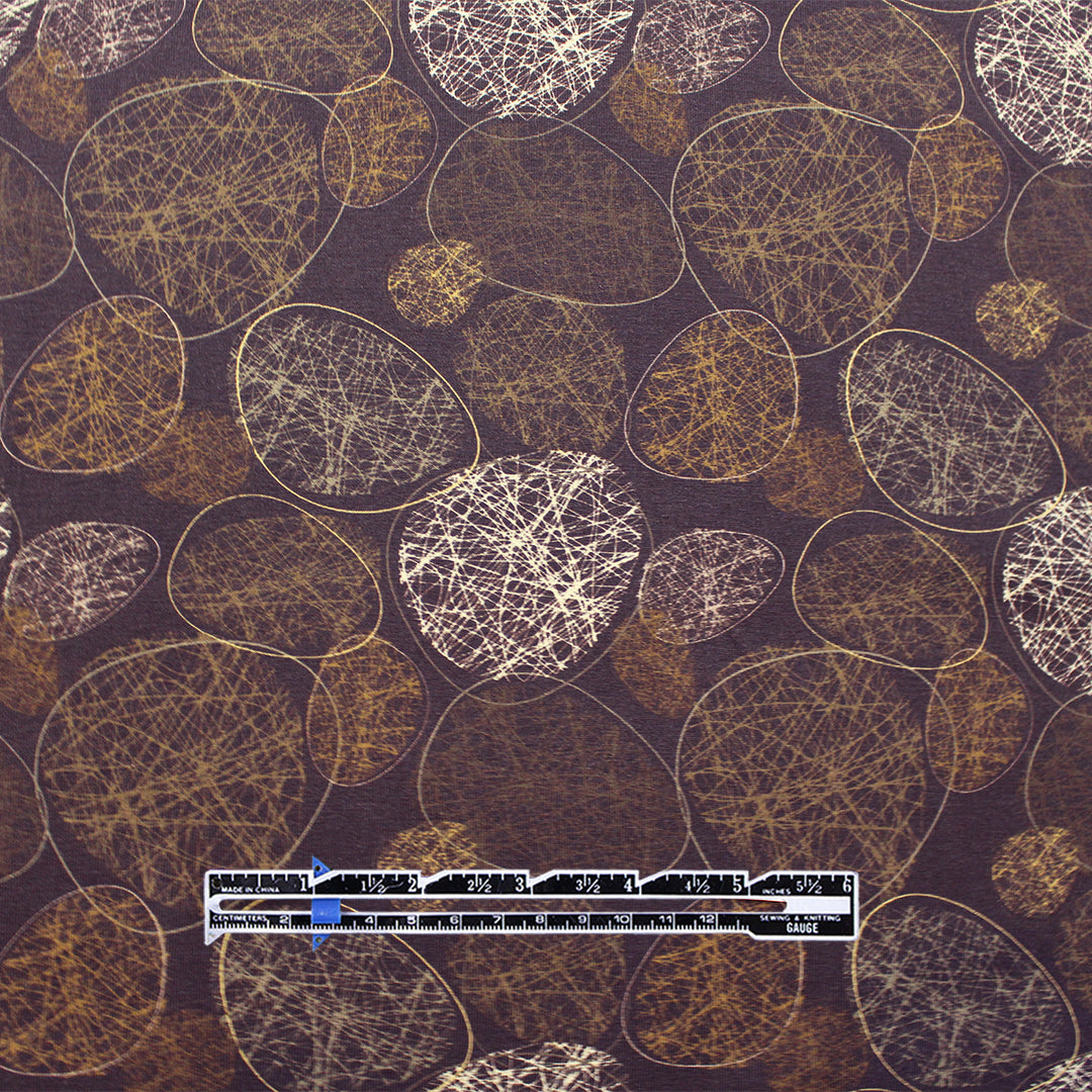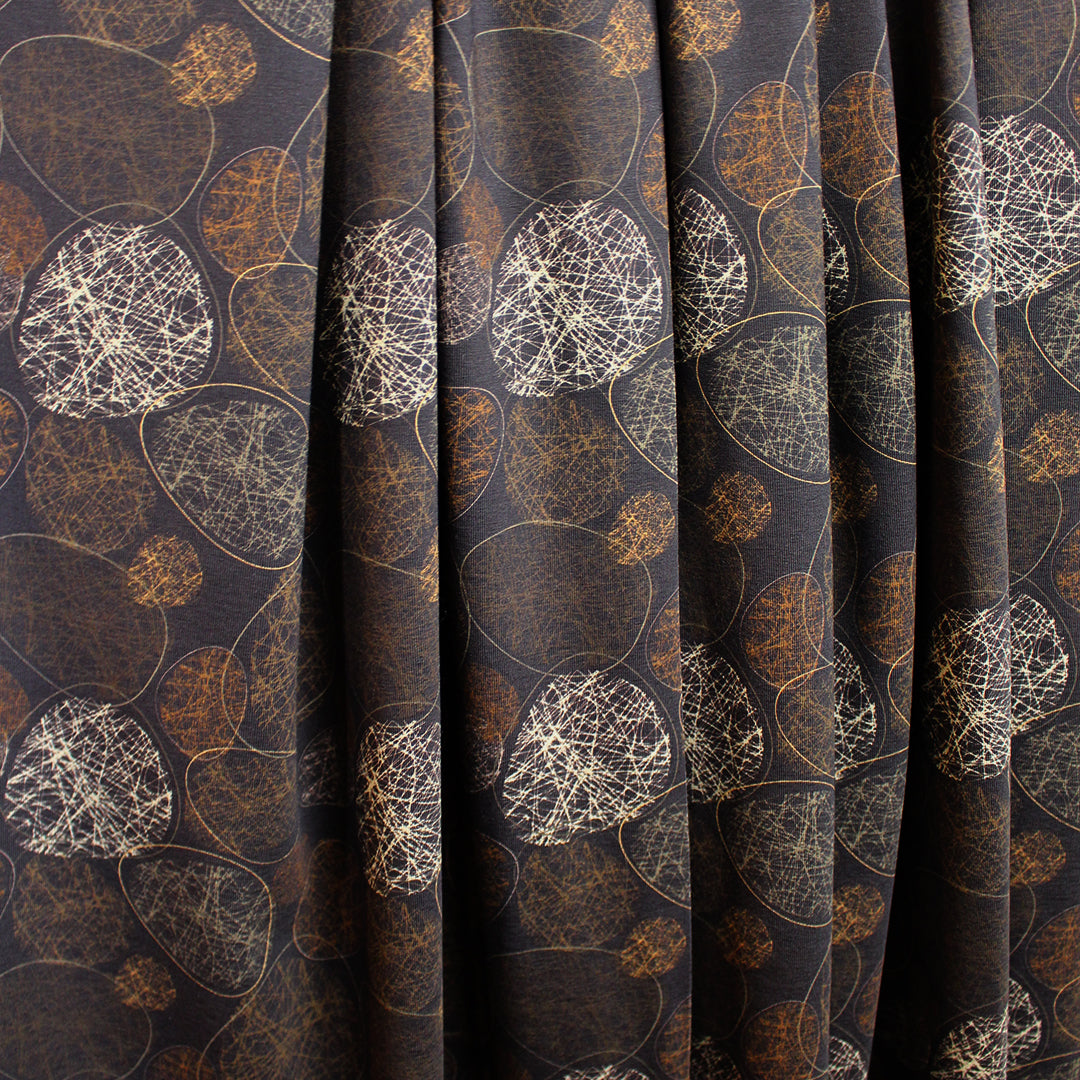 This wonderful cotton/spandex print is imported from The Netherlands, and the quality of the fabric is sublime. The digitally printed "etched stones" design has a 5.125" repeat, featuring off-white, chestnut, caramel, etc. on a deep walnut background (PANTONE 19-1314 is close, 15-0927, 17-1022, etc.). Soft and substantial, it has about 50% stretch in both directions, and is opaque with a bit of body in the drape. It is Oeko-Tex certified for non-toxic chemicals and dyes. Make a great tee, top, dress, tunic, dress or skirt, leggings, etc. The manufacturer recommends hand or machine wash warm, hang to dry. Please test first.