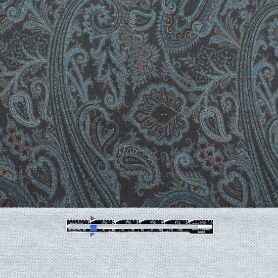 From famous designer deadstock and made in Italy, this is a wonderful quality cotton athleisure doubleknit with a printed flat knit stitch on the face and a textured knit with flat looping on the reverse. The beautiful 'blue paisley' print (16.5" repeat) features dark navy, lagoon (tealy) blue, light gray, black, etc. and the reverse is silvery gray (PANTONE 19-4125, 19-3908, 16-0806, 13-4302, etc.). It is medium weight and opaque with body in the drape, and about 20% stretch in the width only. It has a soft texture and the reverse can be used as contrast or stay hidden. Perfect for an upscale hoodie, casual sweatshirt-style jacket, tunic, sweater dress, skirt, etc. Test first: hand or machine wash gentle, and hang to dry. .875 yds.