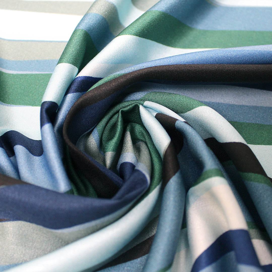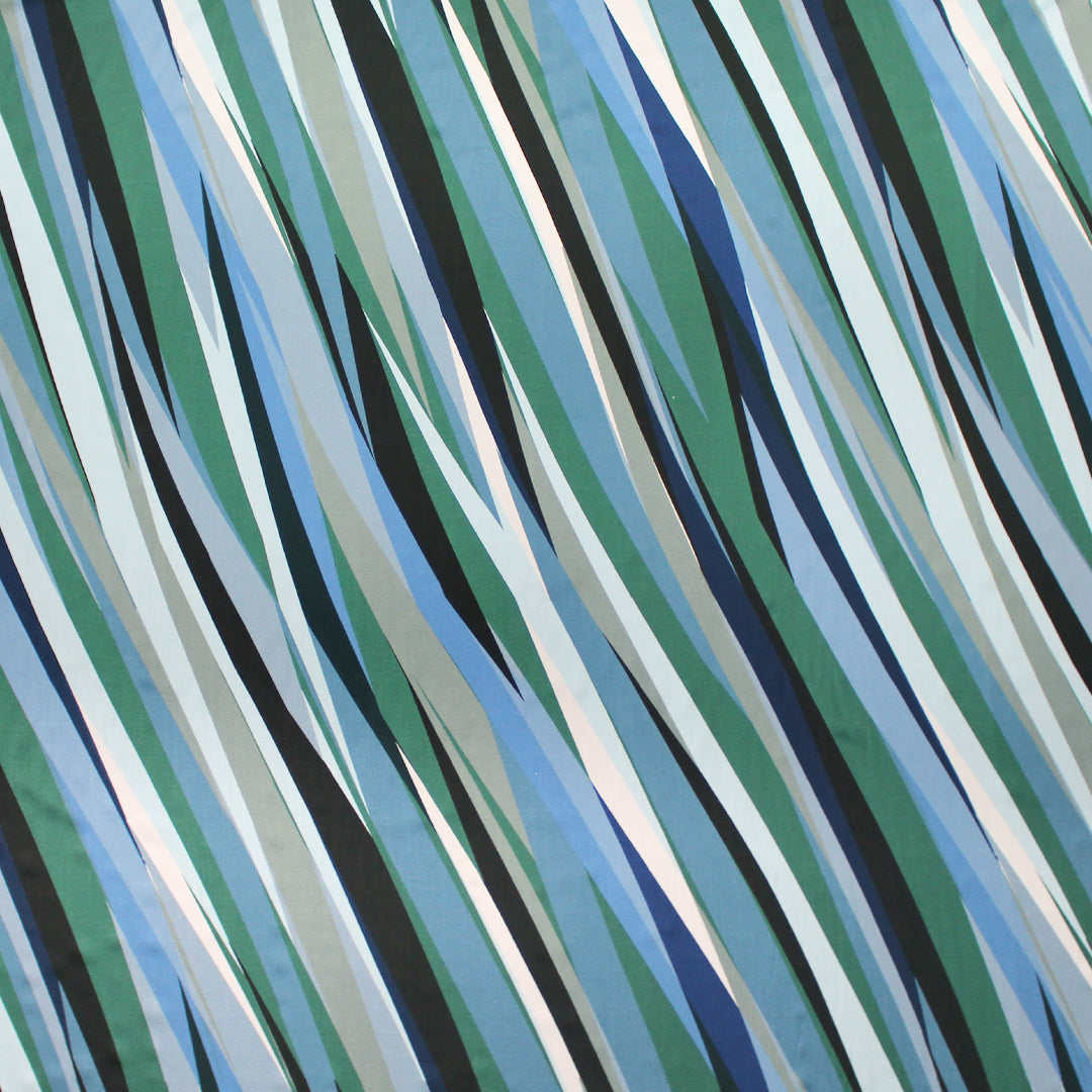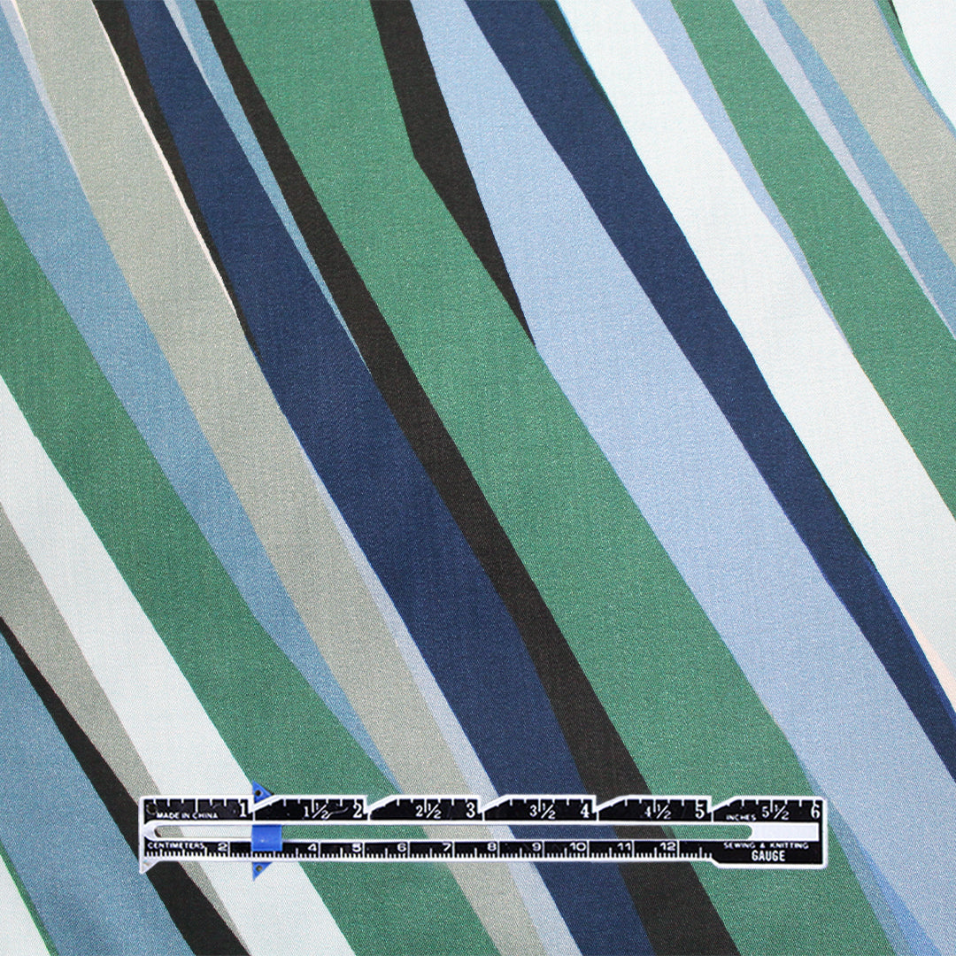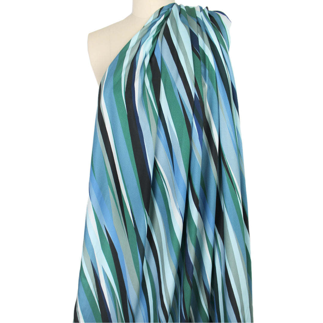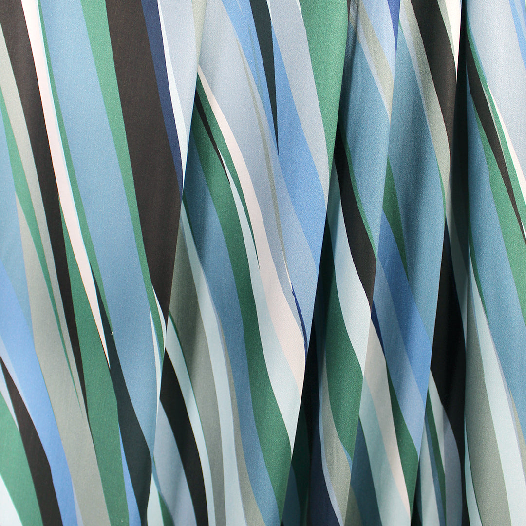 From Italy, this is a beautiful viscose satin woven with a lustrous and smooth surface finish, using a new and more sustainable iteration of viscose called Ecovero. This beauty is light weight and just about opaque with a floaty, soft drape. The 'waterway' print (24" repeat) features ribbons of light denim blue, deep sea green, slate green, light sky blue, cloud blue, black, etc. (PANTONE 16-4127 but darker, 17-5513, 16-5804, 12-4304, etc.). It is perfect for a shirt, blouse, tunic, top, lined dress or skirt, etc. It would also make a lovely lining for a tailored jacket or coat. Hand wash, hang to dry (please test first), or dry clean. EcoVero is a viscose fabric made from sustainably sourced, renewable resources and the end product is completely biodegradable. The overall environmental impact is so low that it has been awarded the prestigious EU Ecolabel. EcoVero performs exceptionally well for everyday wear as it is very soft, comfortable, breathable and durable with a lovely drape. A wonderful choice for your professional wardrobe as well, as this fabric retains vivid color, does not pill and can mimic silk. EcoVero is an exciting development in eco-friendly fashion.