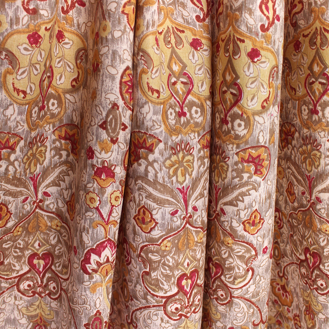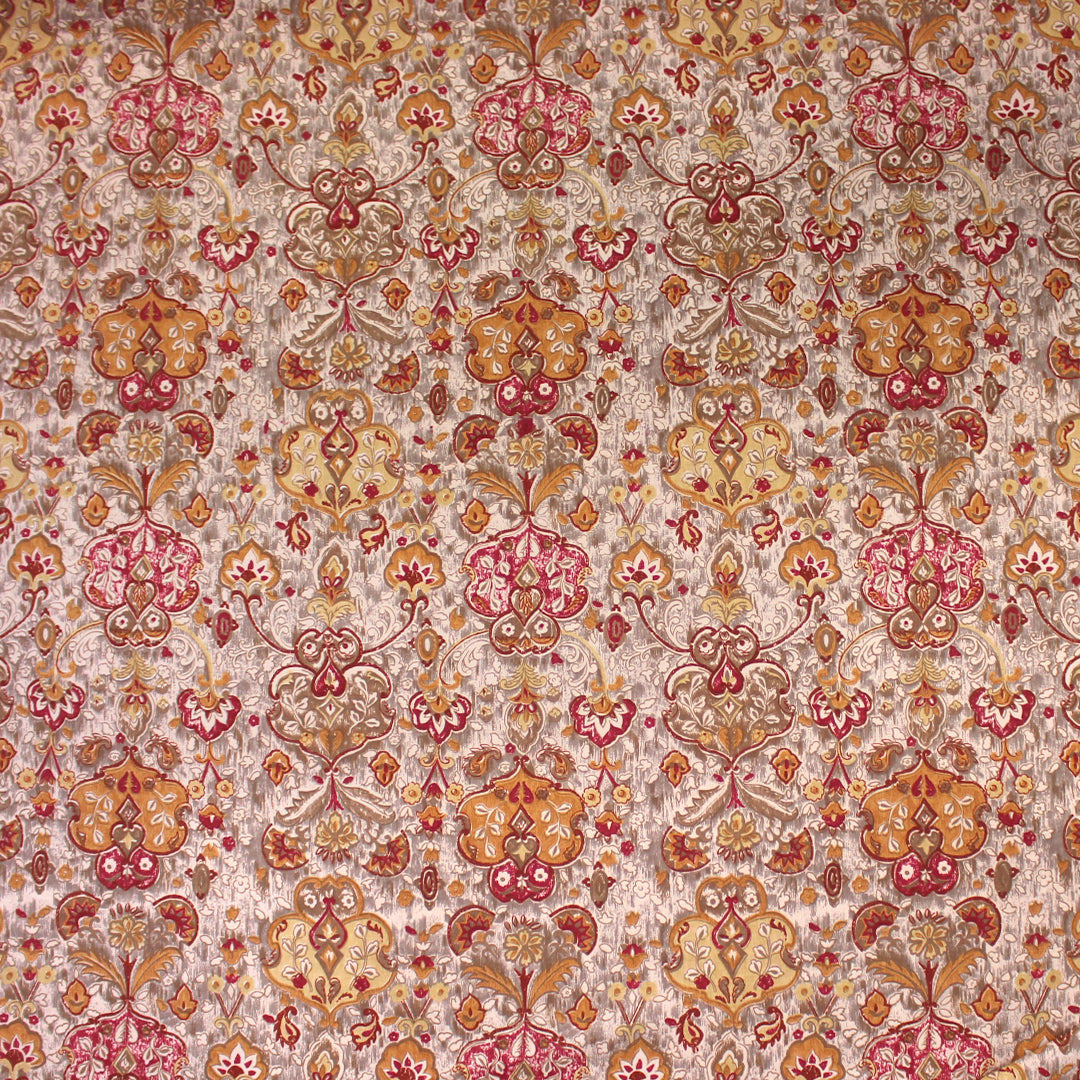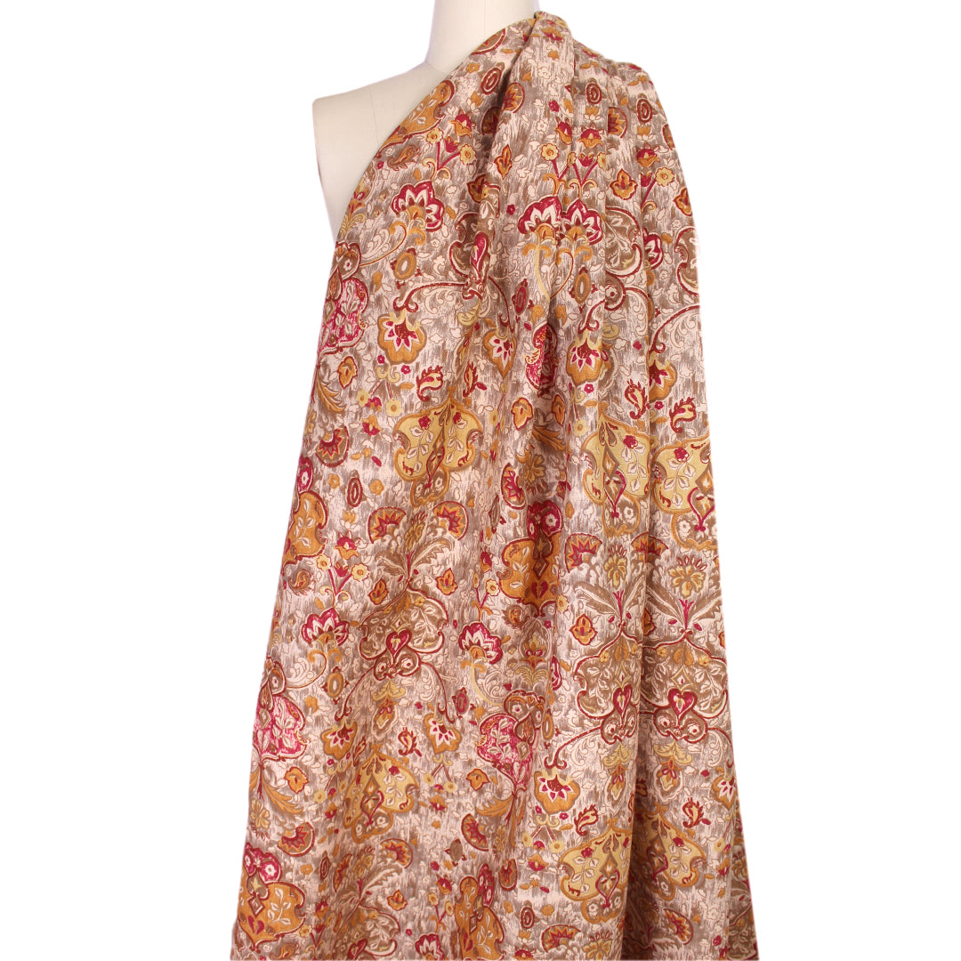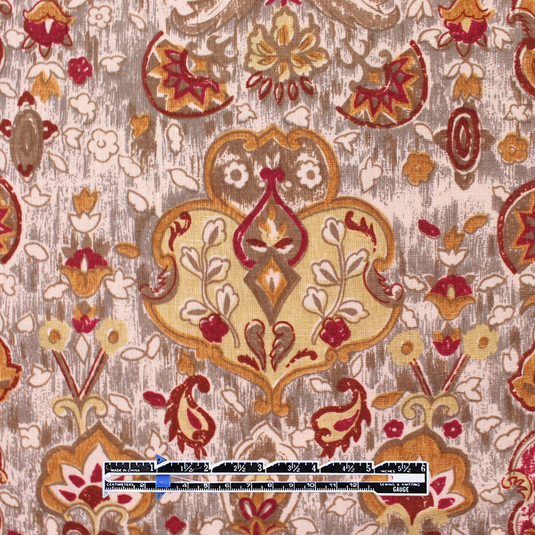 From designer deadstock, this is a beautiful printed medium-weight linen that has lovely drape with body. The "Damask scroll" design (17.25" repeat) is printed in henna, butterscotch, raspberry, taupe, etc. on a rosy putty background (PANTONE 12-0807, 19-1664, 18-1434, 16-1150, etc). The weight is very versatile, suitable for a skirt, dress, overshirt, tunic, etc. Dry cleaning recommended, but we've put many similar linen prints in the washer and dryer and they come out just fine (please test first).