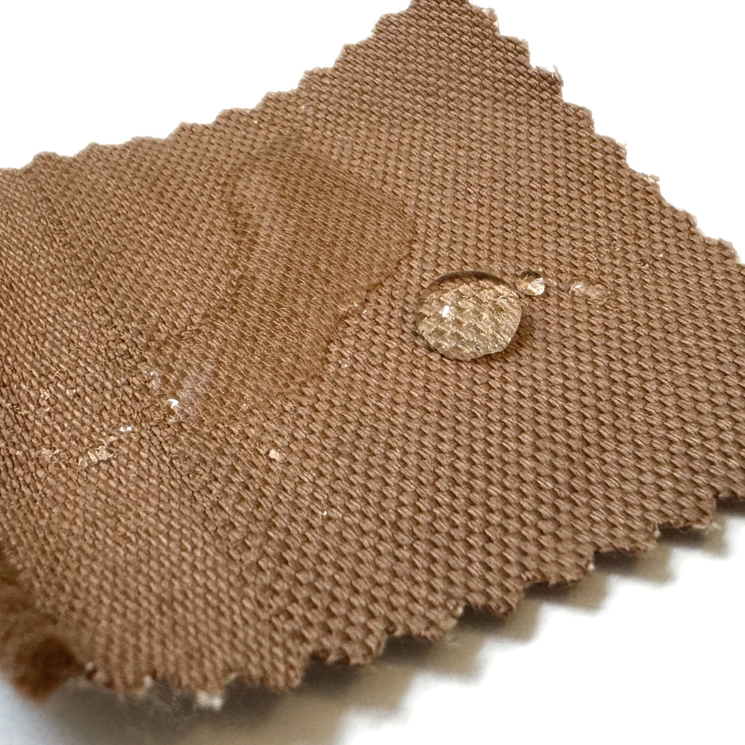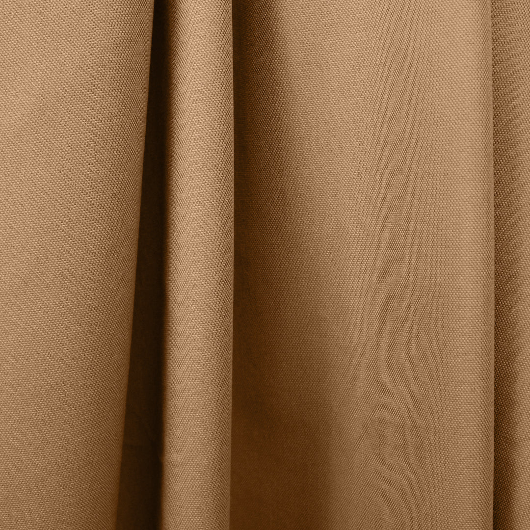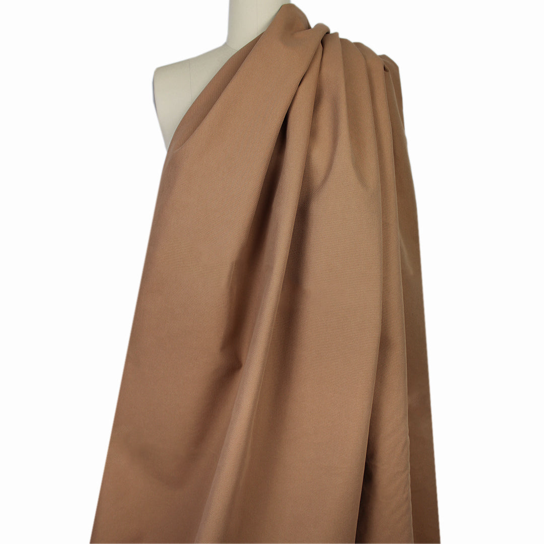 From French designer deadstock, this is a gorgeous quality water resistant cotton rainwear, a crisp yet malleable medium-weight woven in a camel color (PANTONE 17-1226). It feels fairly flat and smooth, though the matte pique-like weave lends a wonderful visual texture which looks the same on both sides. It is water-resistant and suitable for outerwear though it is not fully waterproof. A perfect choice for a lined or unlined jacket, trench coat, raincoat, etc. Test first if you wish to machine wash and hang to dry.